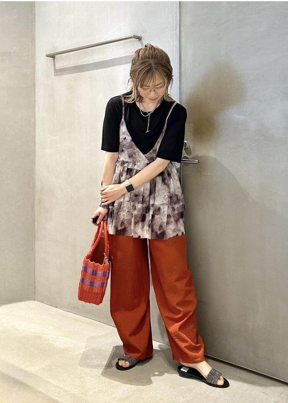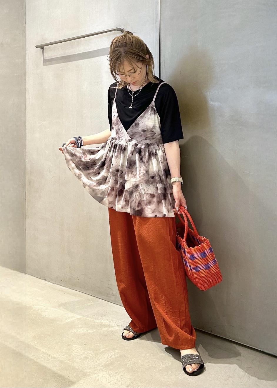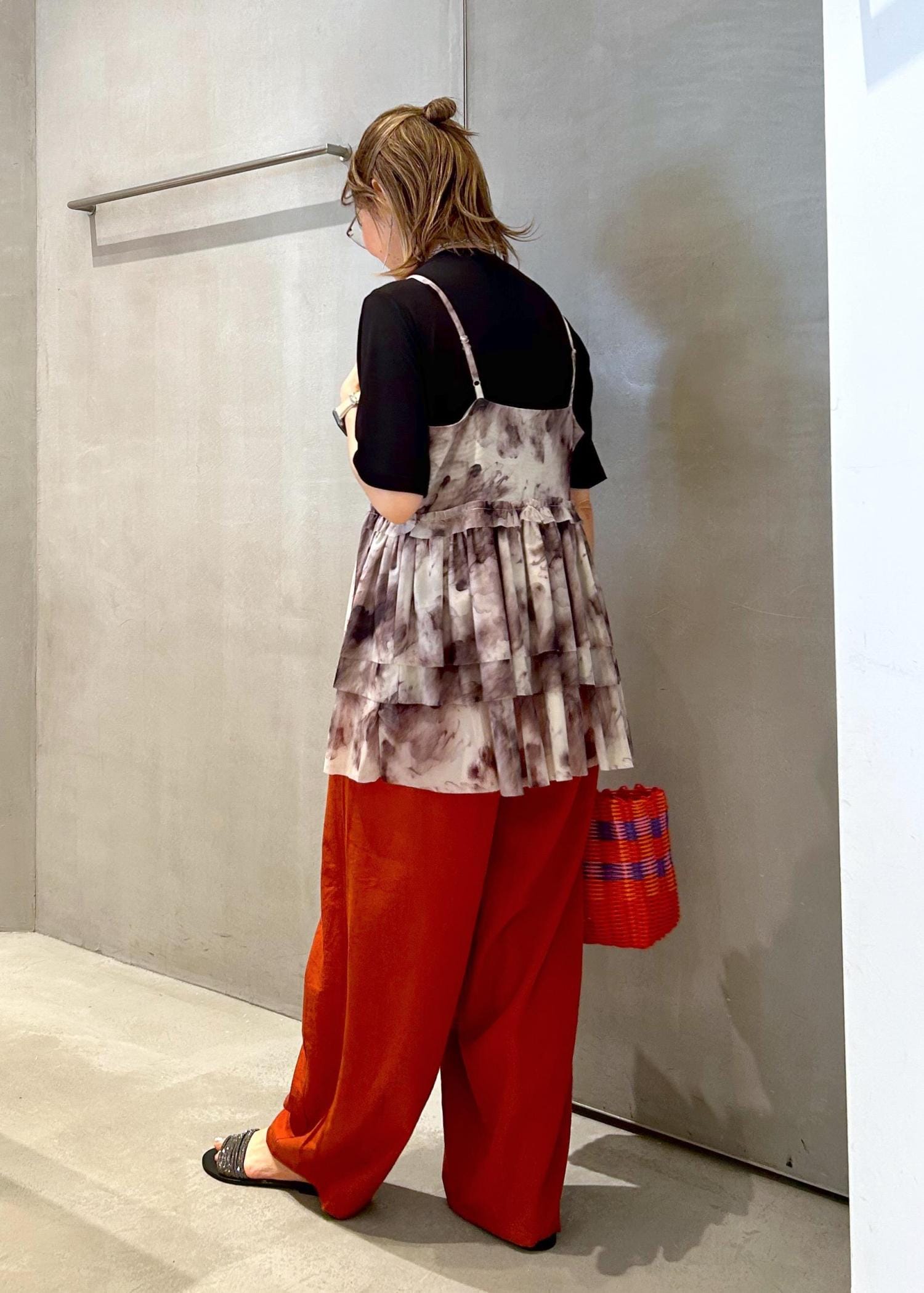 絞り染めのようなタイダイ柄は全体のアクセントになり、柔らかく落ち感のあるティアードキャミソールが体系カバーをしてくれます。
