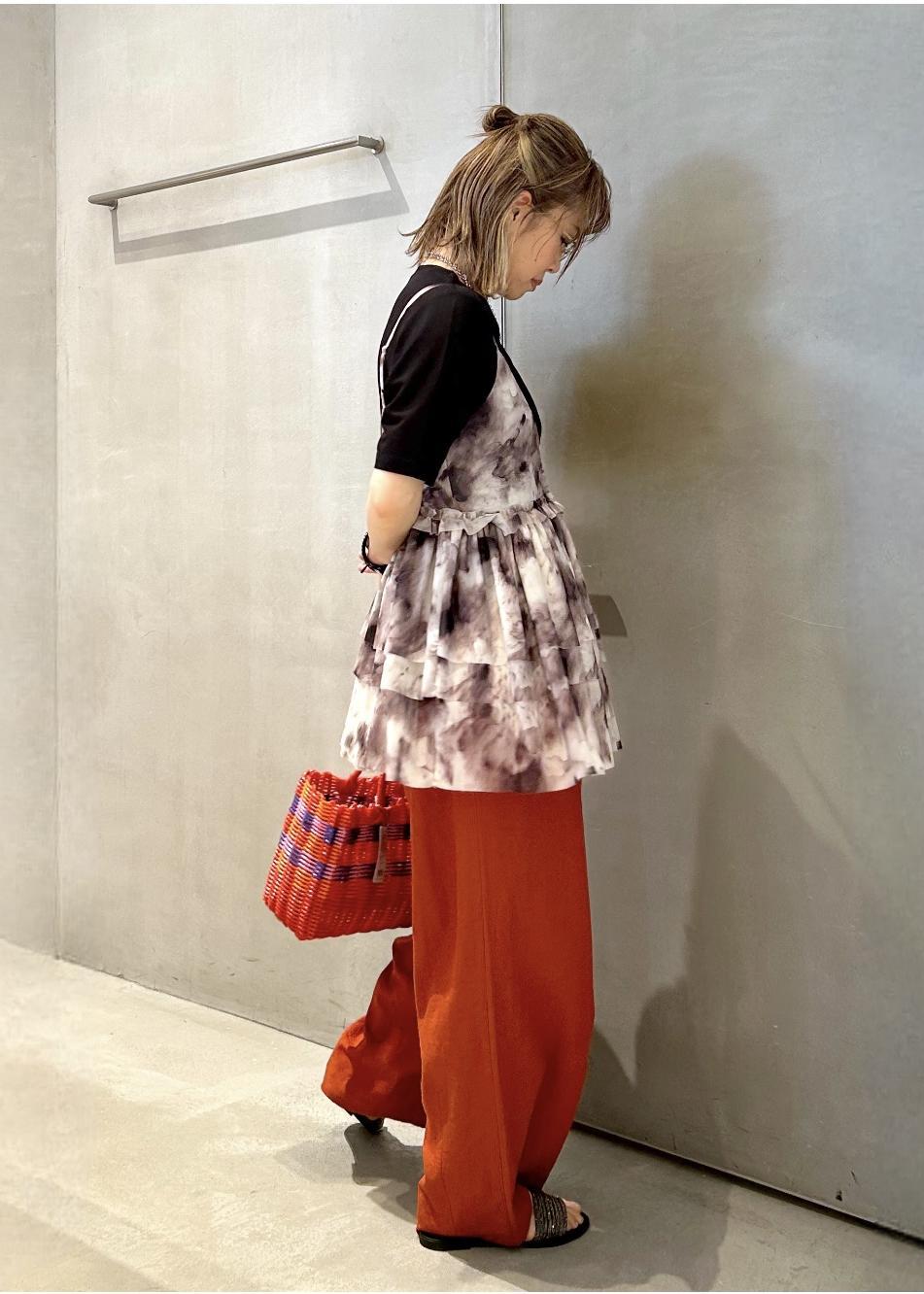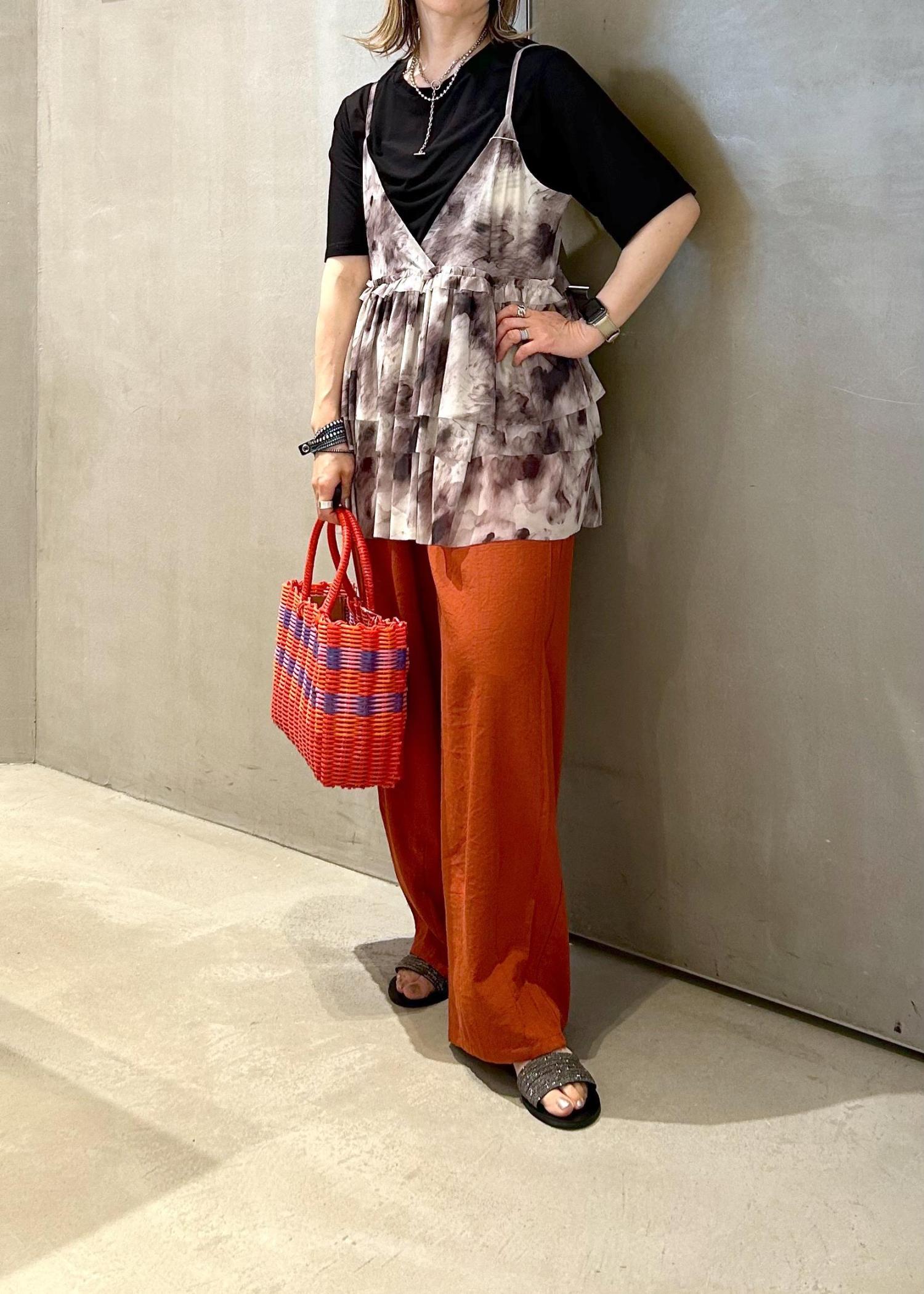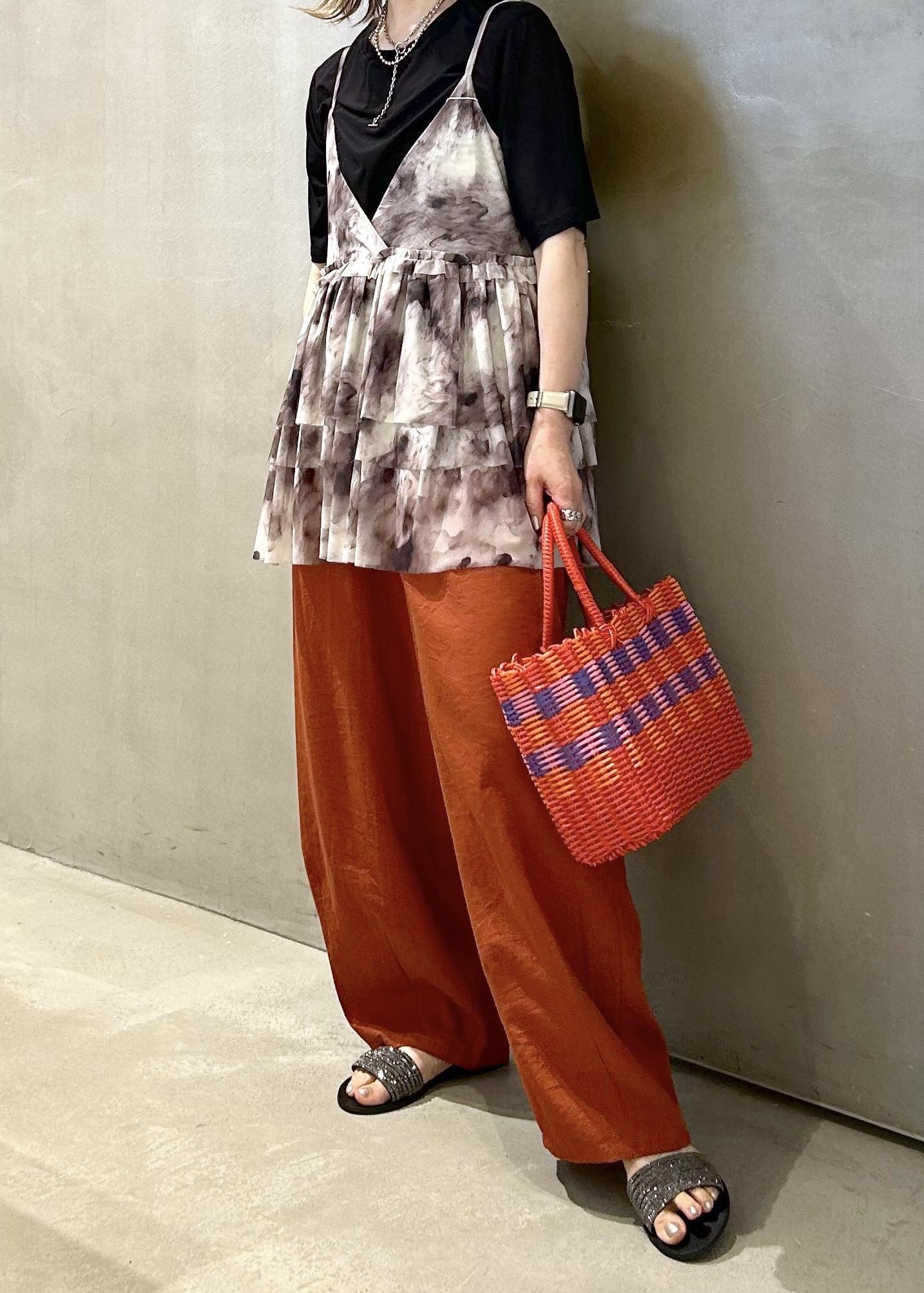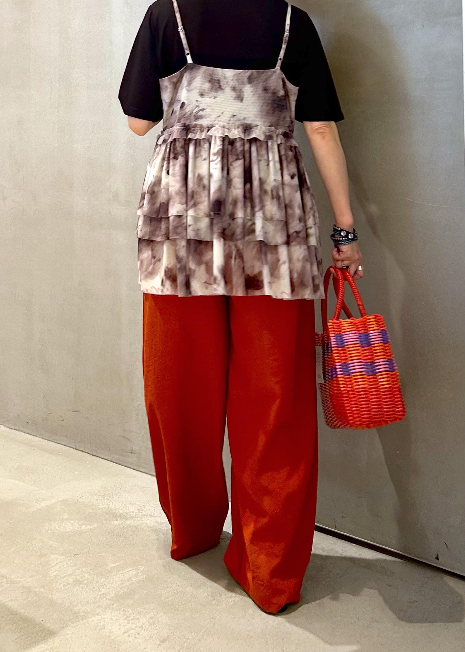 絞り染めのようなタイダイ柄は全体のアクセントになり、柔らかく落ち感のあるティアードキャミソールが体系カバーをしてくれます。