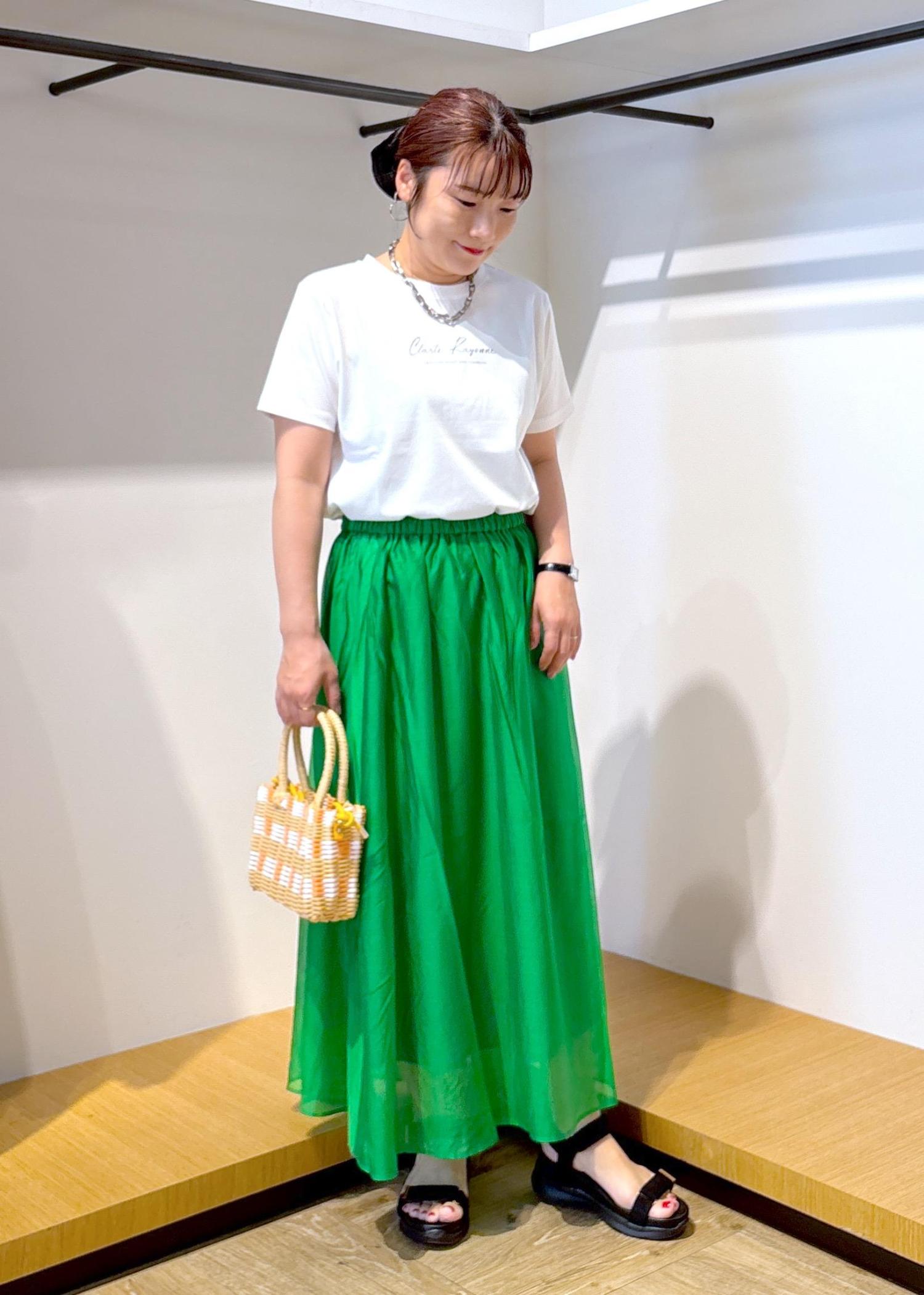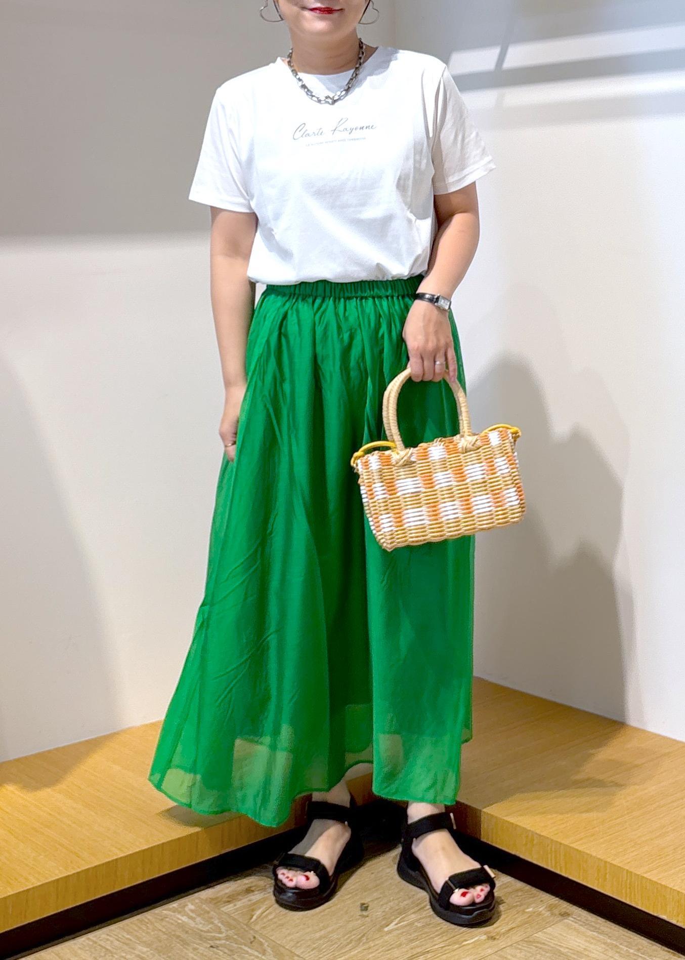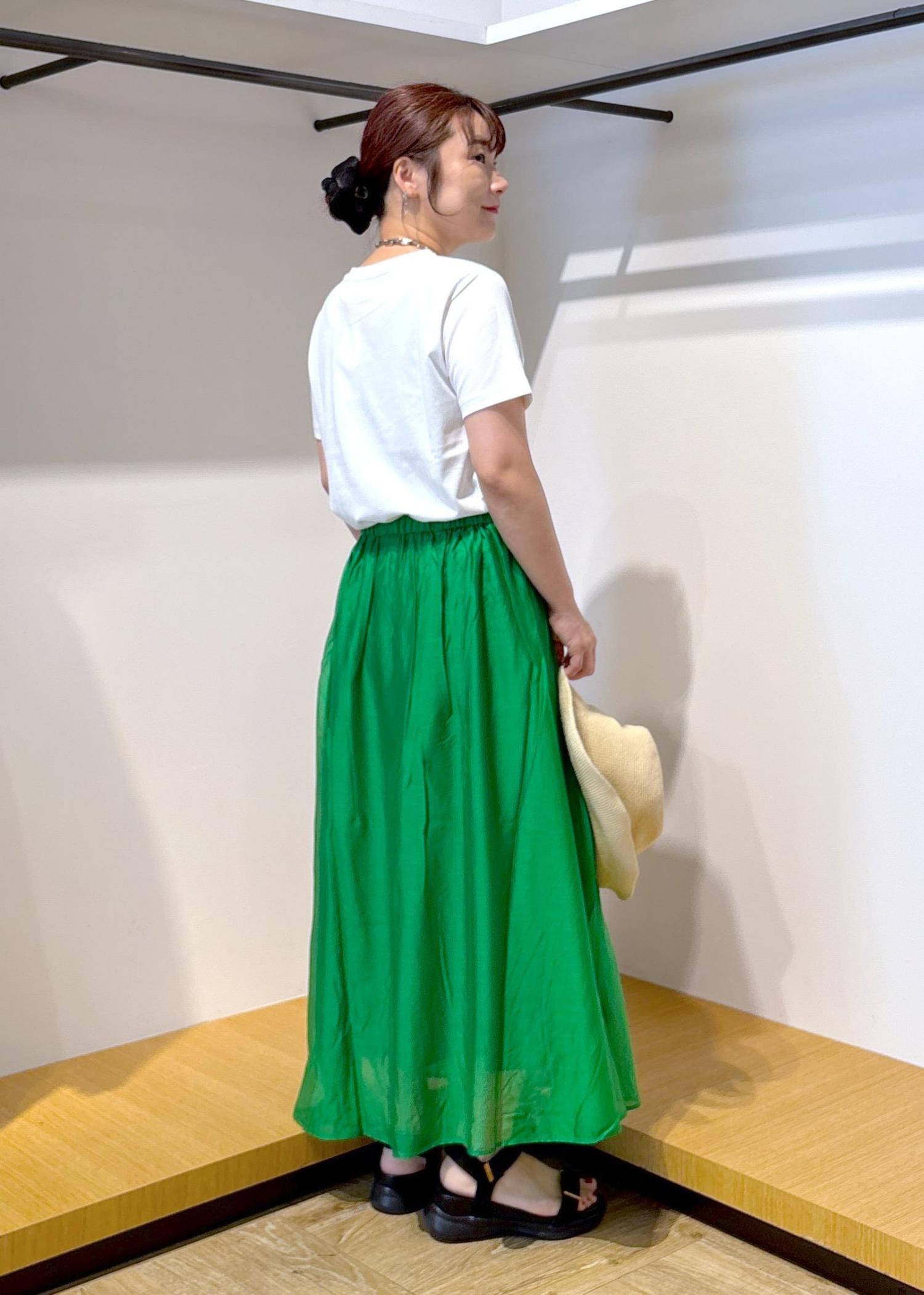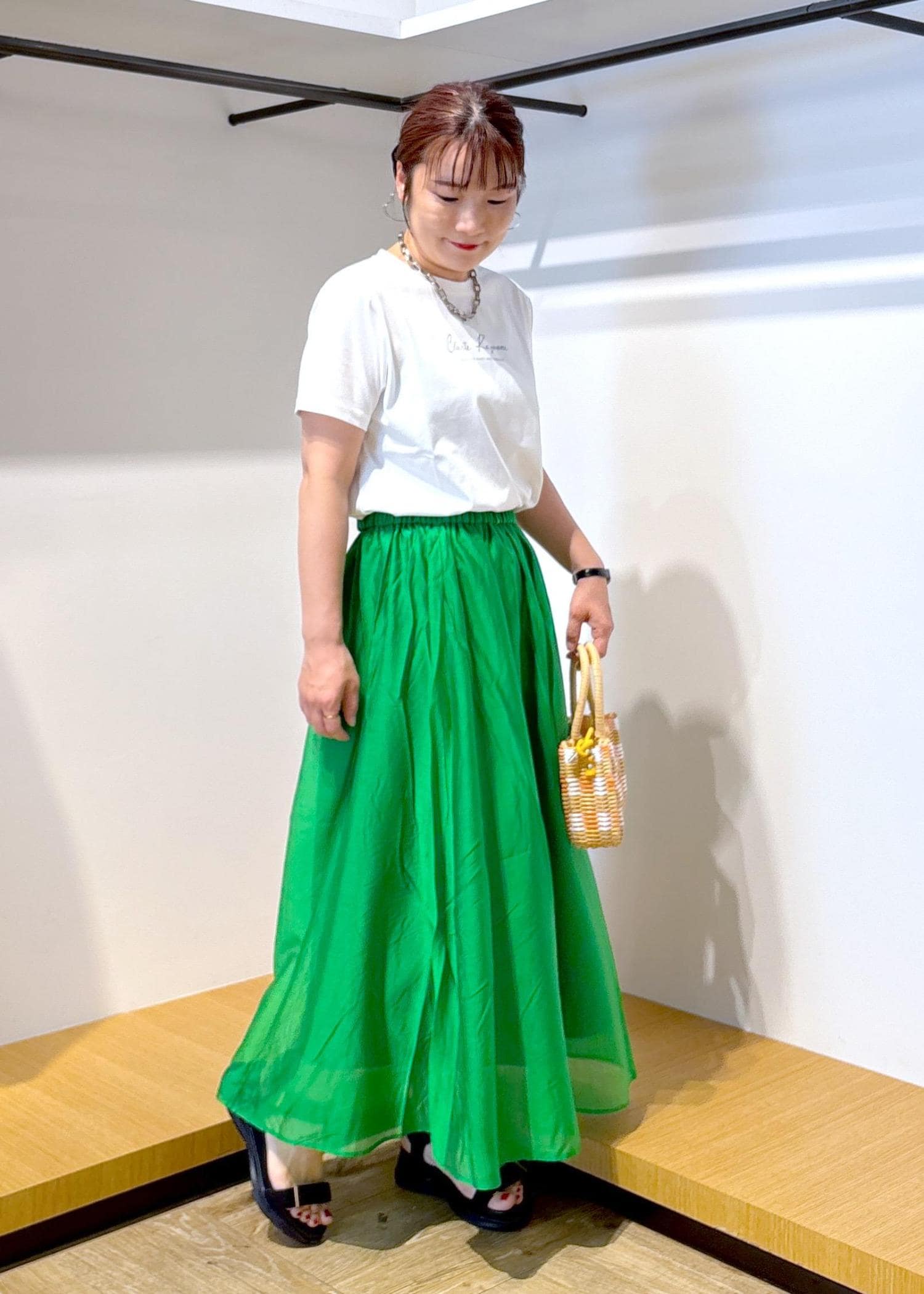 パッと目を引く綺麗なグリーンカラーのスカートをシンプルなロゴTシャツと合わせてスカートをより引き立たせたところがポイントです☆