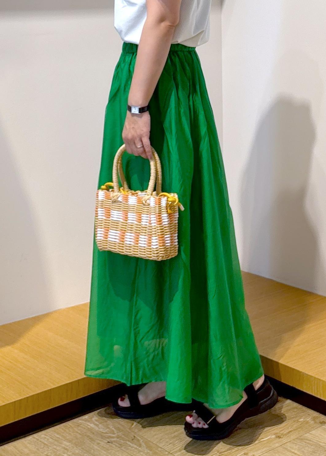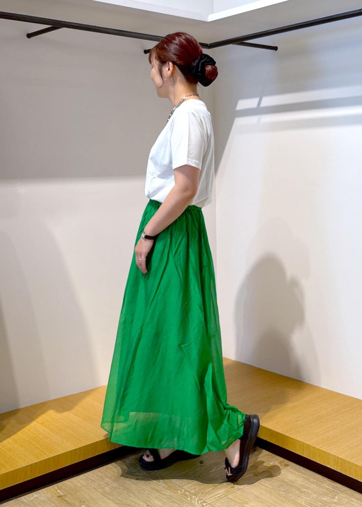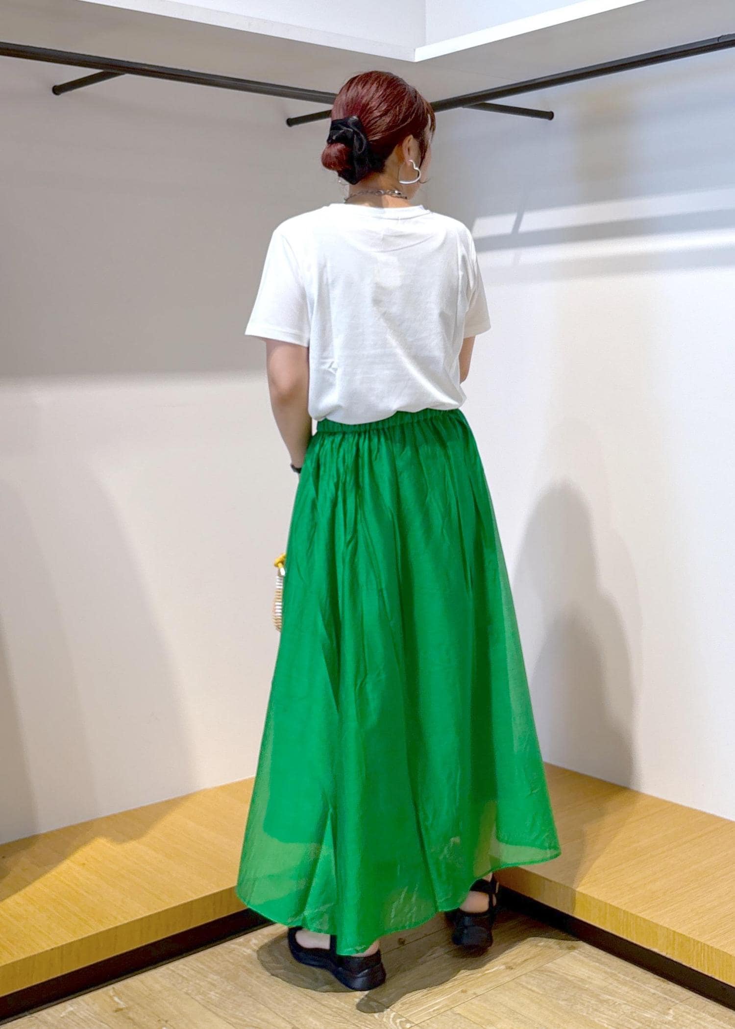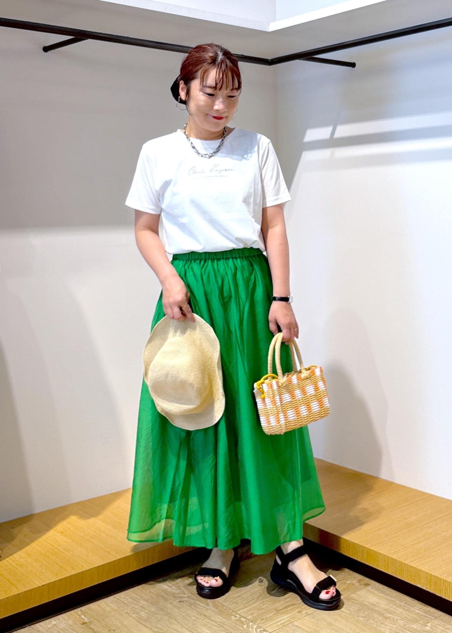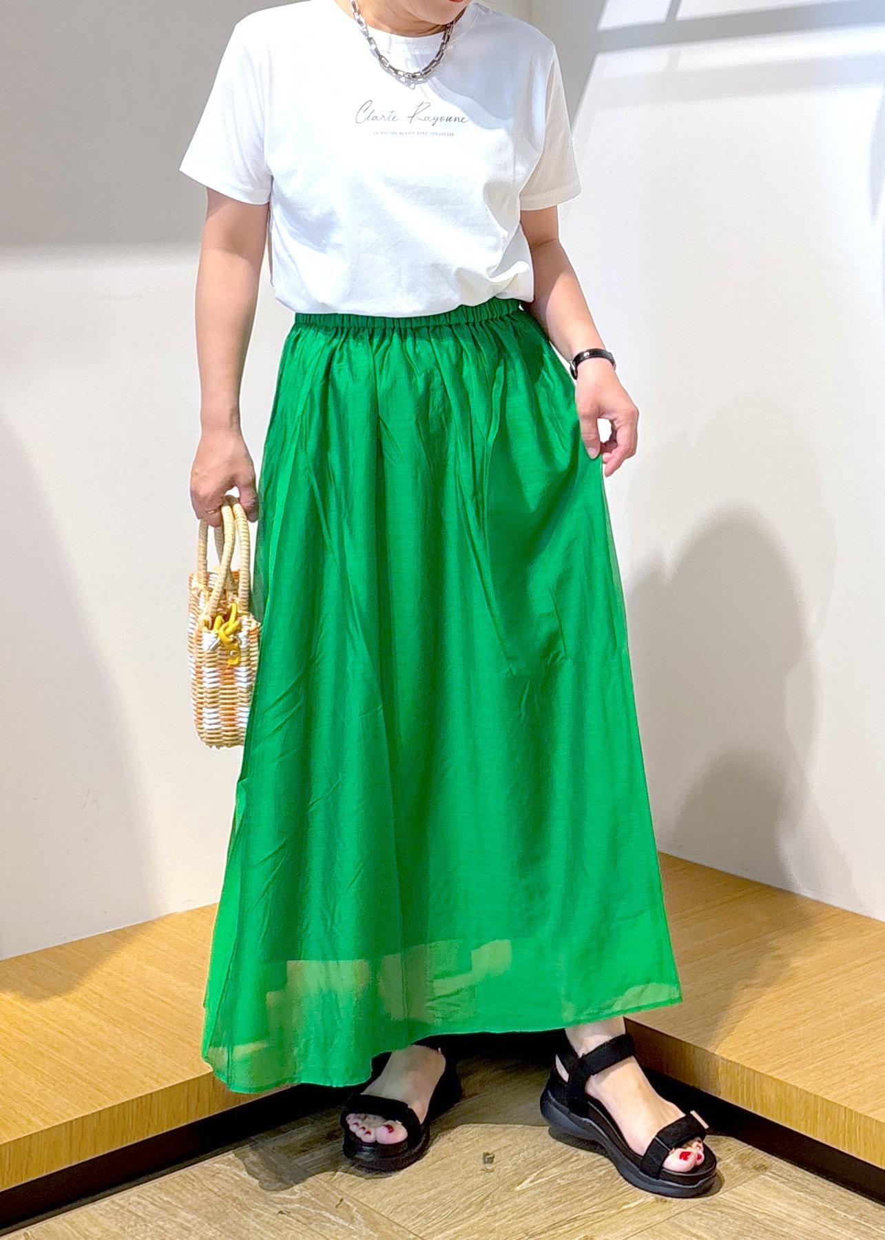 パッと目を引く綺麗なグリーンカラーのスカートをシンプルなロゴTシャツと合わせてスカートをより引き立たせたところがポイントです☆