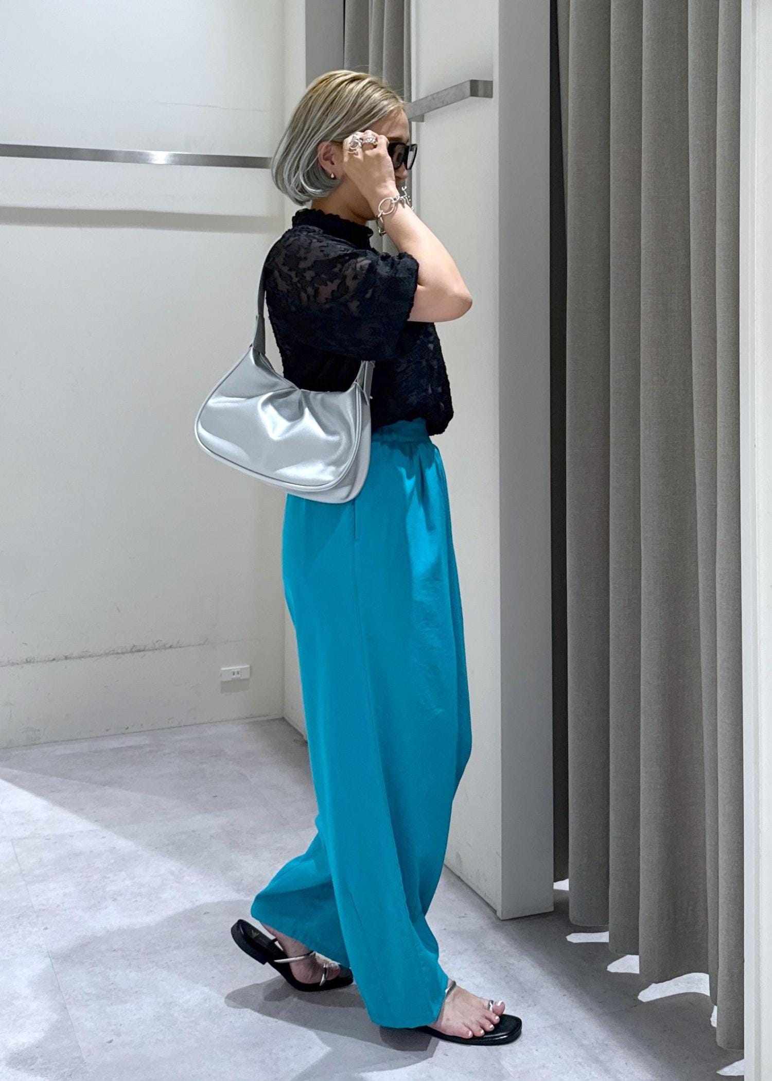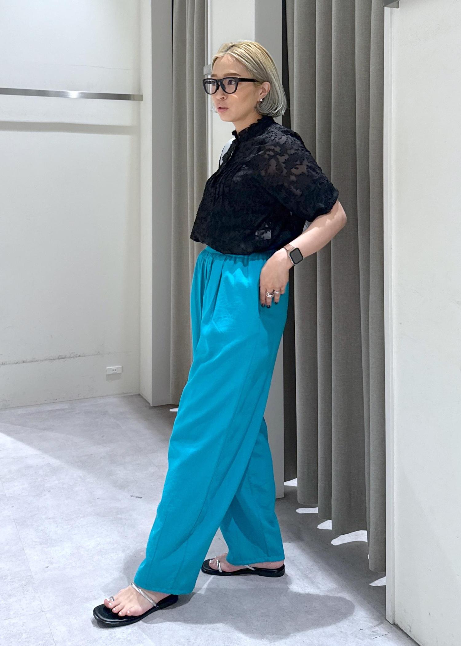 ウエストがゴムなので、着心地楽チンなハイウエストワイドイージーパンツ。
