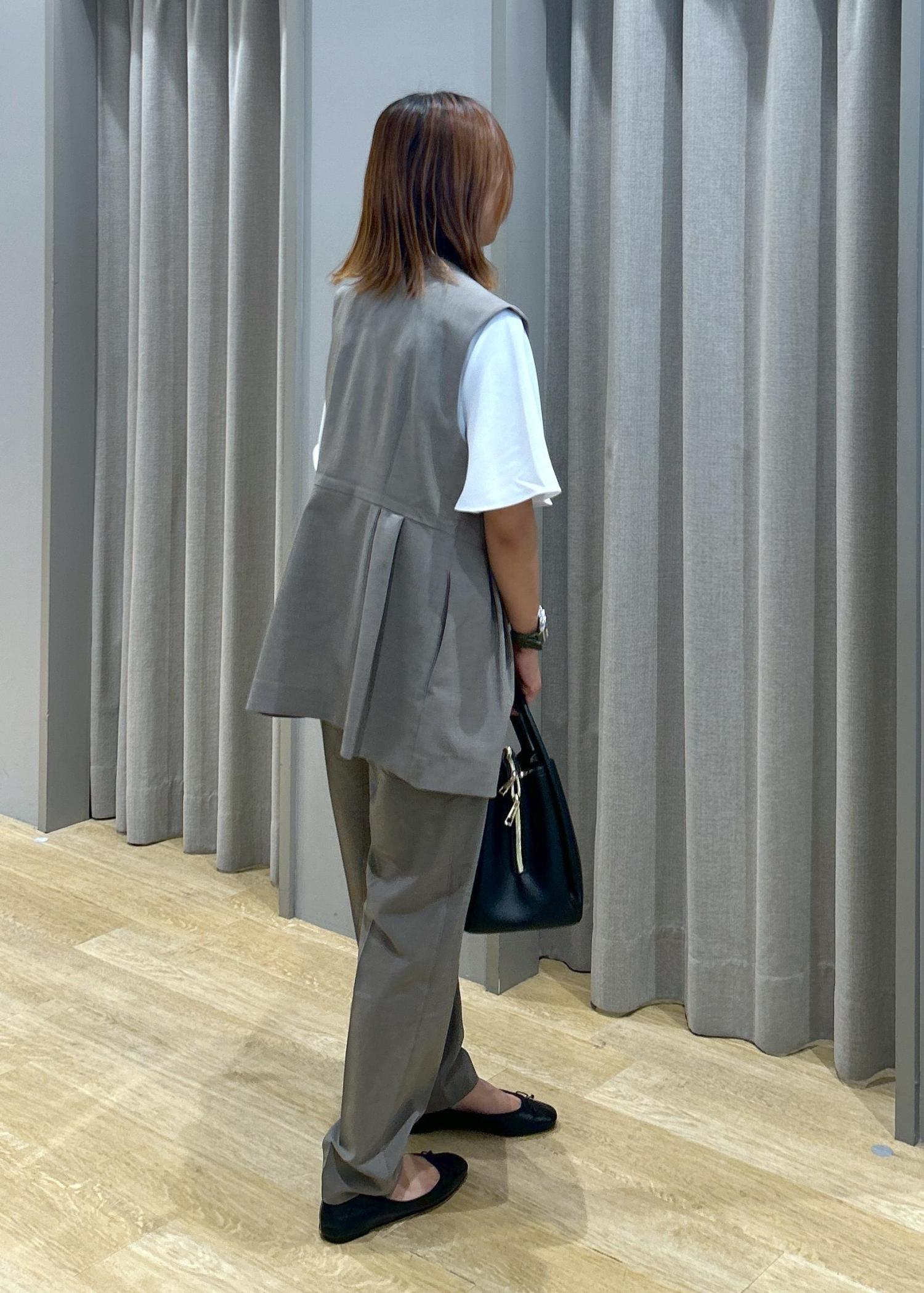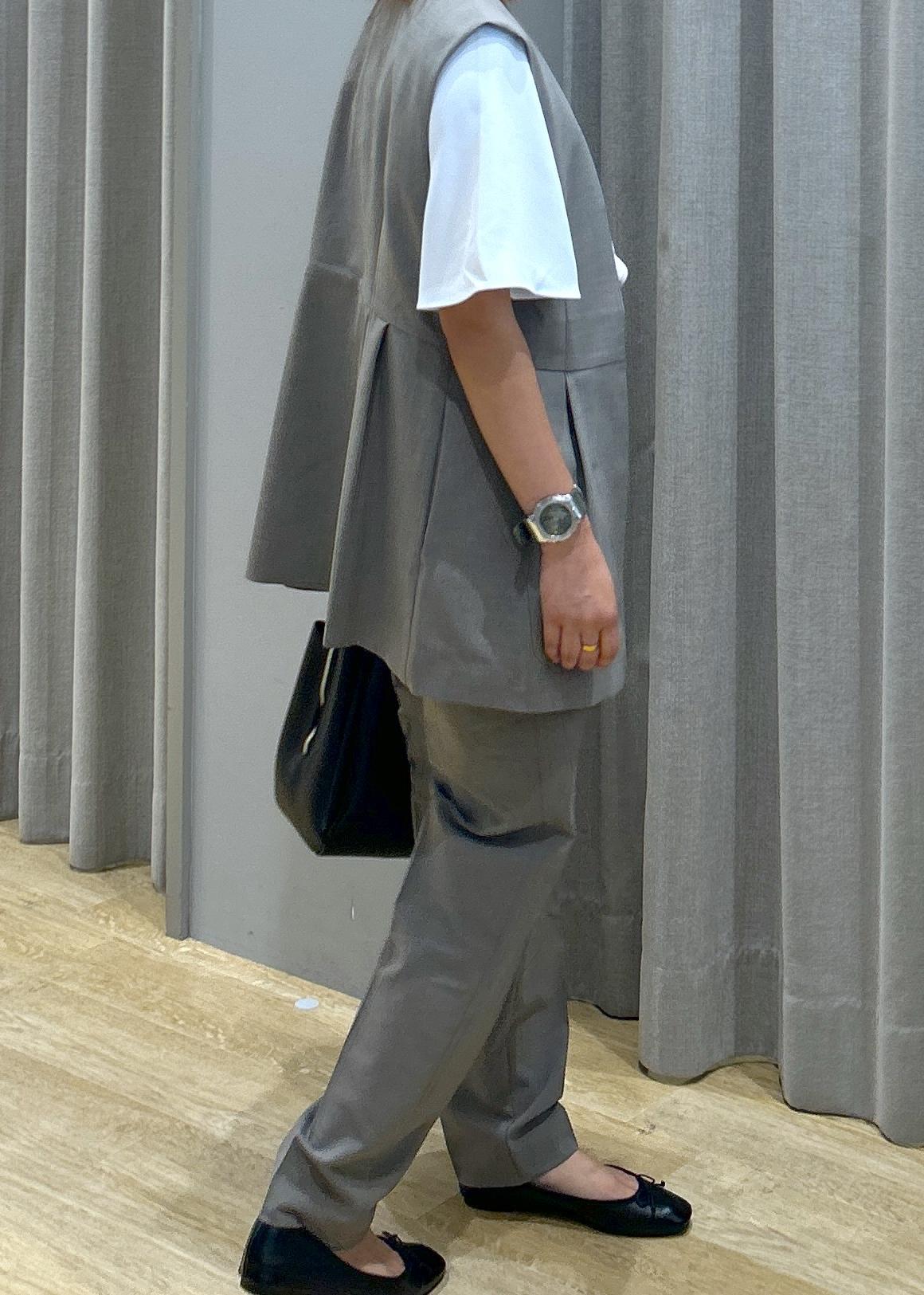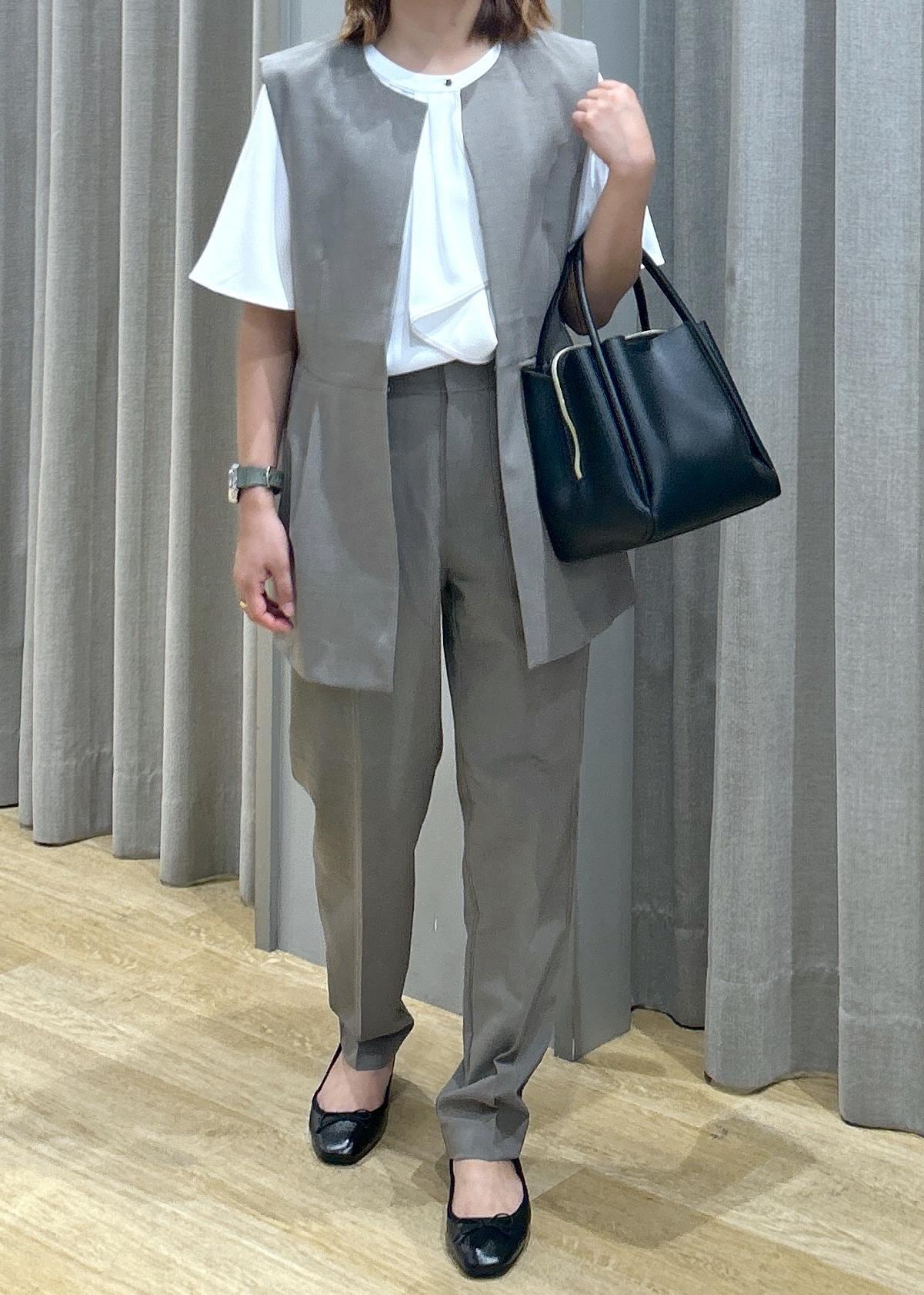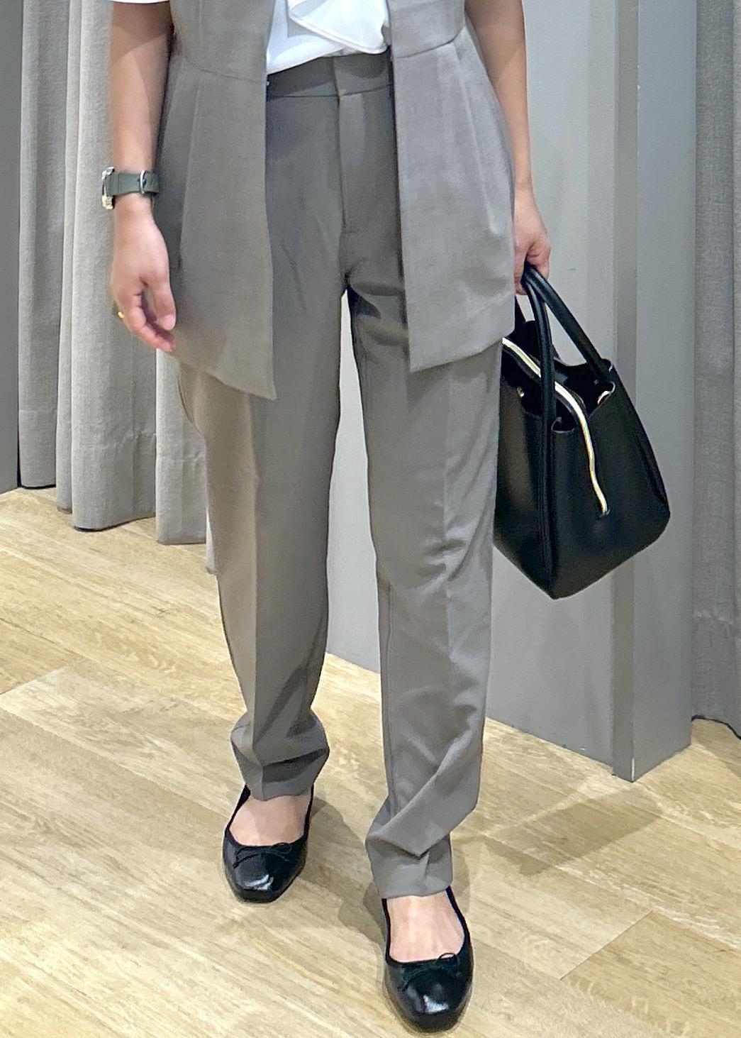 ヒールのある靴を着用するか、ベルトでしっかり上げて履いた方がより形が綺麗です。 -