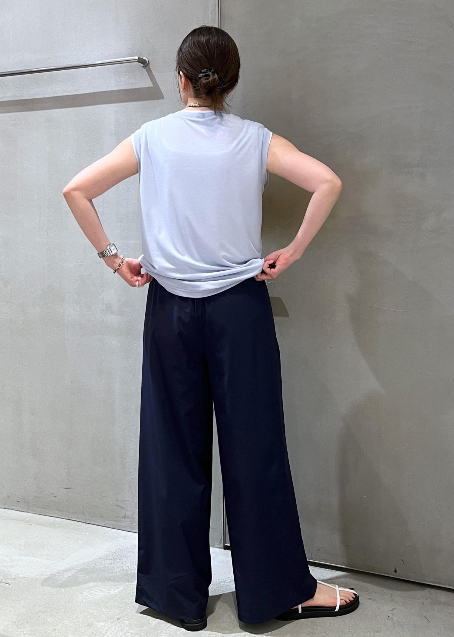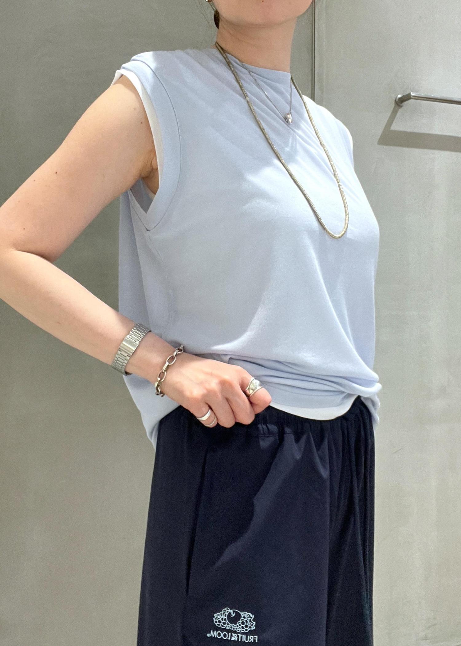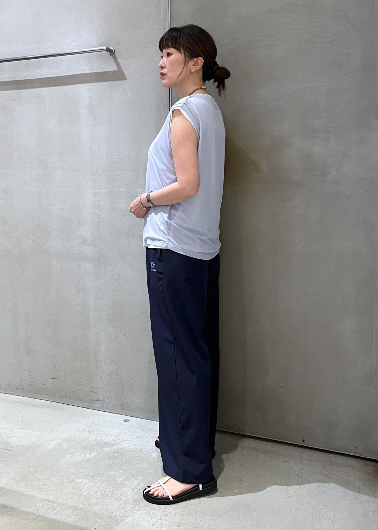 今回のコーディネートも上はセルクルのシアータンクトップ2色をレイヤード、ボトムにセルクル別注のフルーツオブザルームのパッカブルワイドパンツを合わせたスタイルにしました!