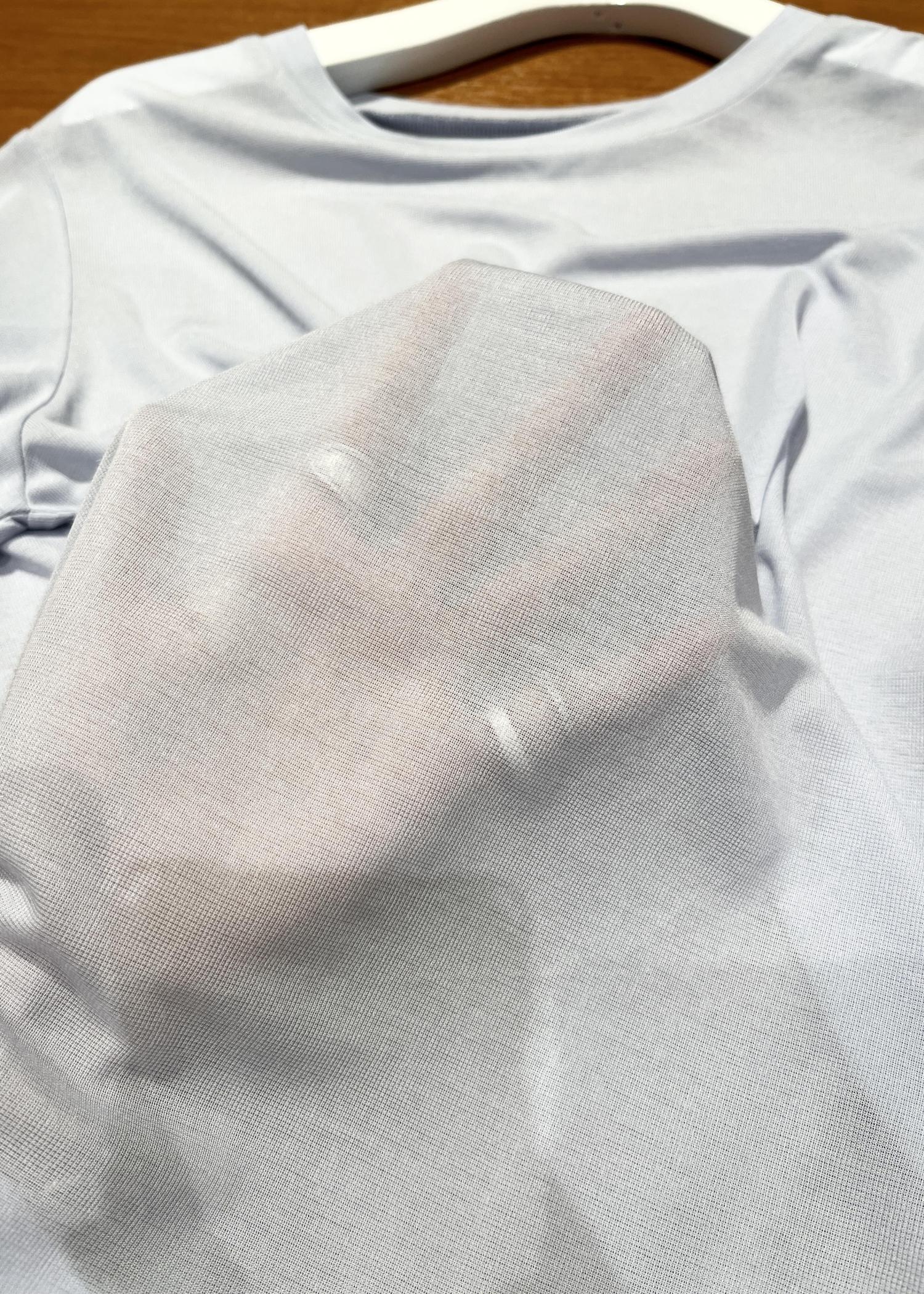 ピタッとしすぎず、柔らかで落ち感のある素材。透けすぎないので、ショート丈のバンドゥなどと合わせてもおなかが見えすぎずトライしやすいとおもいます!