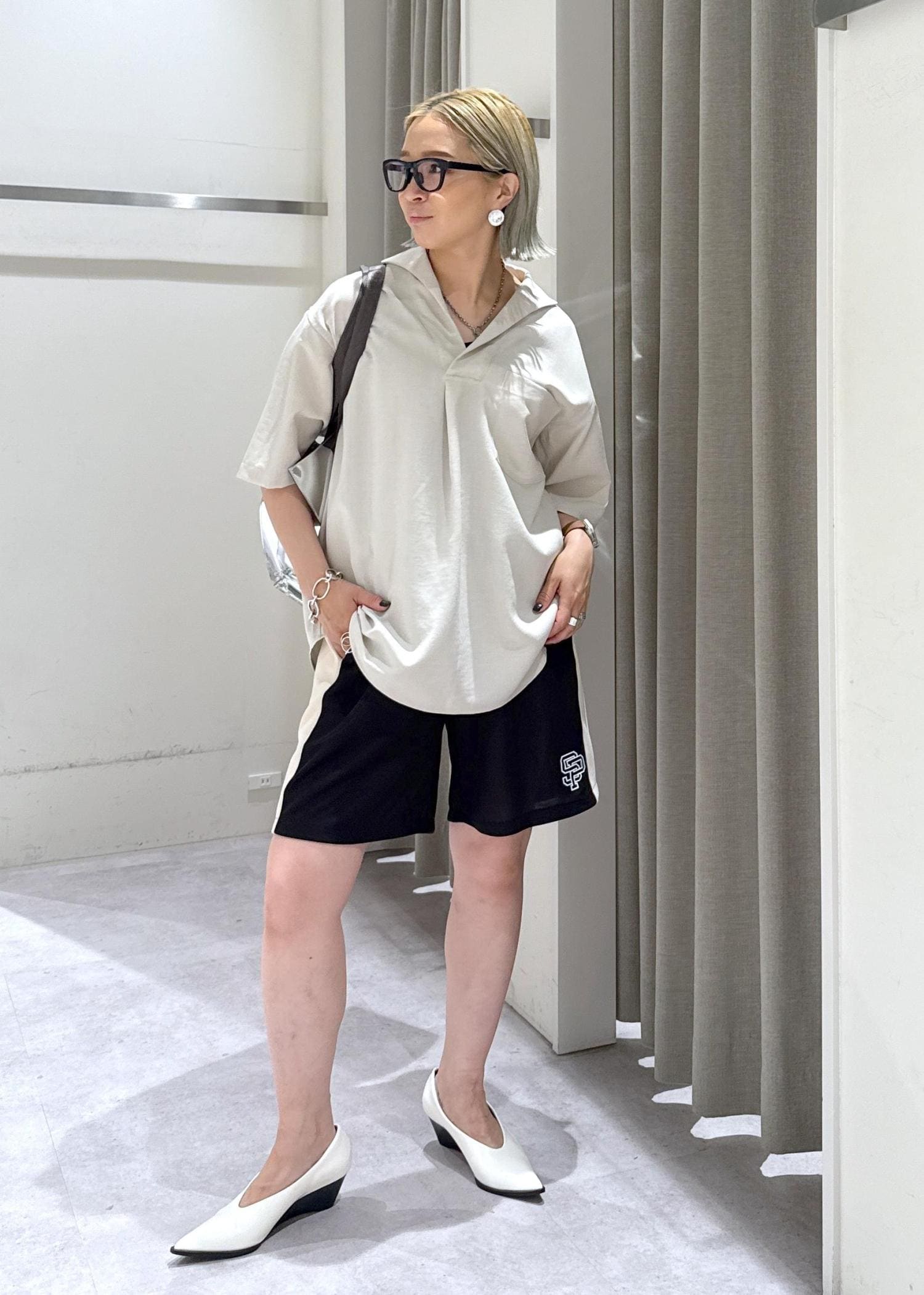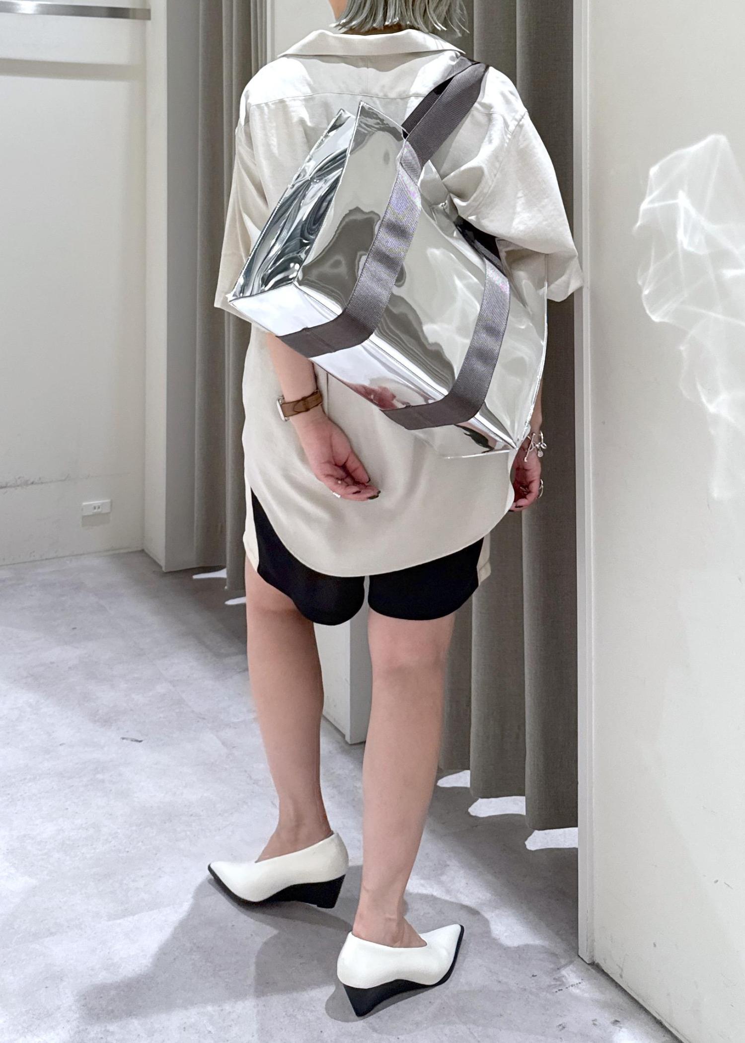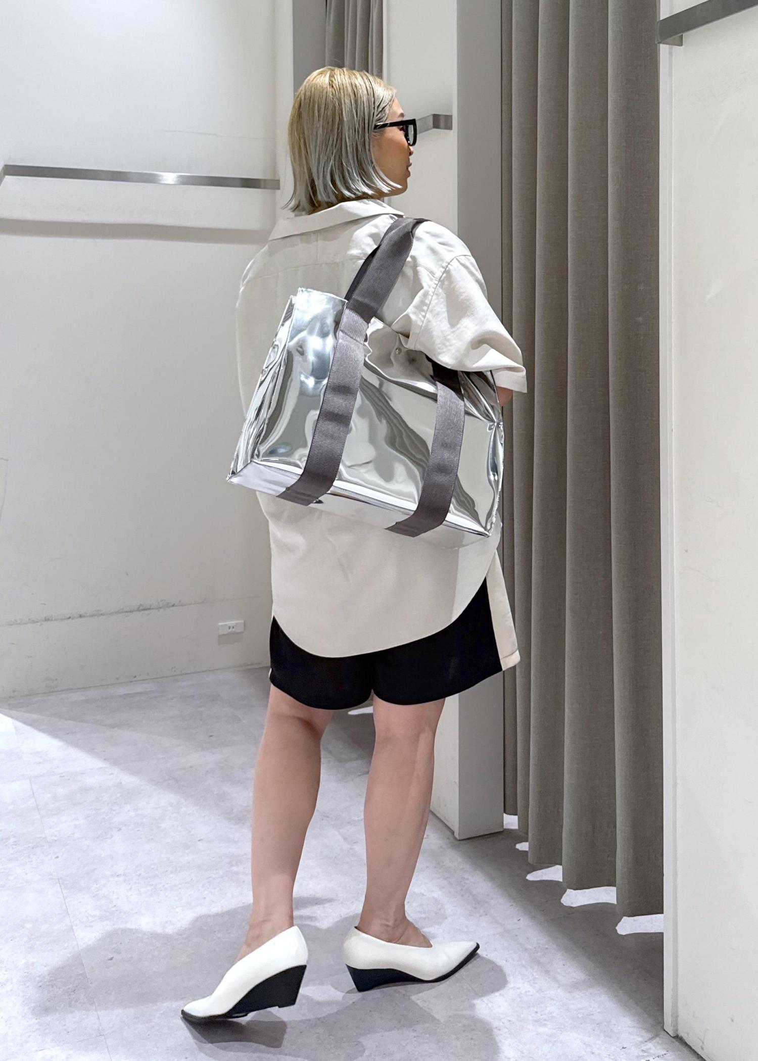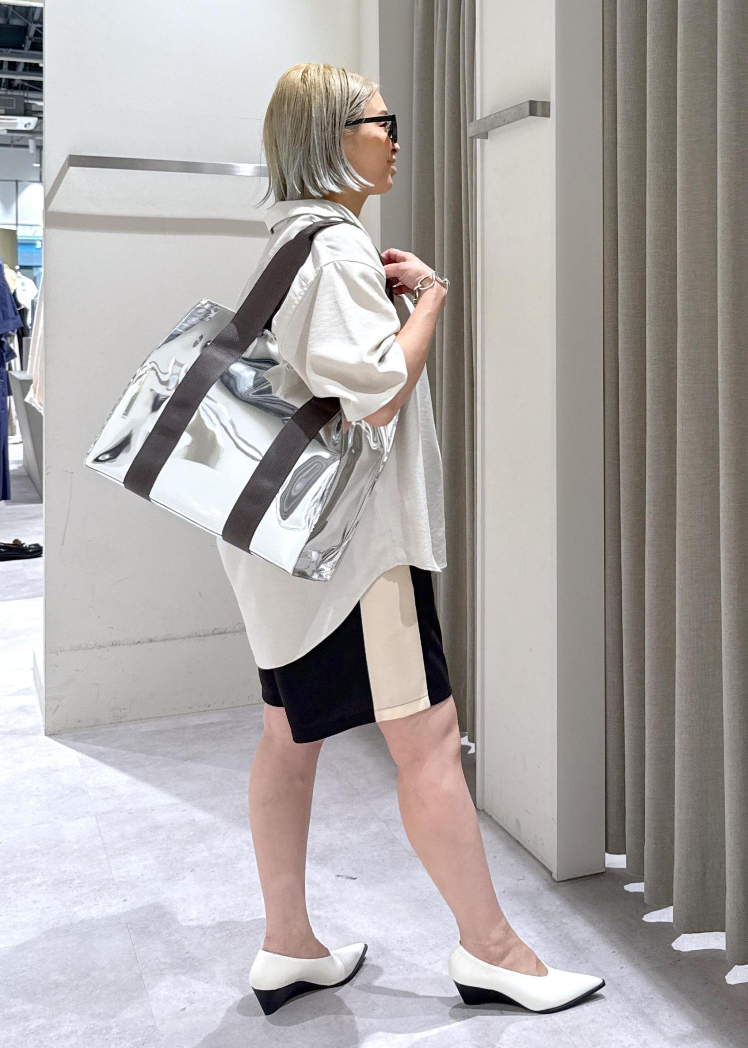 女性っぽい要素の強いパンプスとシルバーのトートを使いました♪
