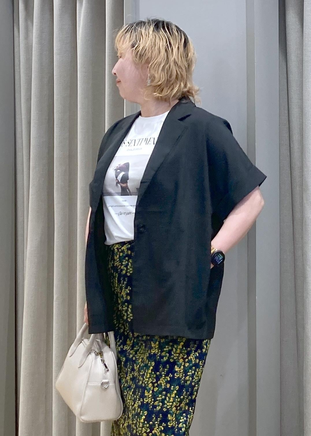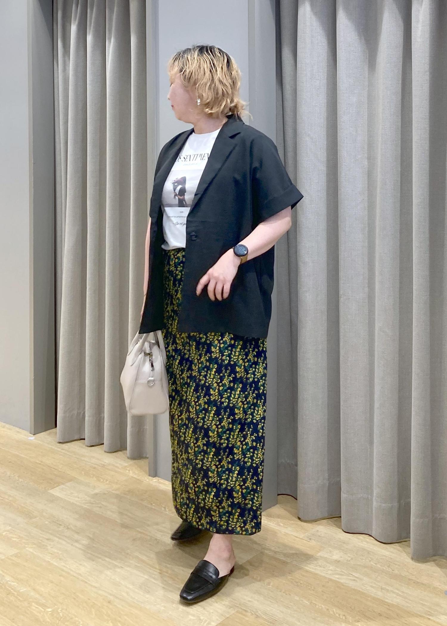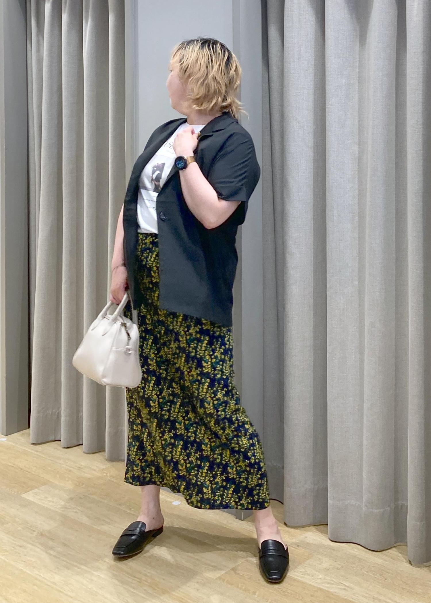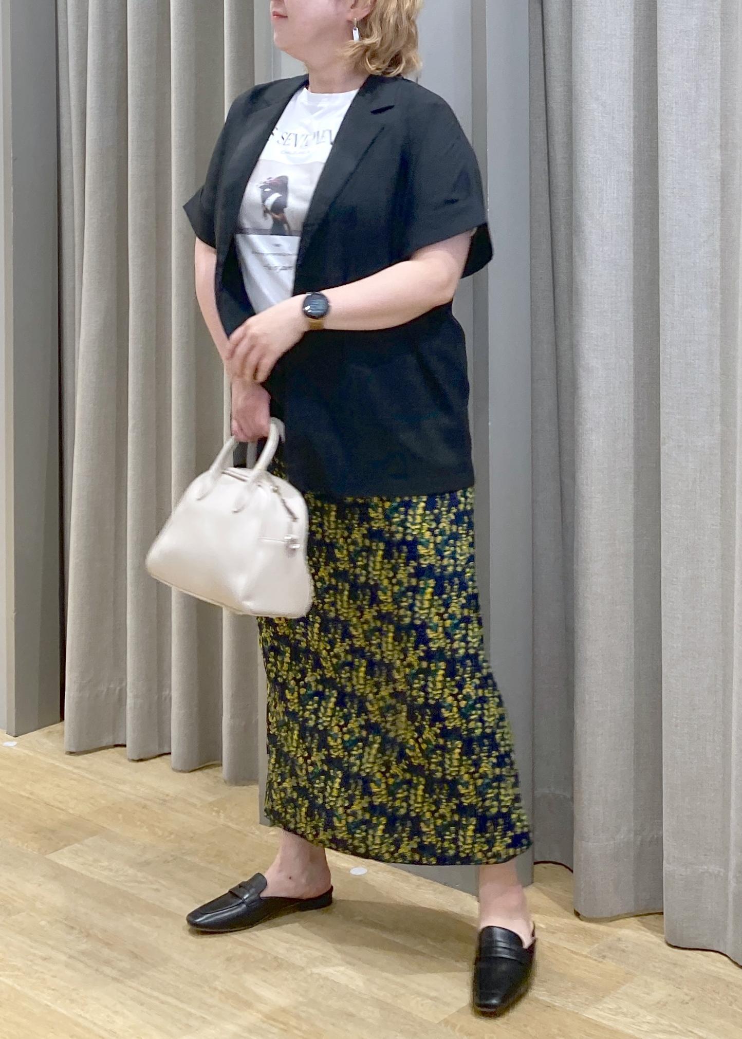 Tシャツ×ジャケットの王道コンビに、柄スカートで遊び心をプラス。