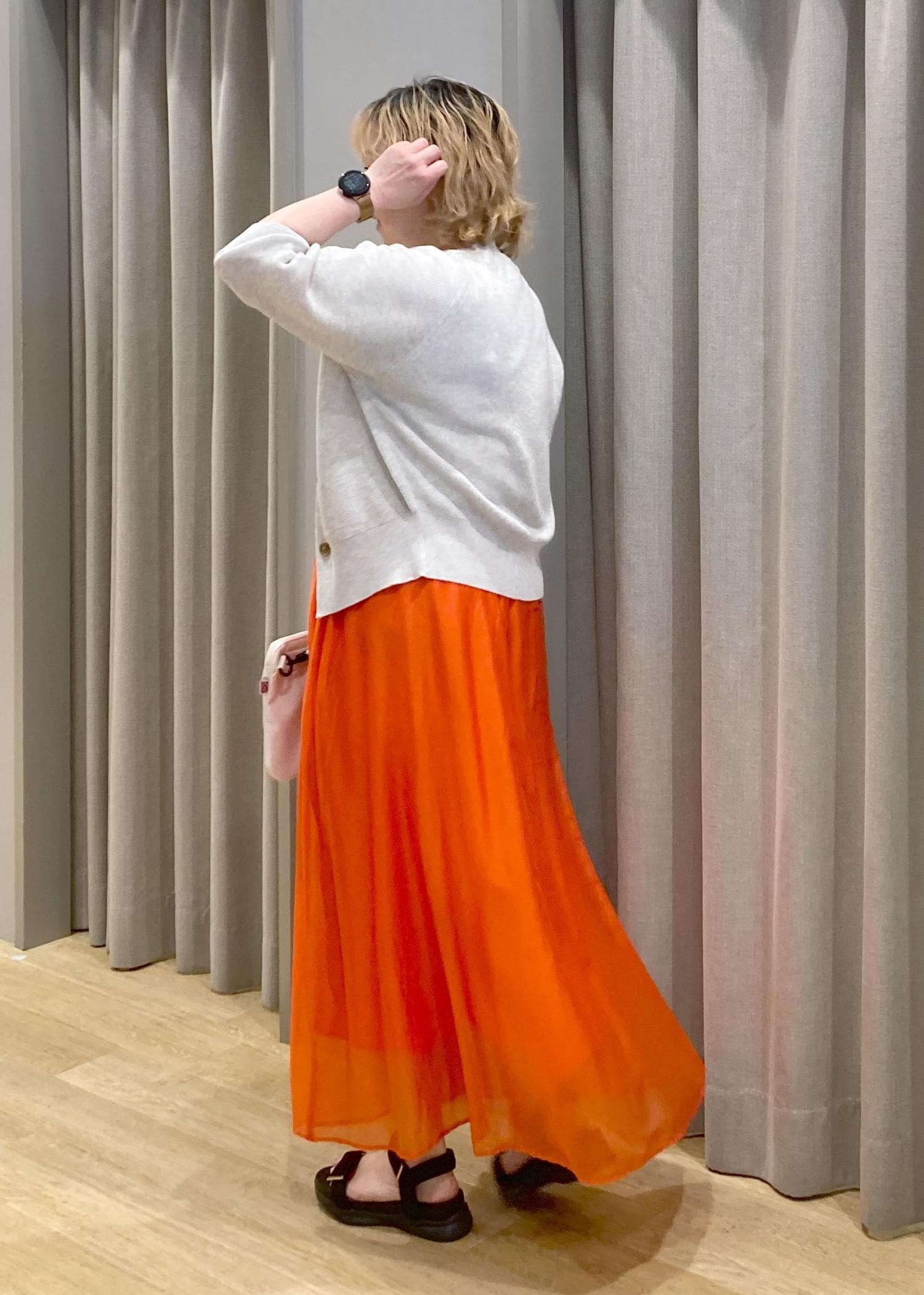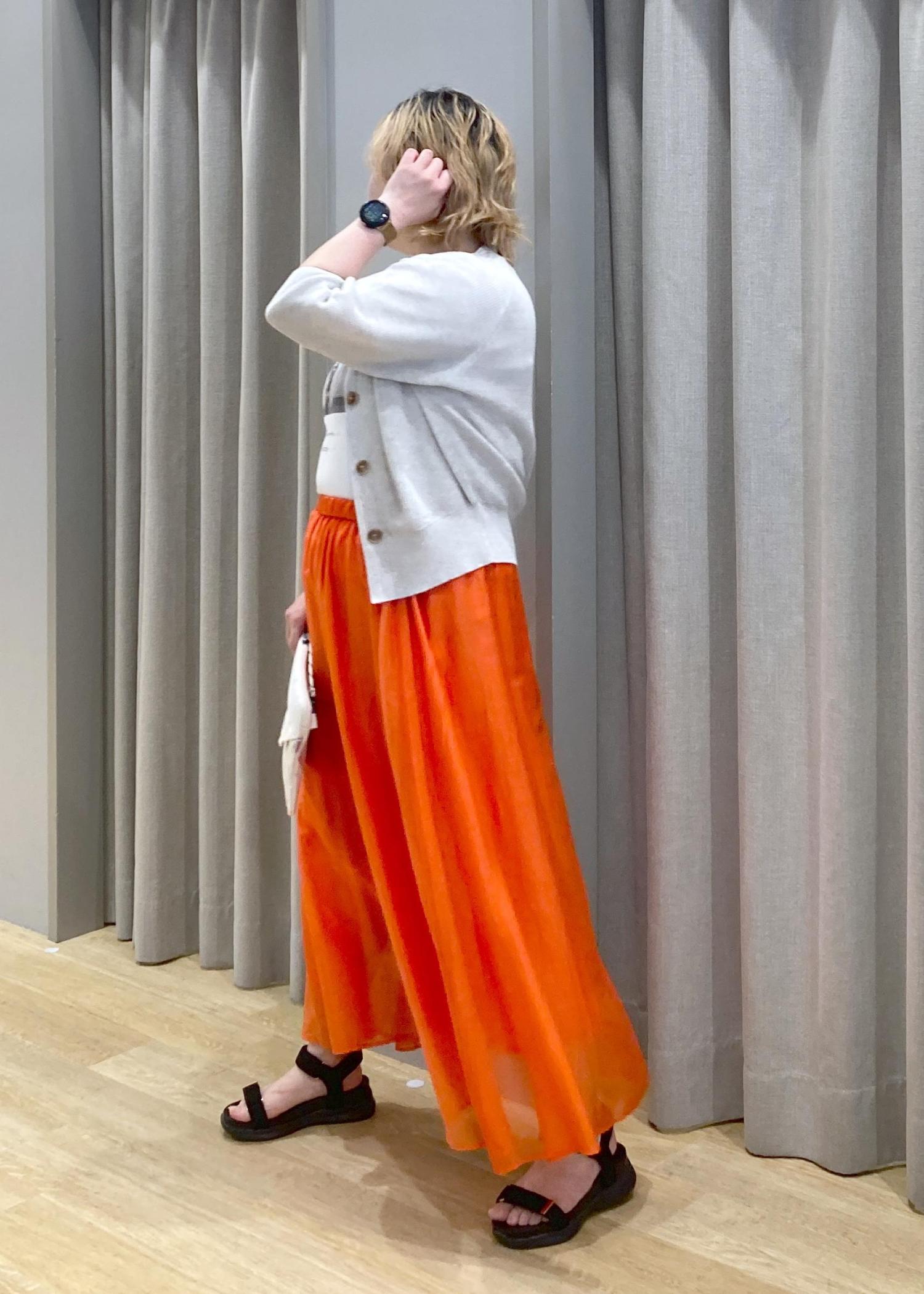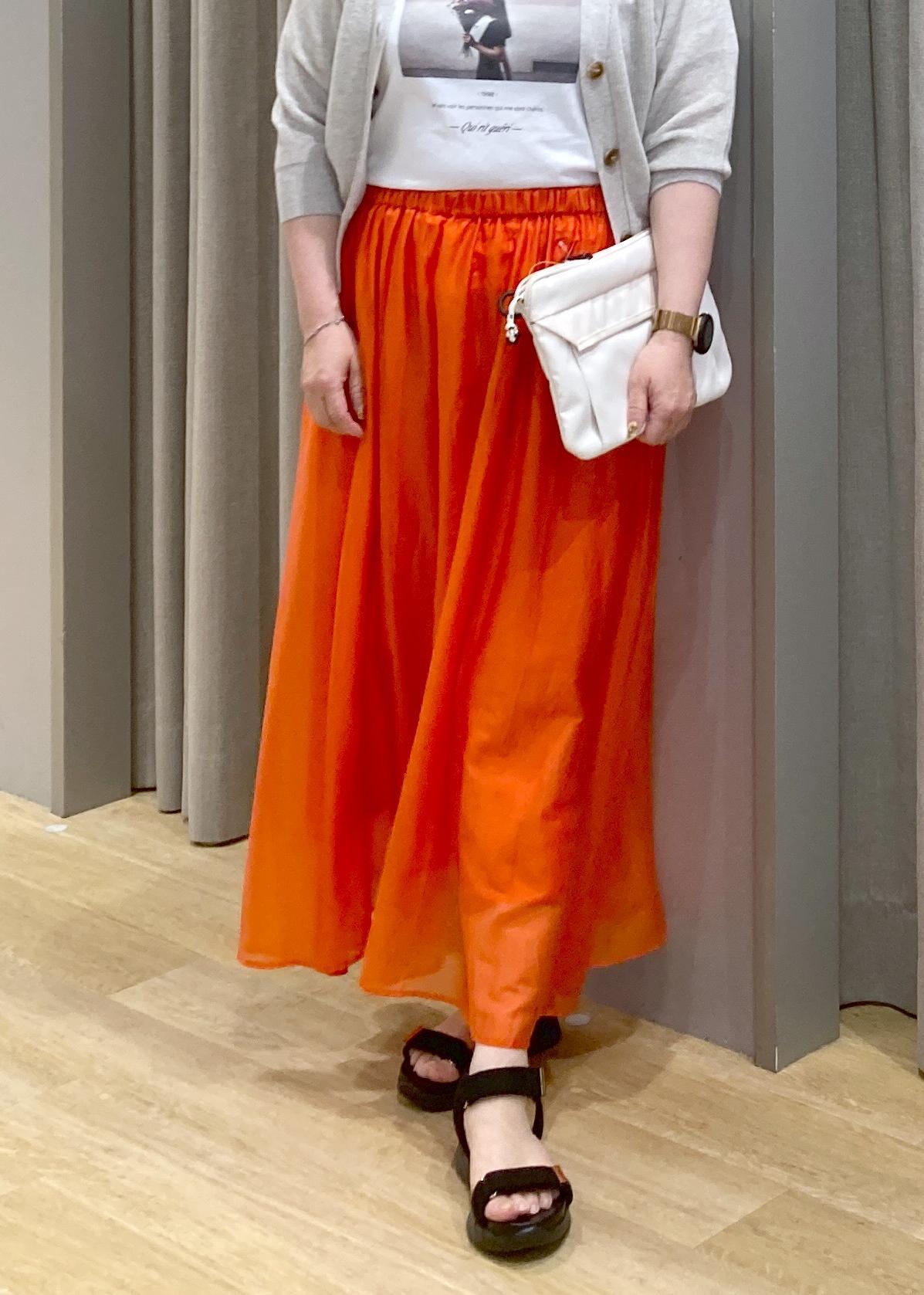 そこに鮮やかなオレンジスカートを合わせれば、即・こなれ感アップ!