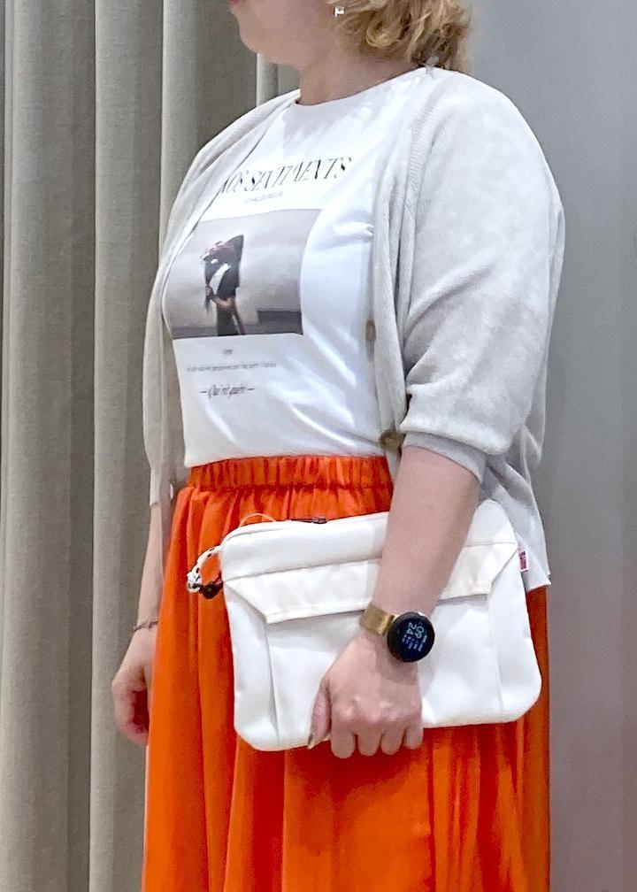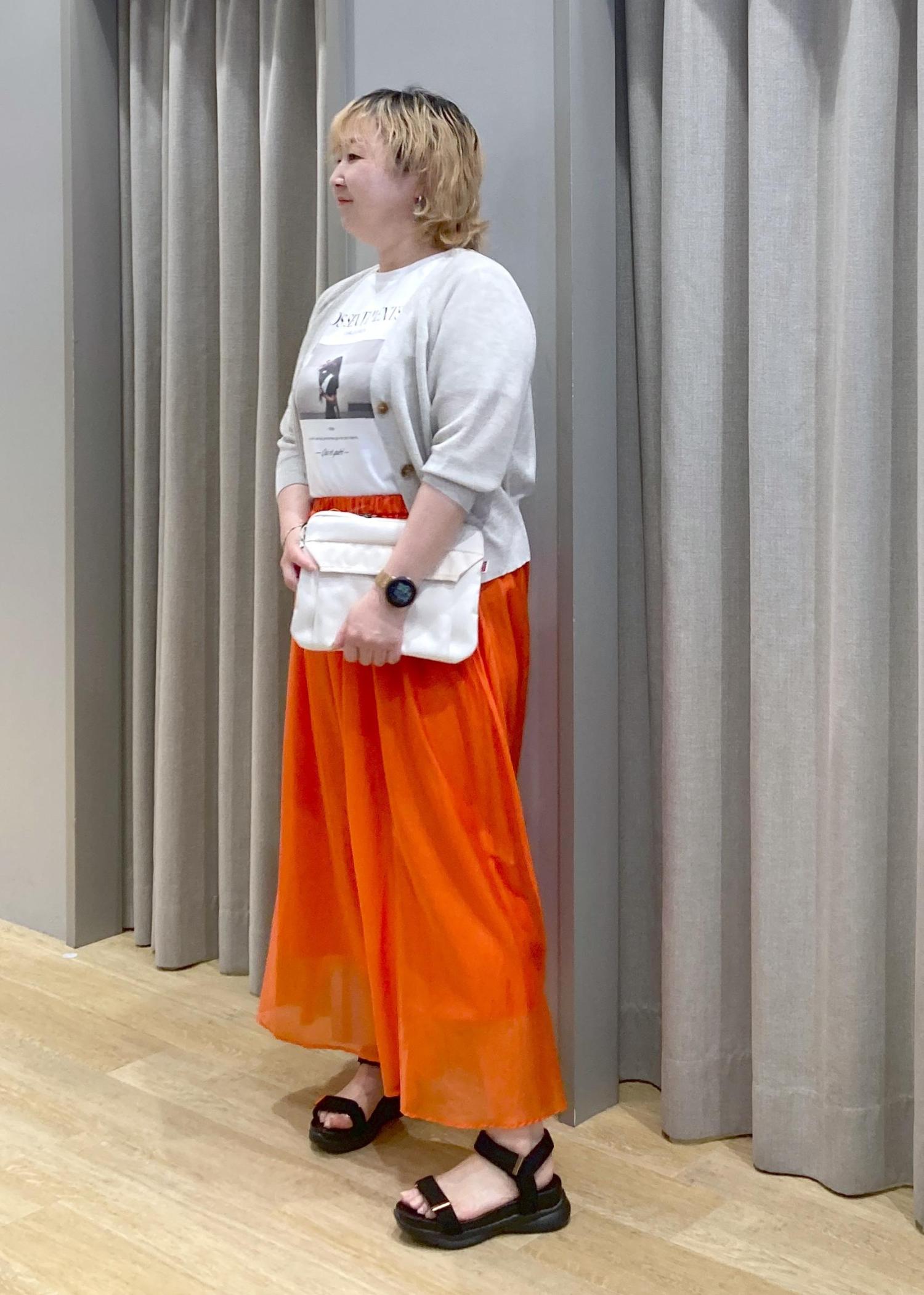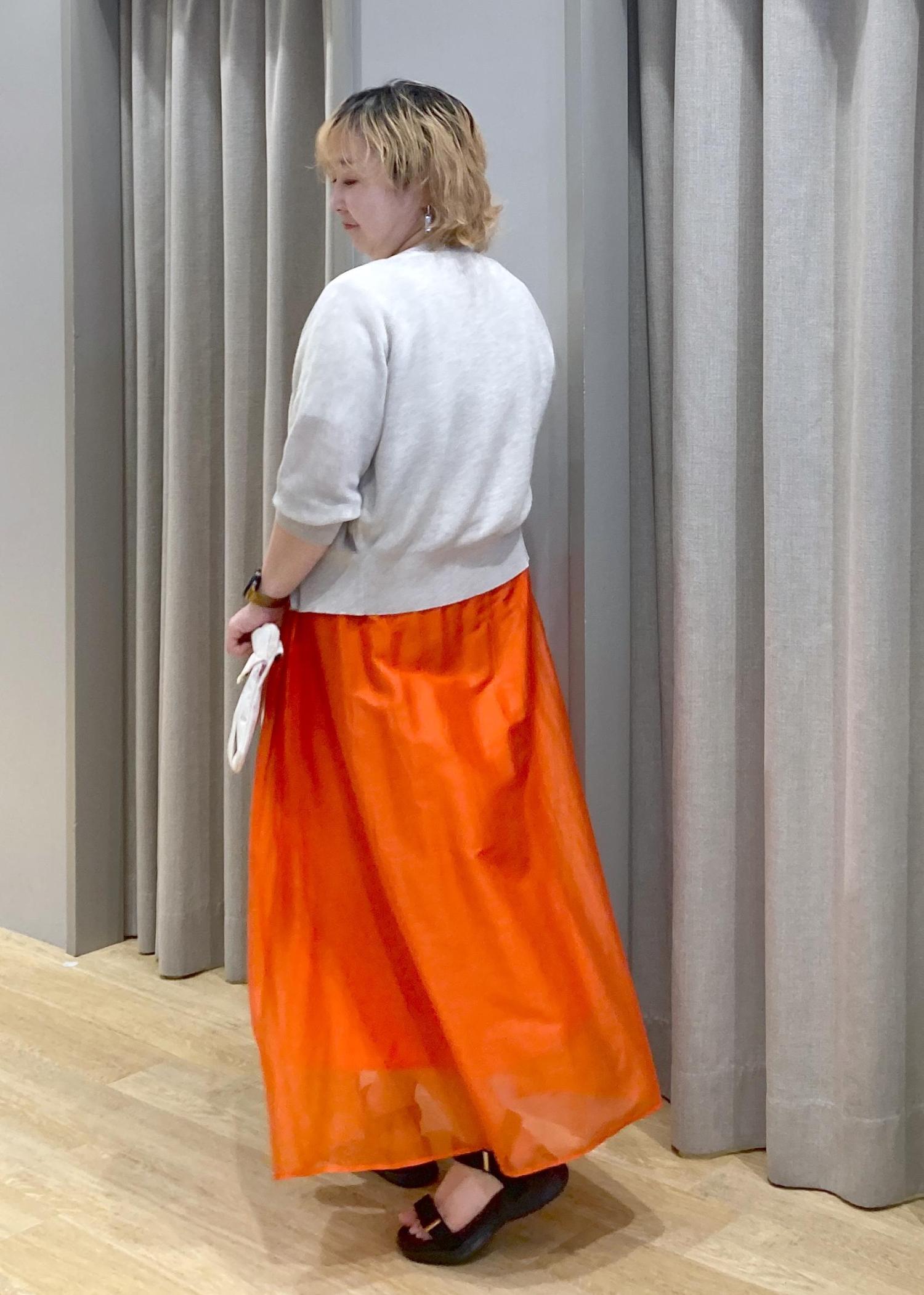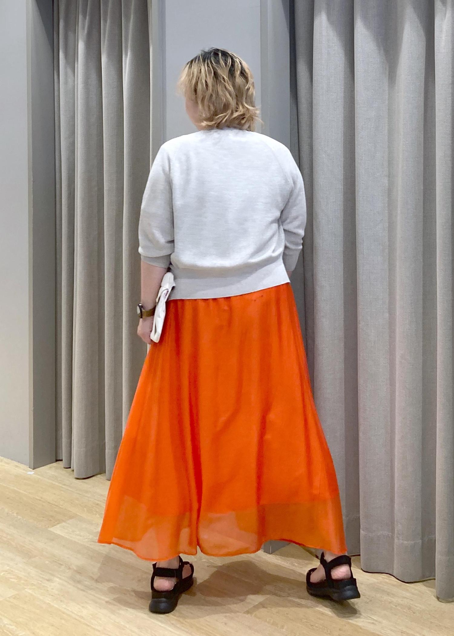 そこに鮮やかなオレンジスカートを合わせれば、即・こなれ感アップ!