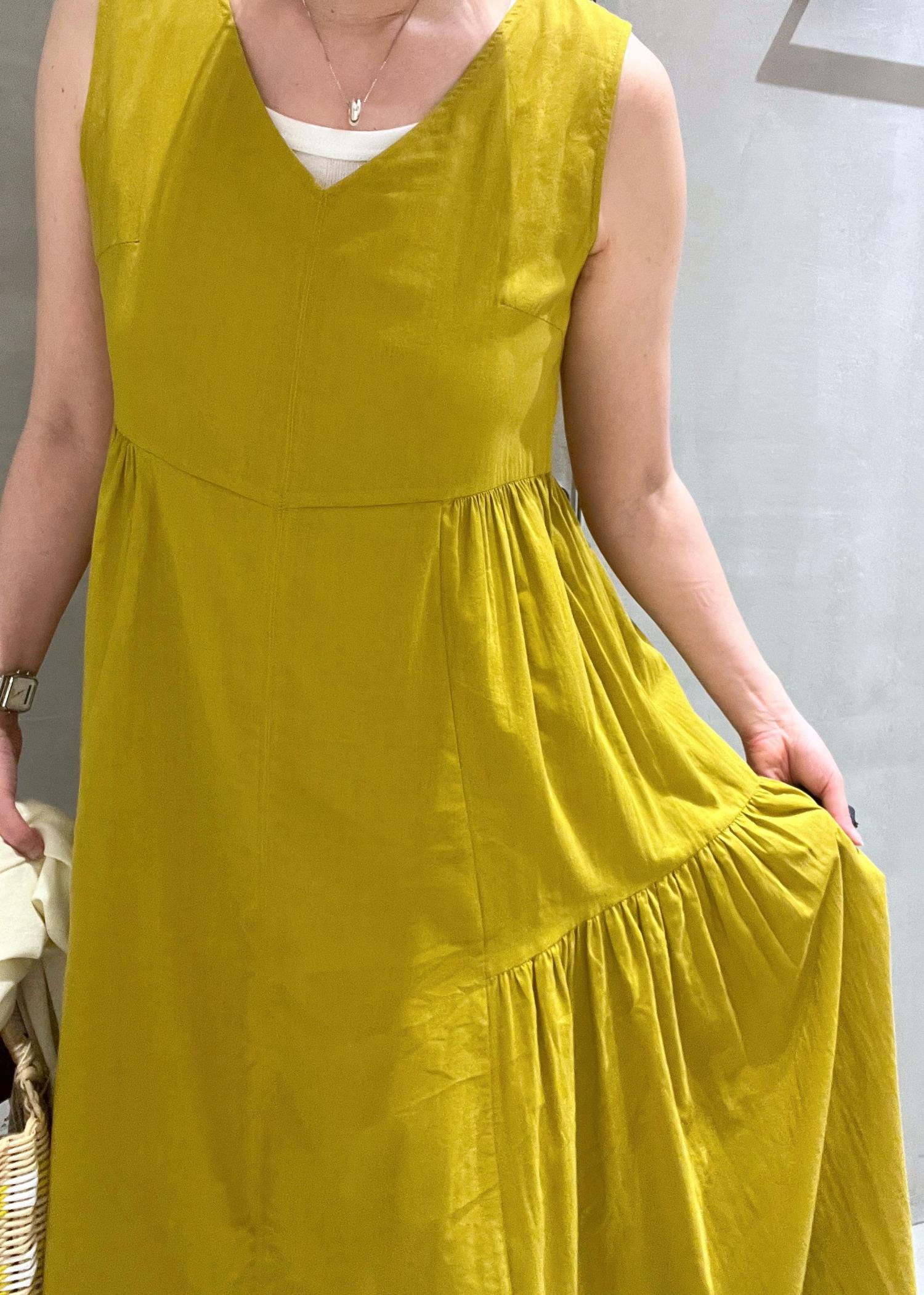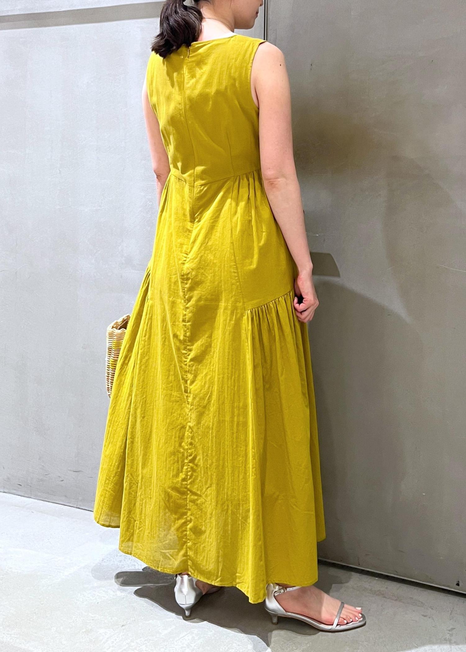 ウエスト、裾に入ったギャザーで動くたびにふわっと広がるラインがきれいなワンピース。