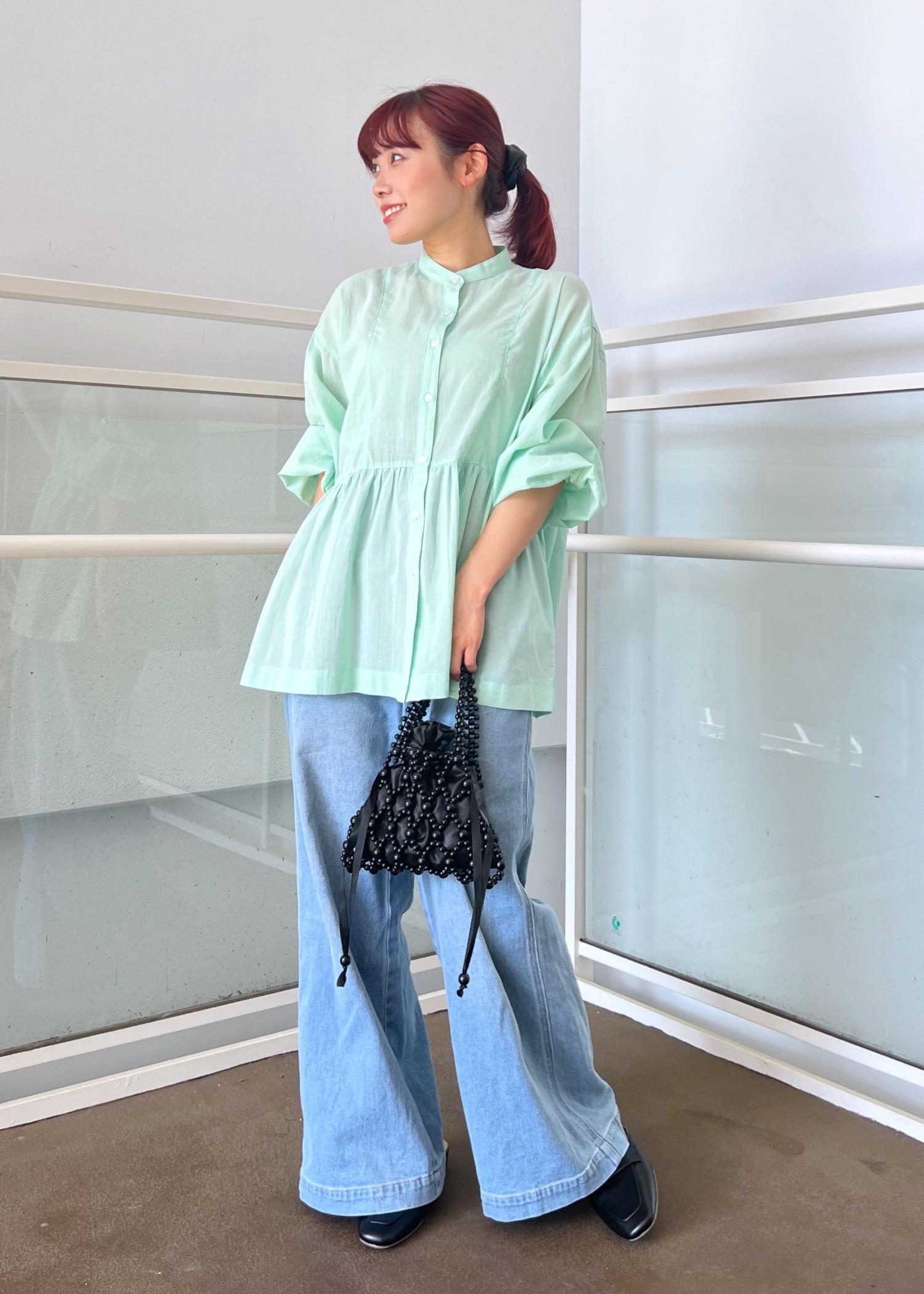 綿ボイルのペプラムシャツはブラウスとしても羽織としても使えます!また、爽やかなカラーと接触冷感機能付きなので夏も涼しく快適に過ごせます!