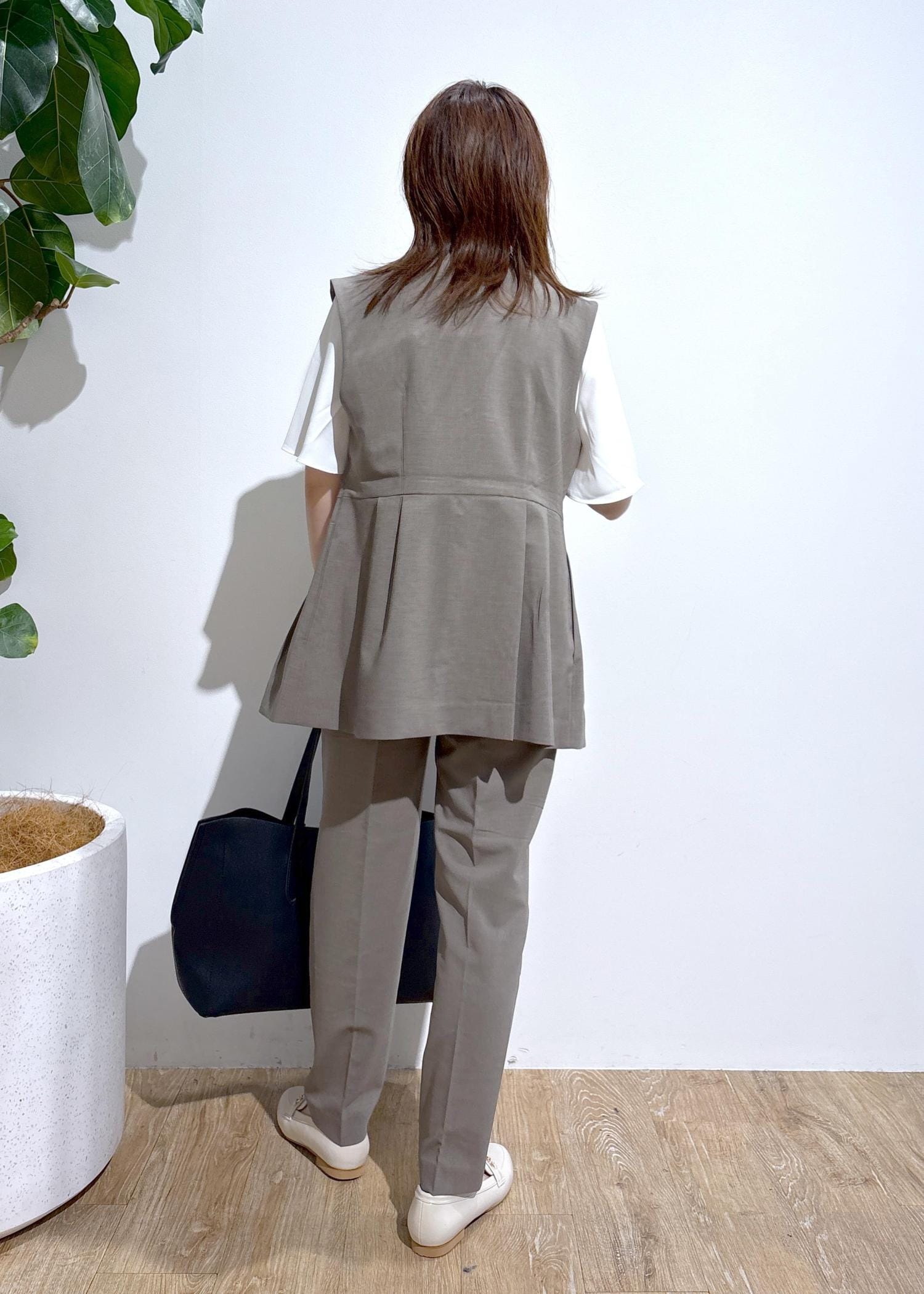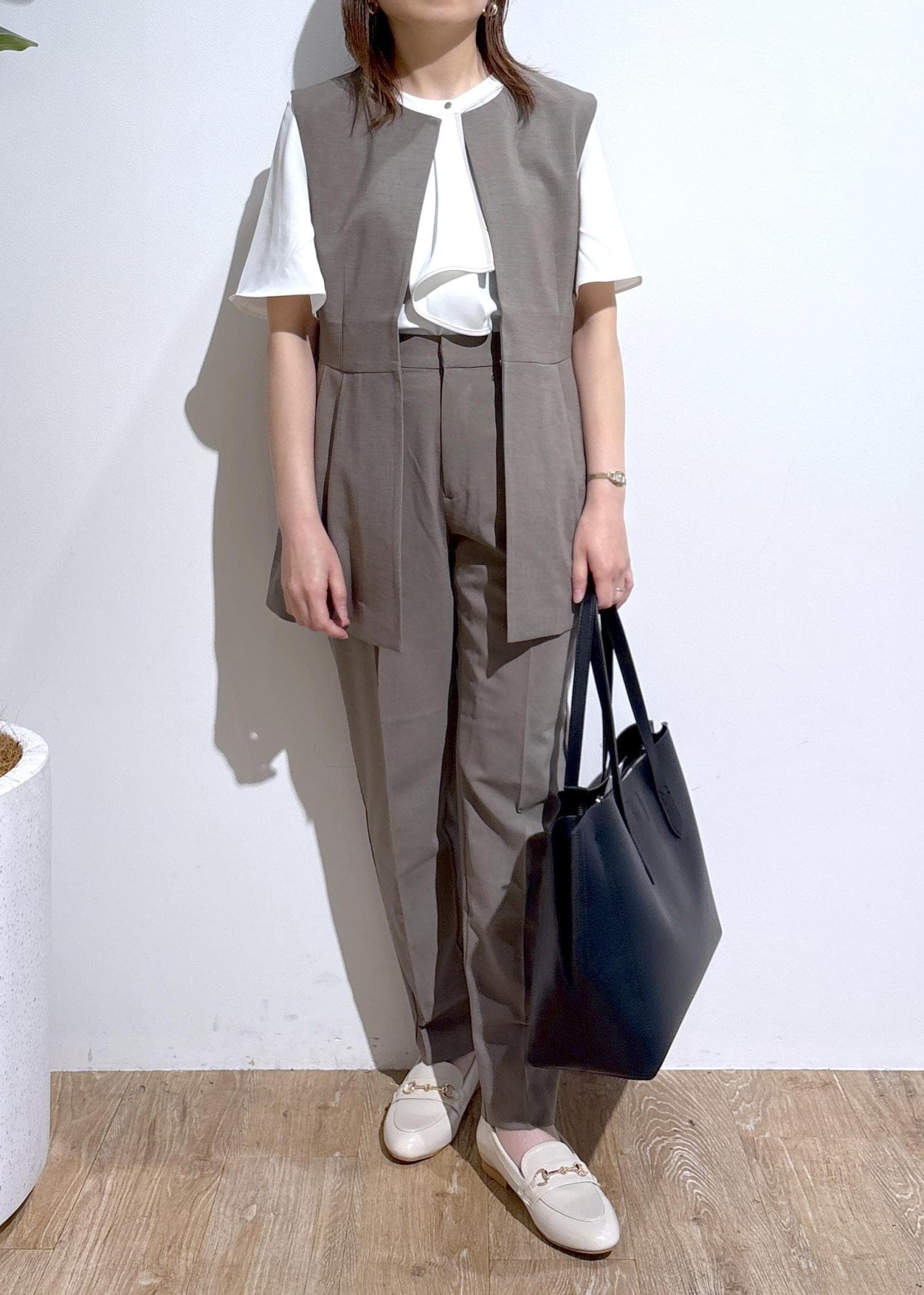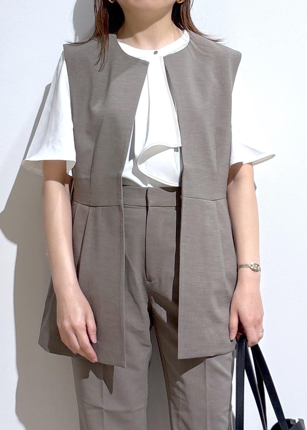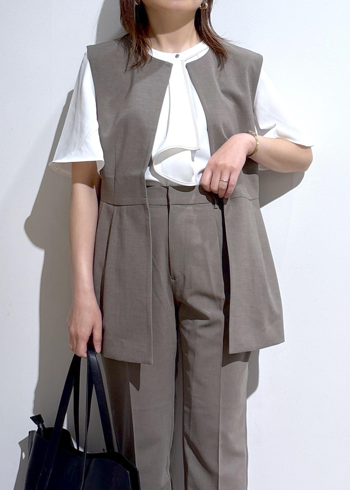 ジレのインナーにはノースリーブから長袖まで、気温に合わせてロングランでスタイリングを楽しめます。