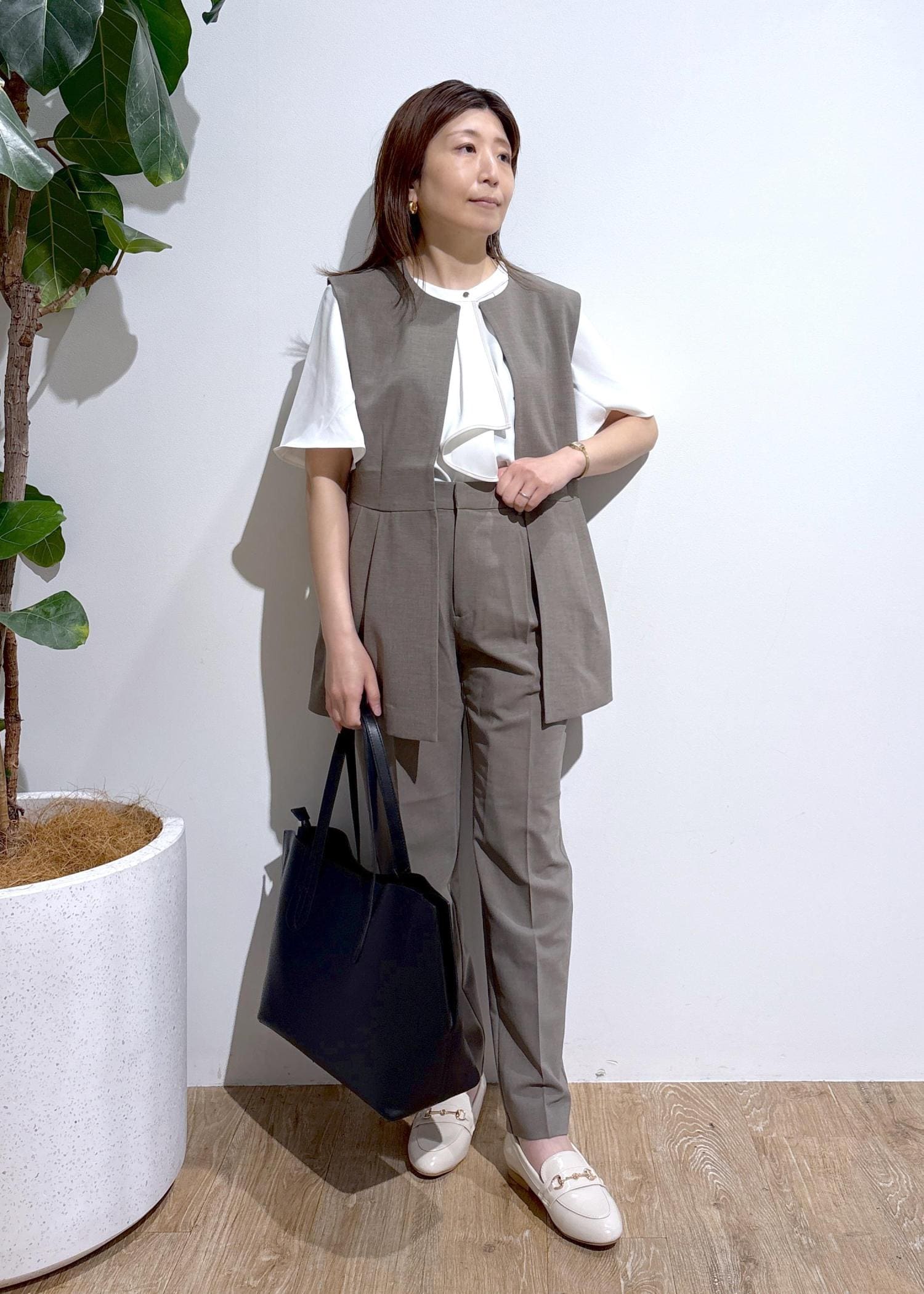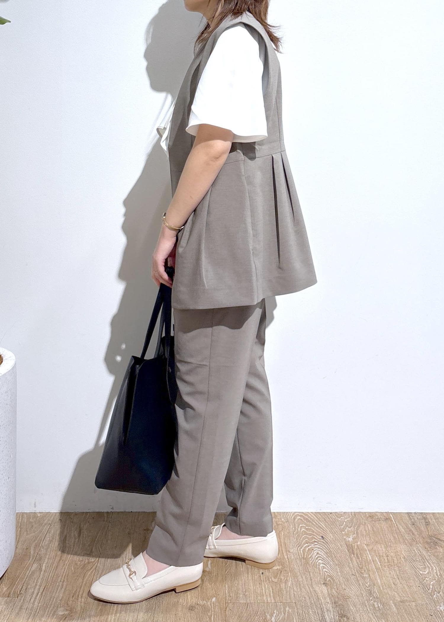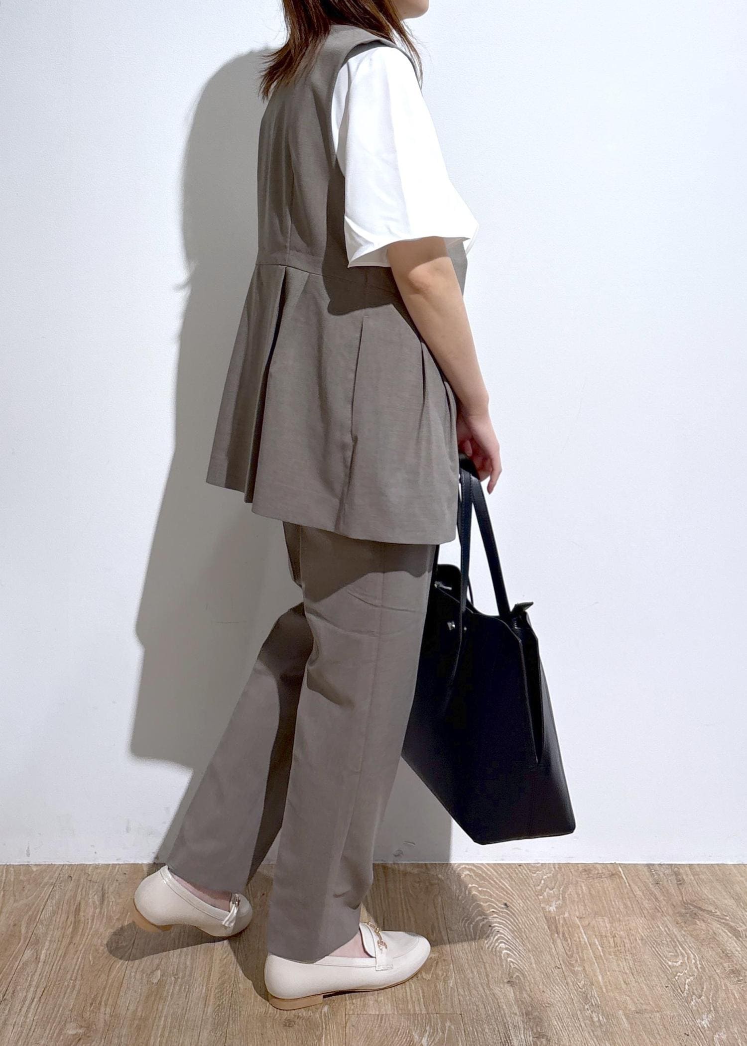 ペプラムデザインがおしゃれなセットアップのお仕事コーディネートです。