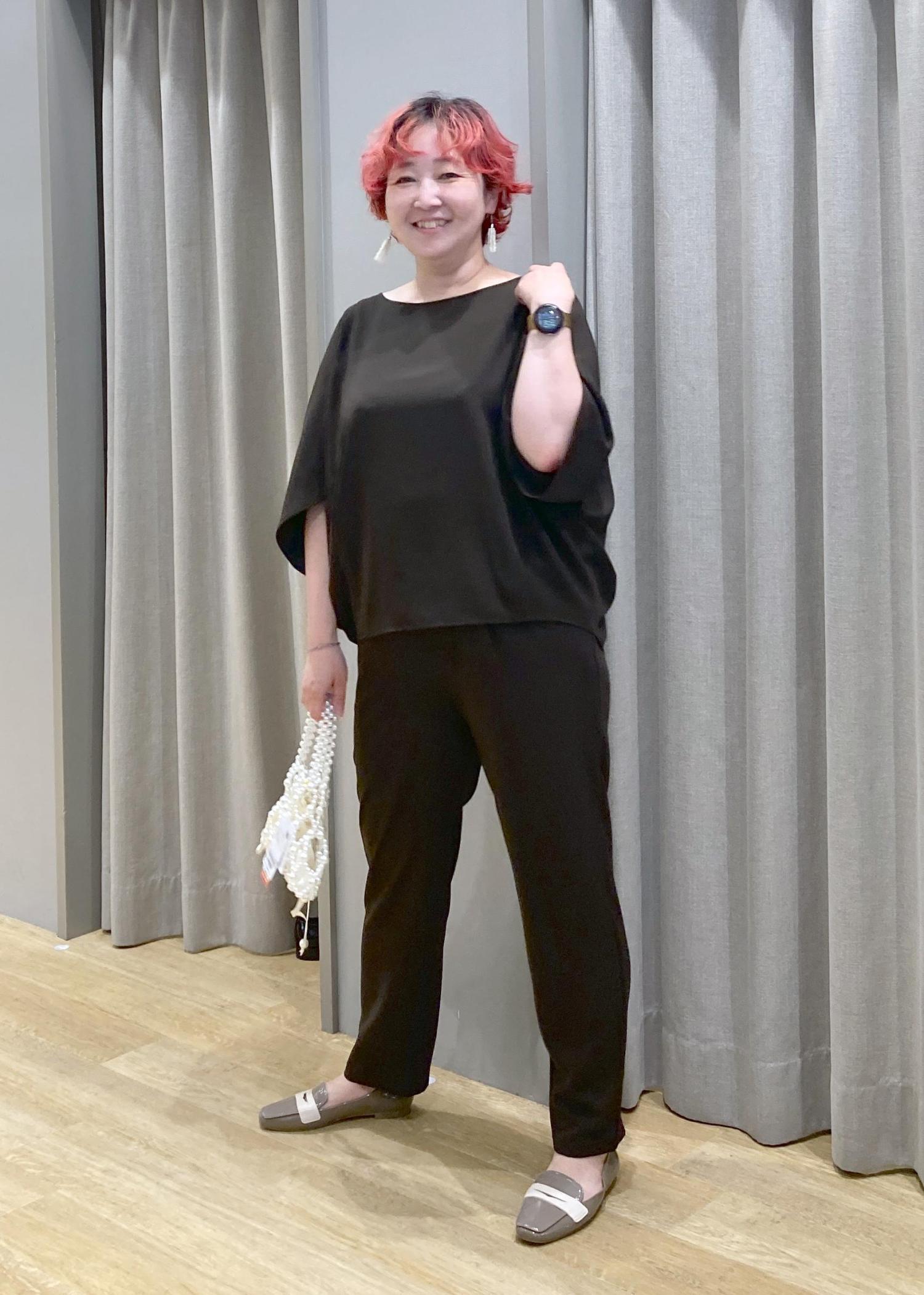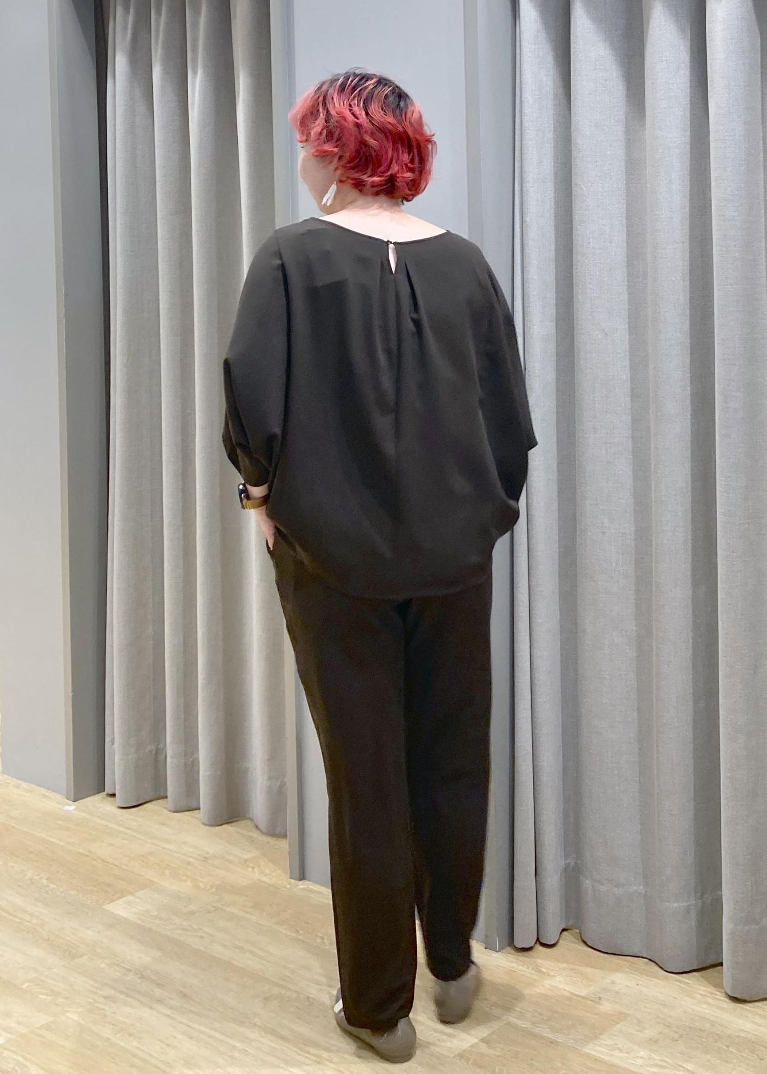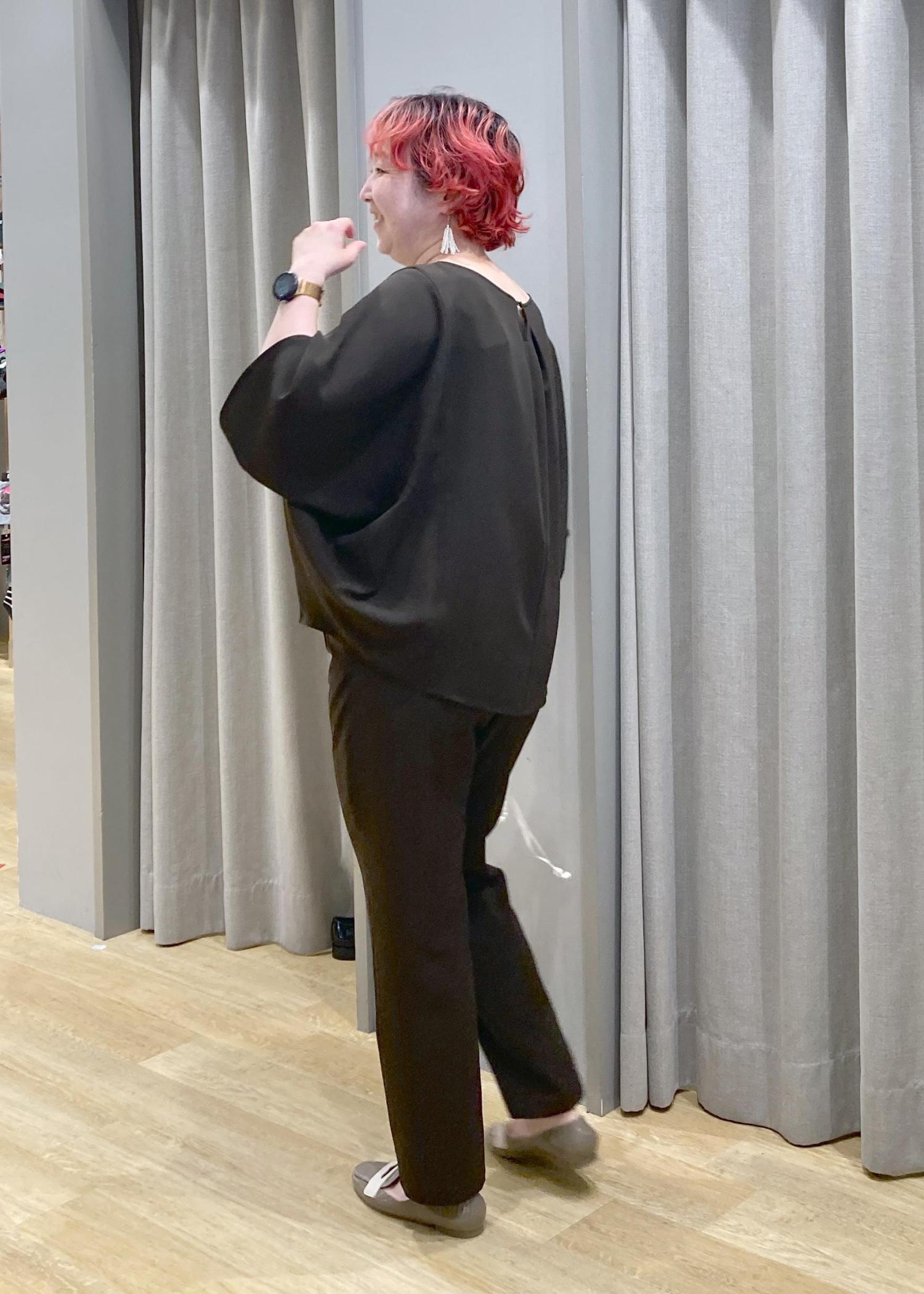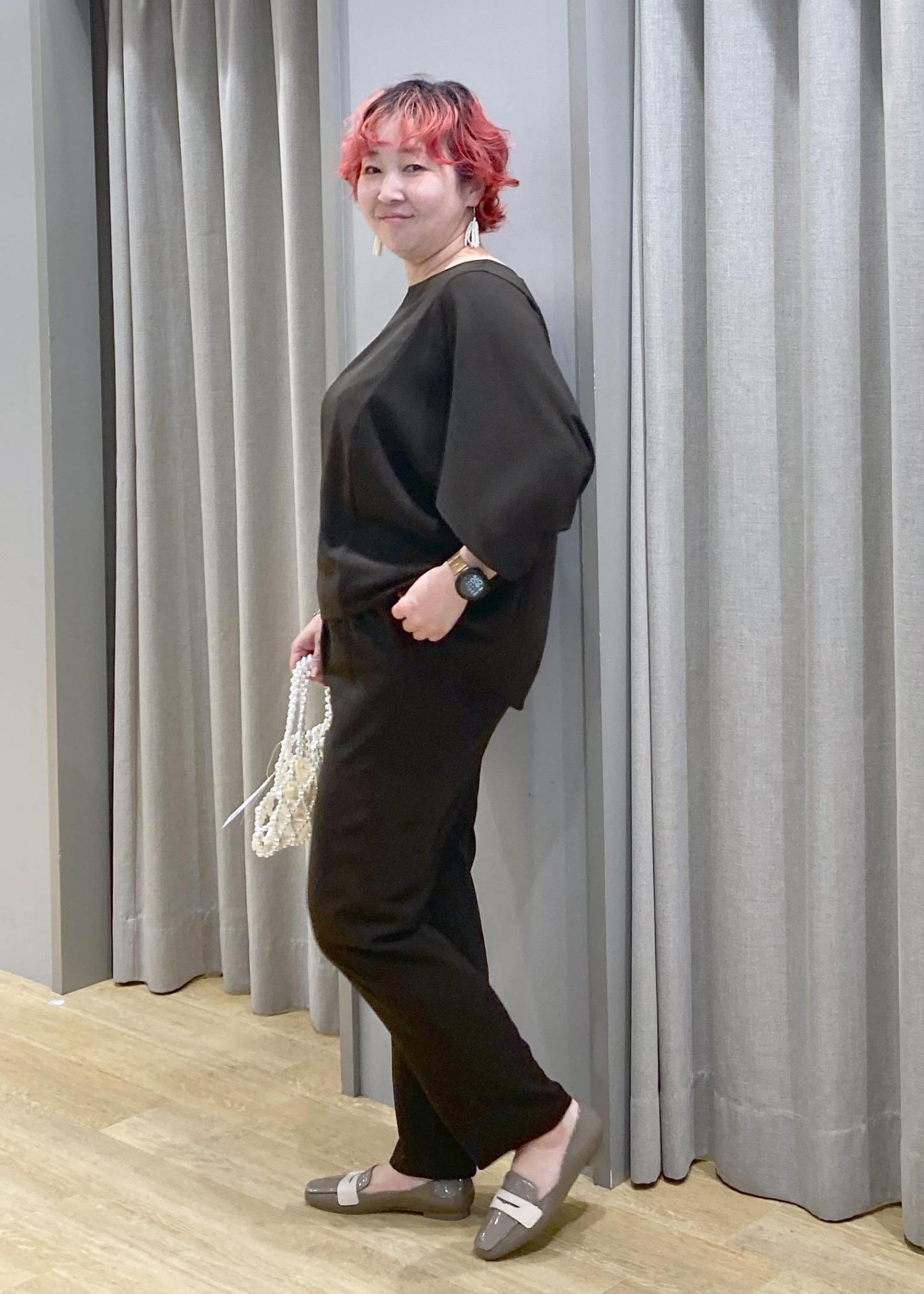 上下ブラックでも重たく見えないのは、袖の抜け感と足元の軽さのおかげ♪