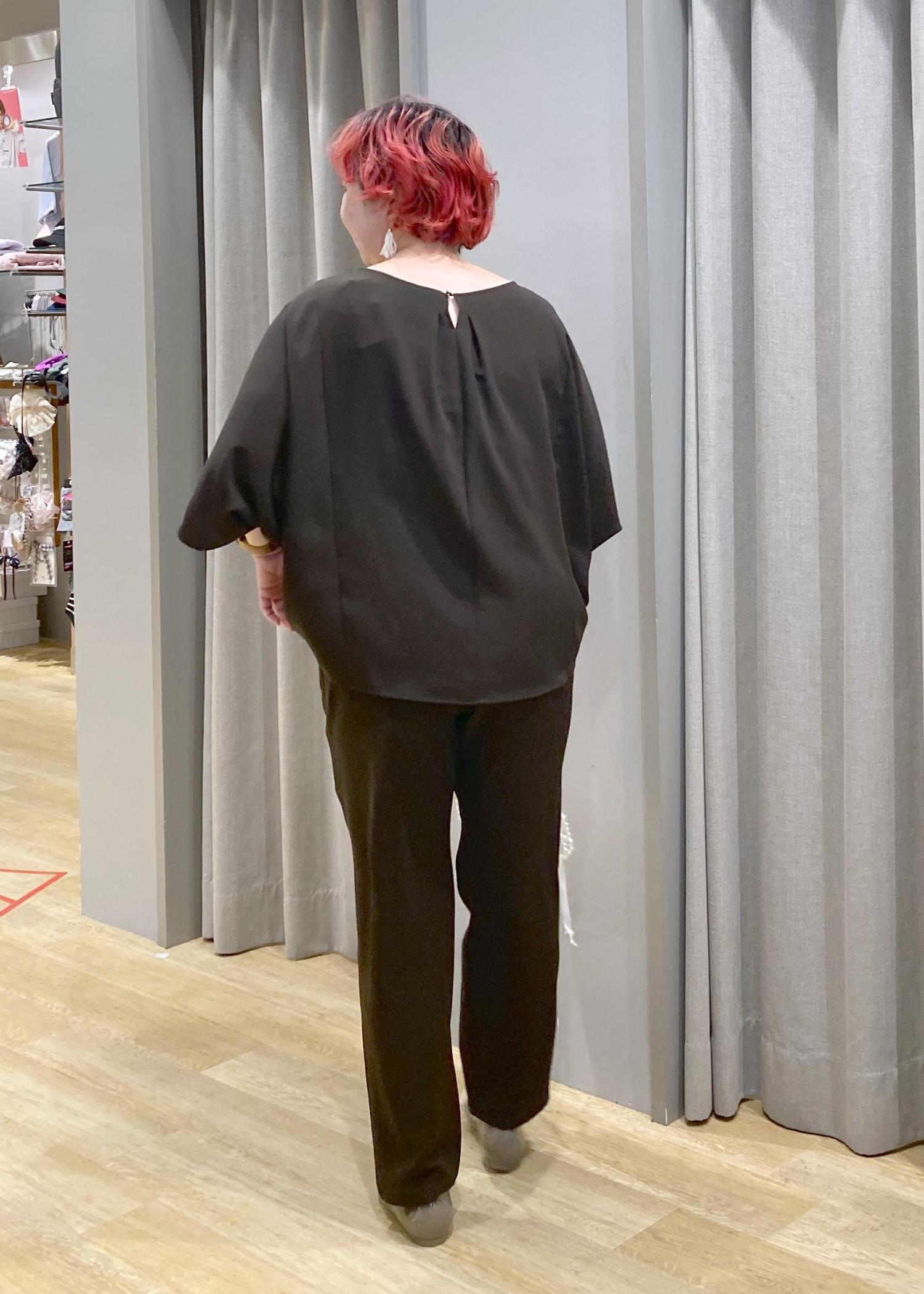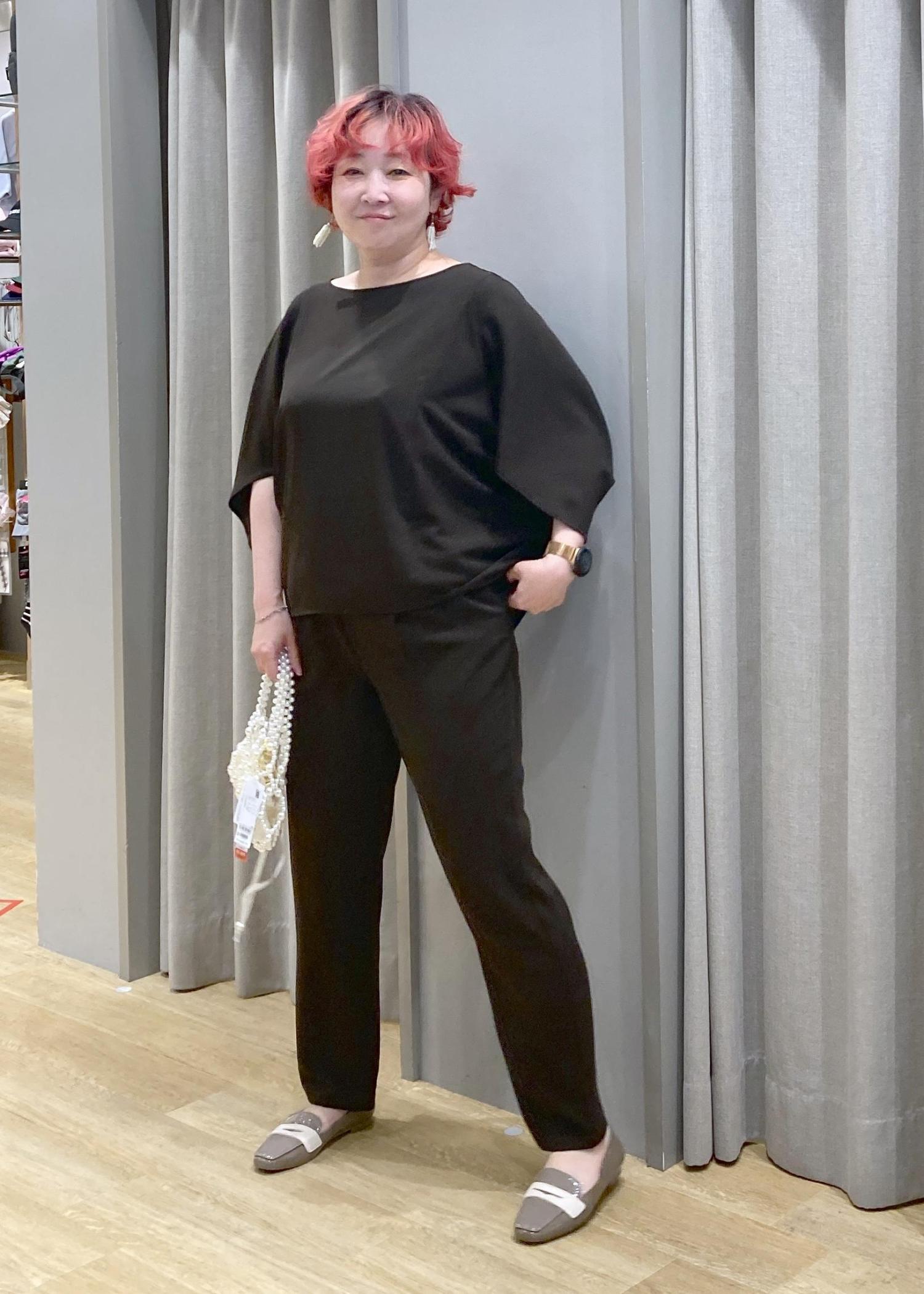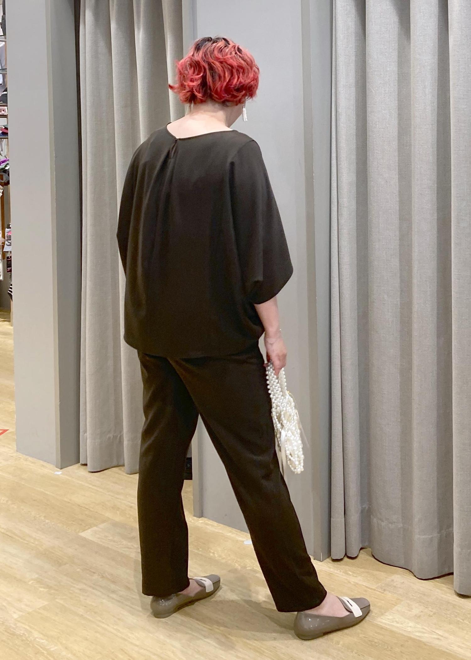 ゆるっとしたトップスは気になる二の腕やお腹まわりをさりげなくカバー。