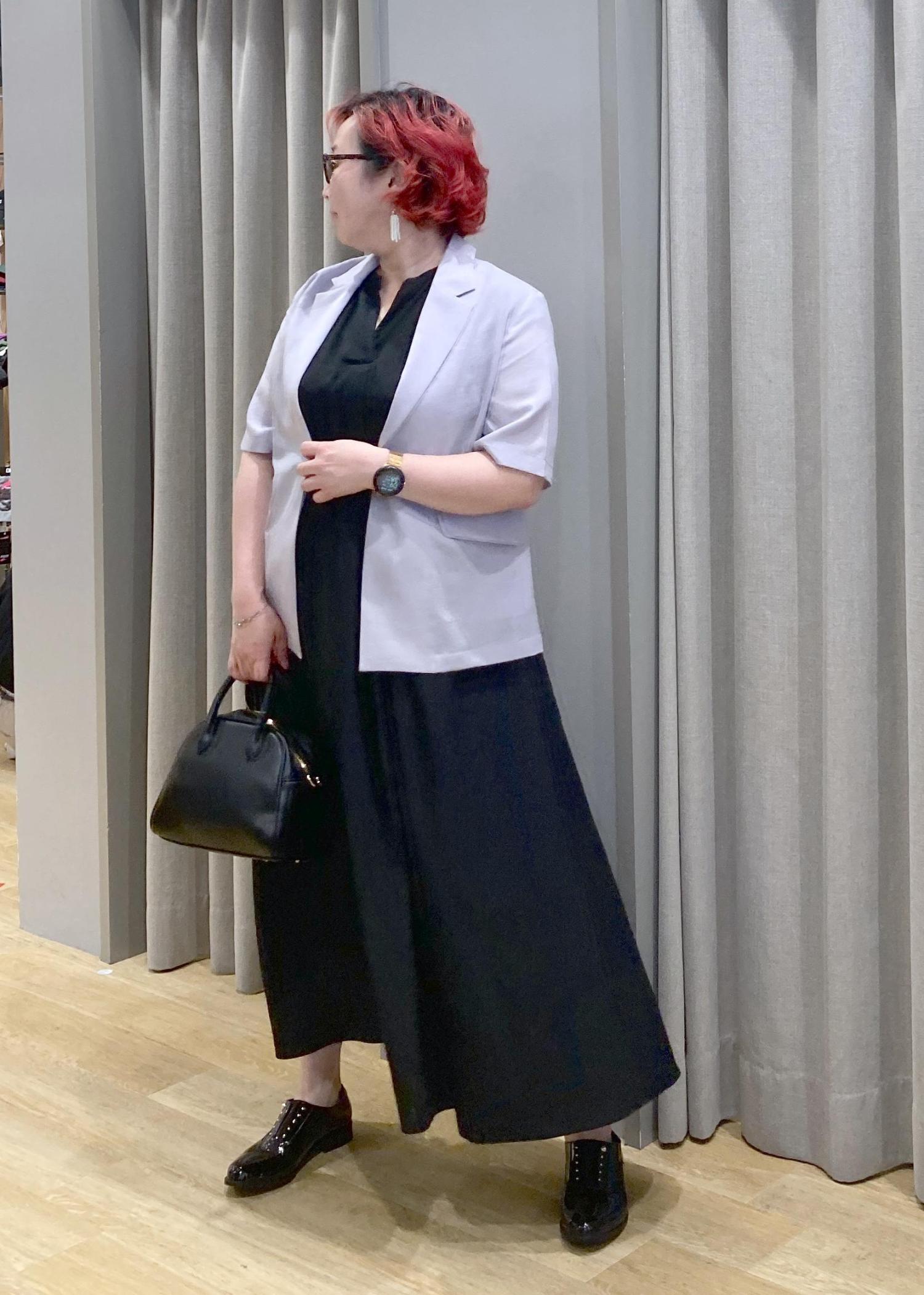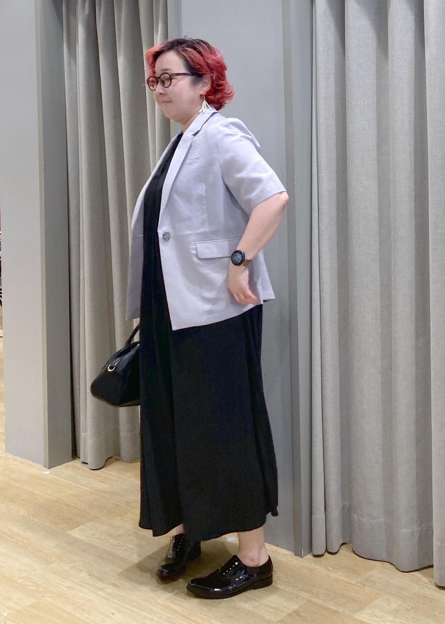 さらっと羽織れるライトジャケット×ゆったり黒ワンピの鉄板コンビ!