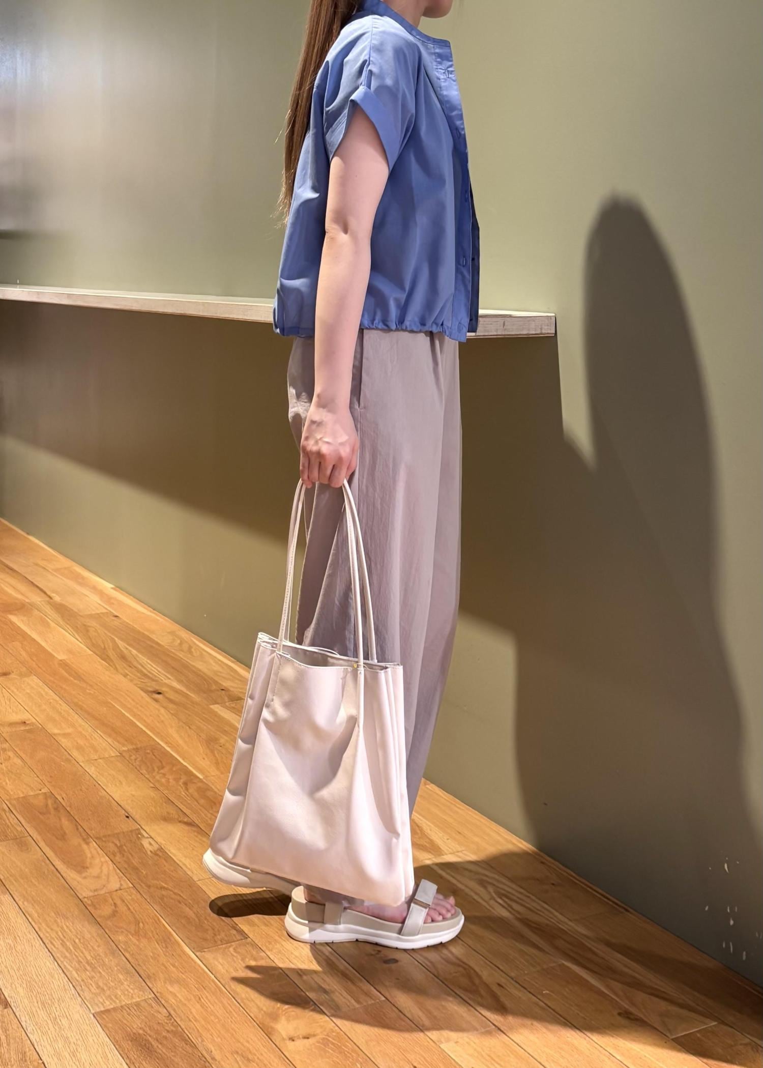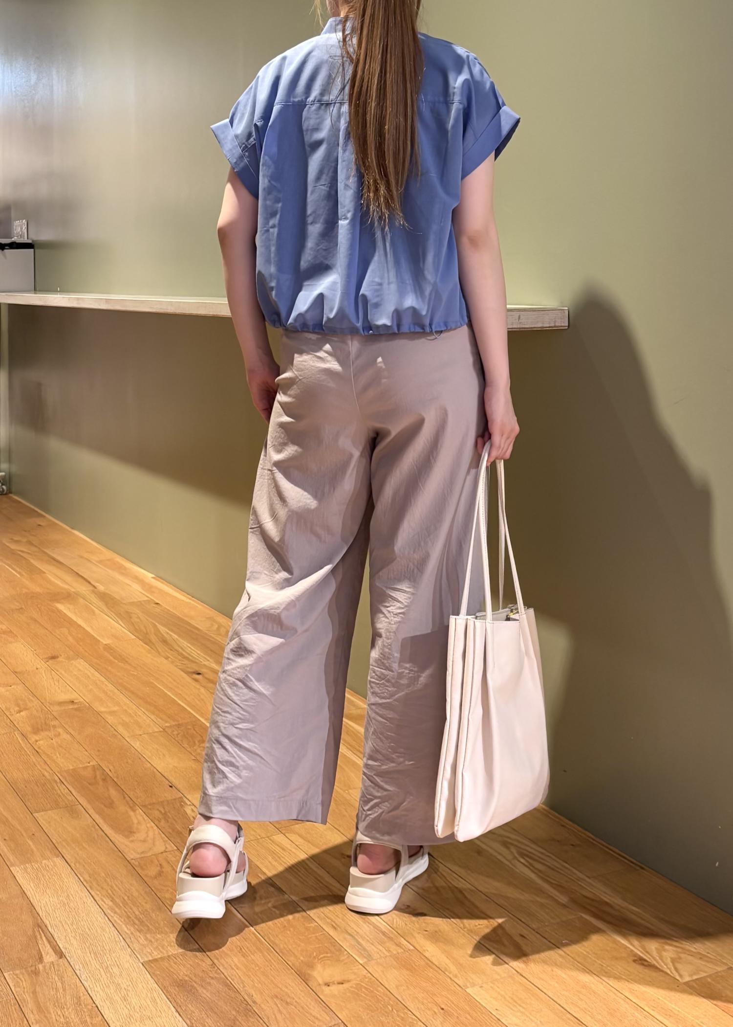 程よい透け感のあるクロップド丈のシャツにロゴプリントT、ナイロンイージーワイドパンツを合わせたカジュアルコーデです。