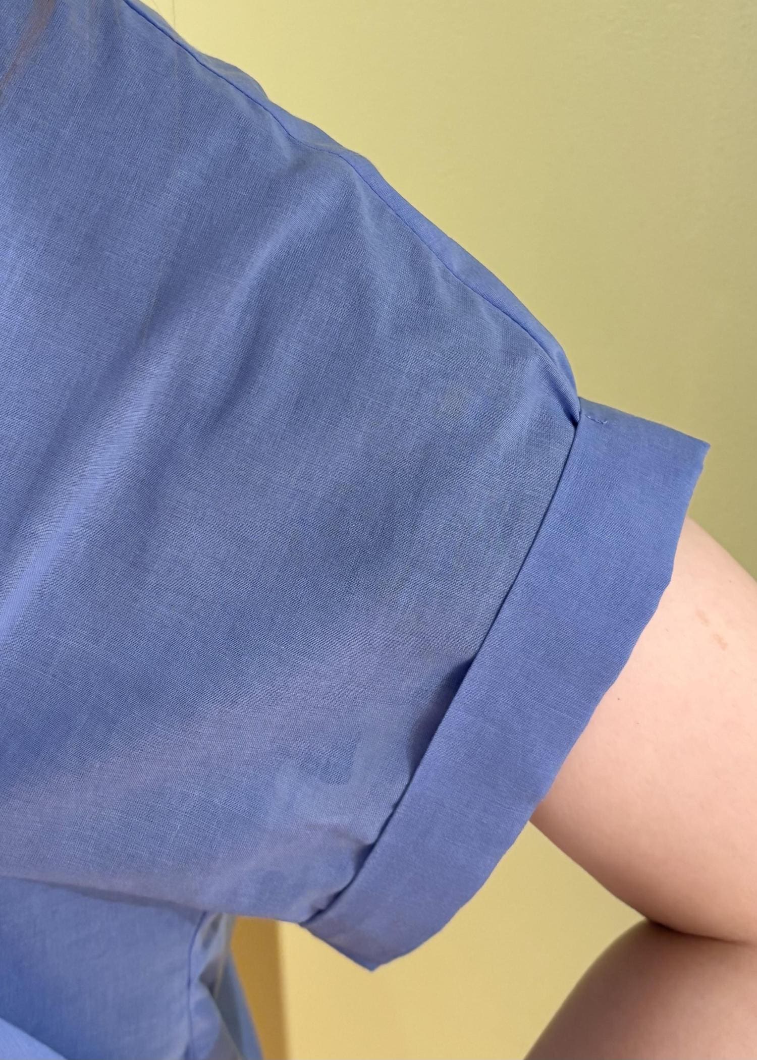 バルーンヘムシャツは袖丈が短いため、着用しているTシャツではTシャツの袖が出てしまうため、袖をロールアップしています。