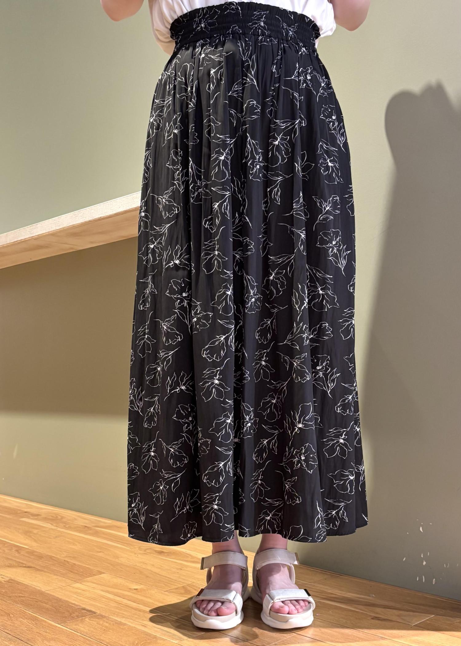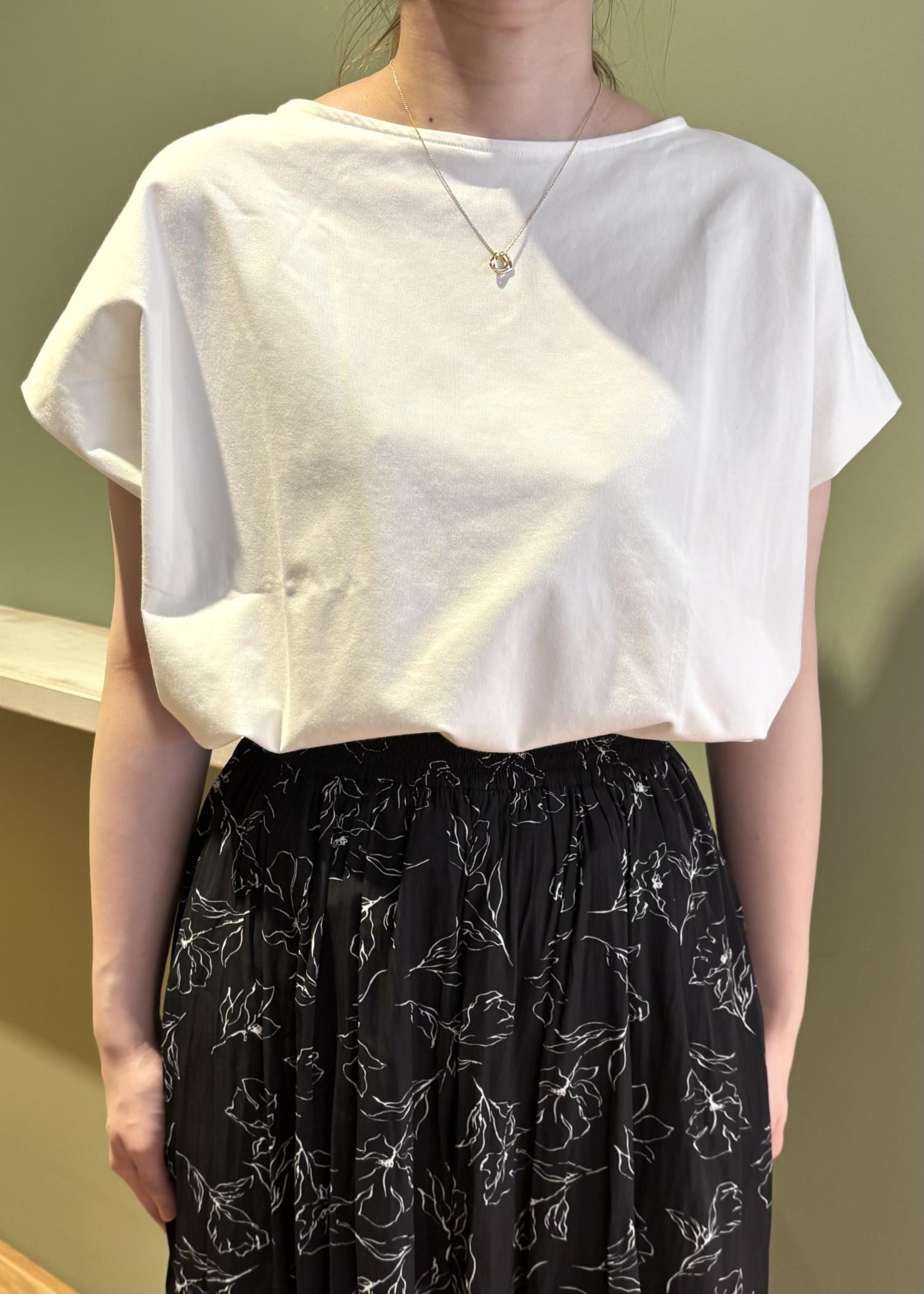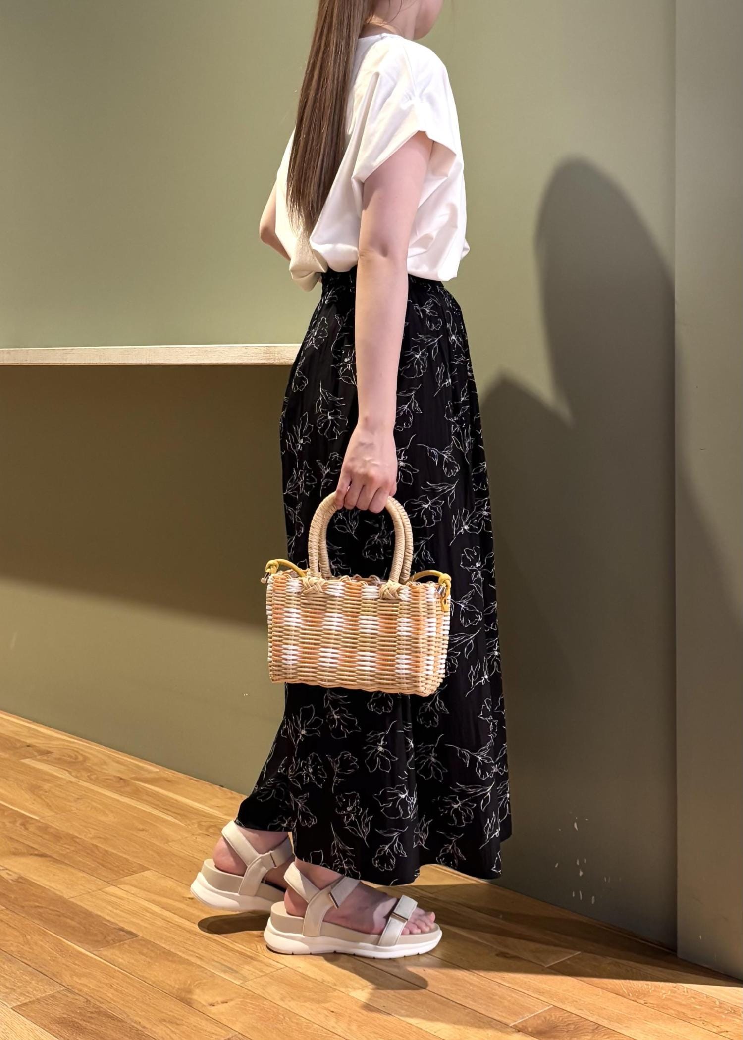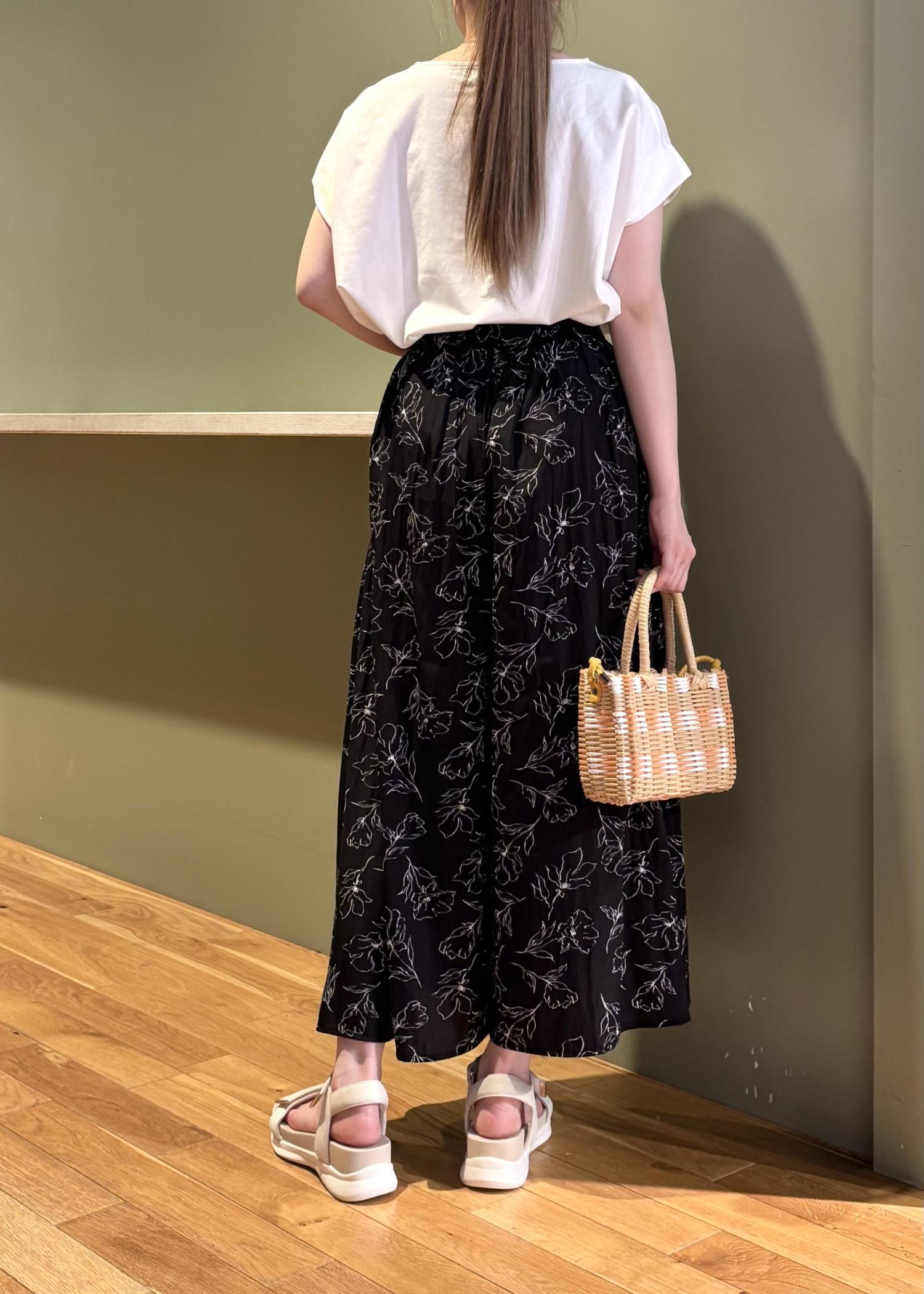二の腕がキレイに見えるマルチファンクショントップスに、サラサラとした夏らしい生地感のアソート柄スカーチョを合わせた、キレイめカジュアルなコーディネートです。