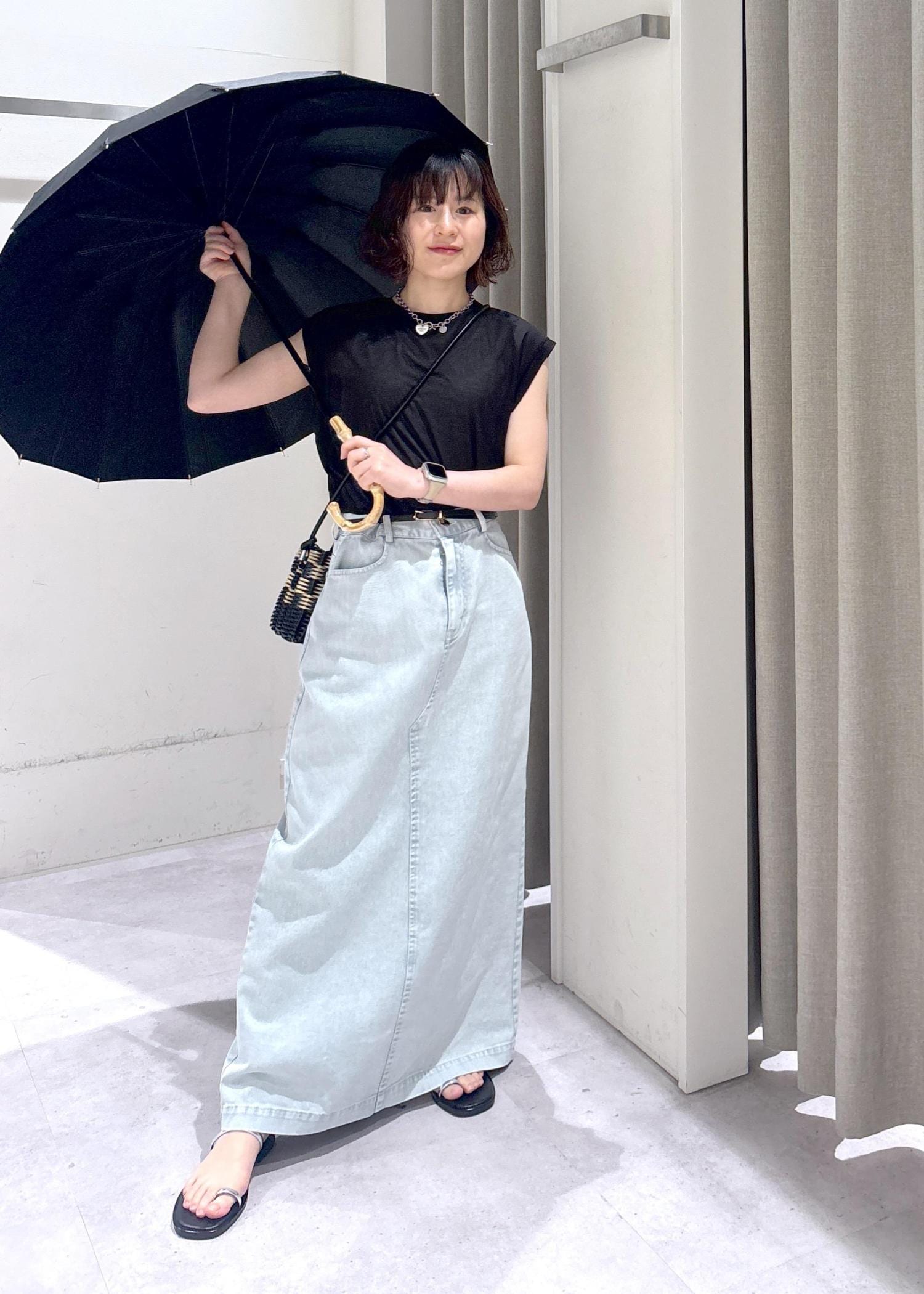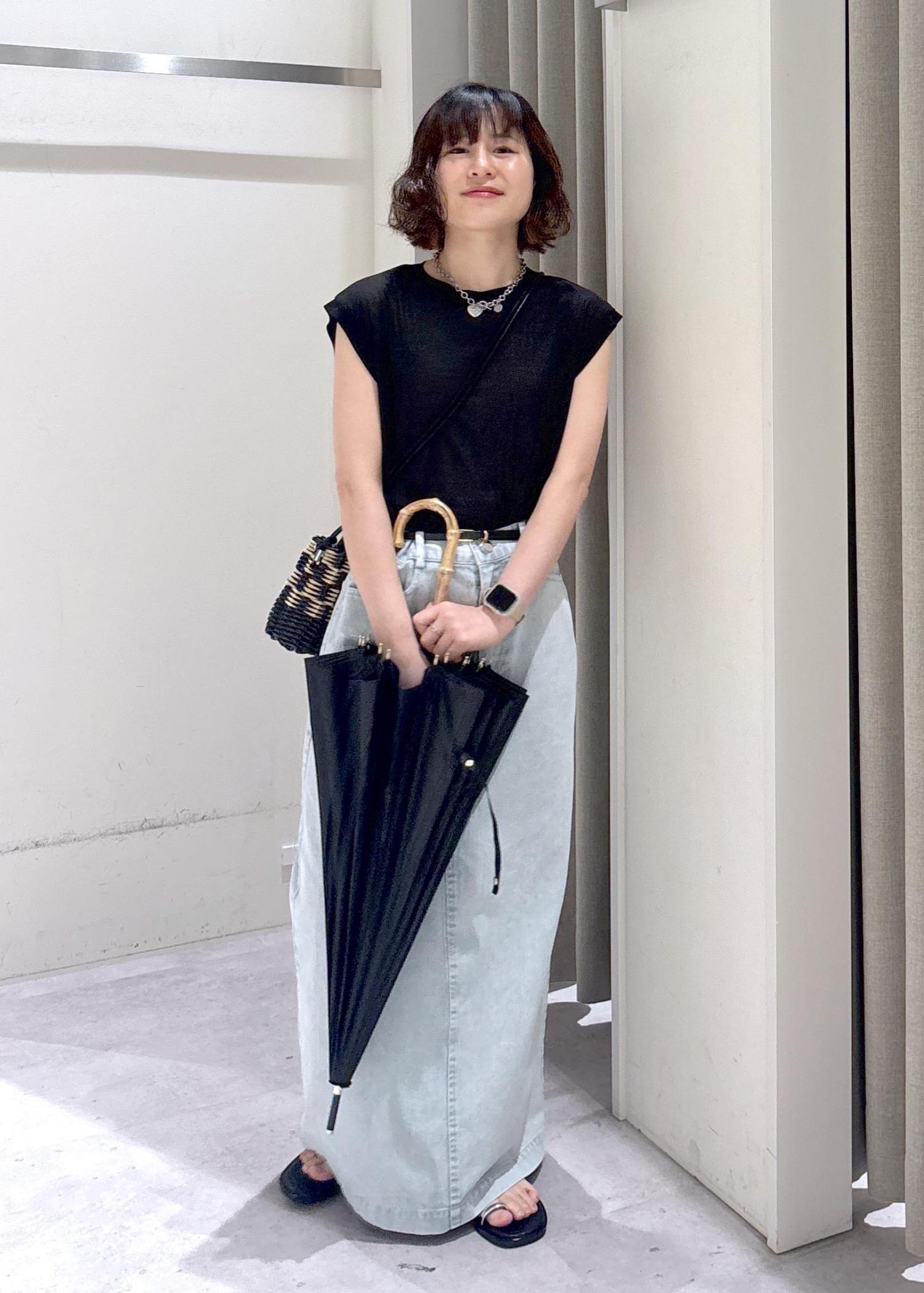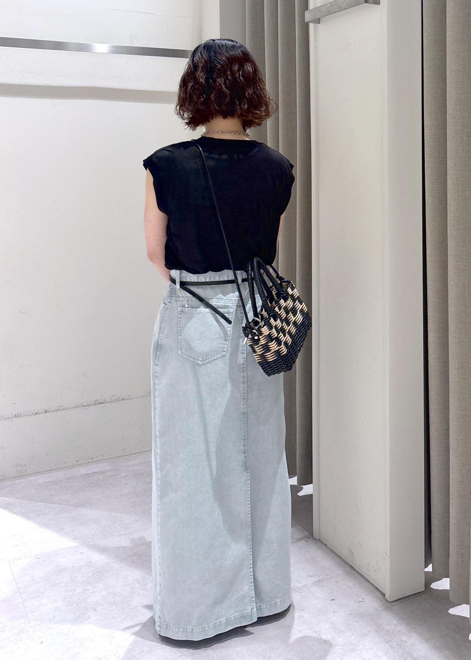 肌離れのいいシアーTと、爽やかなカラーのデニムスカートで視覚的にも涼しげに仕上げました◎