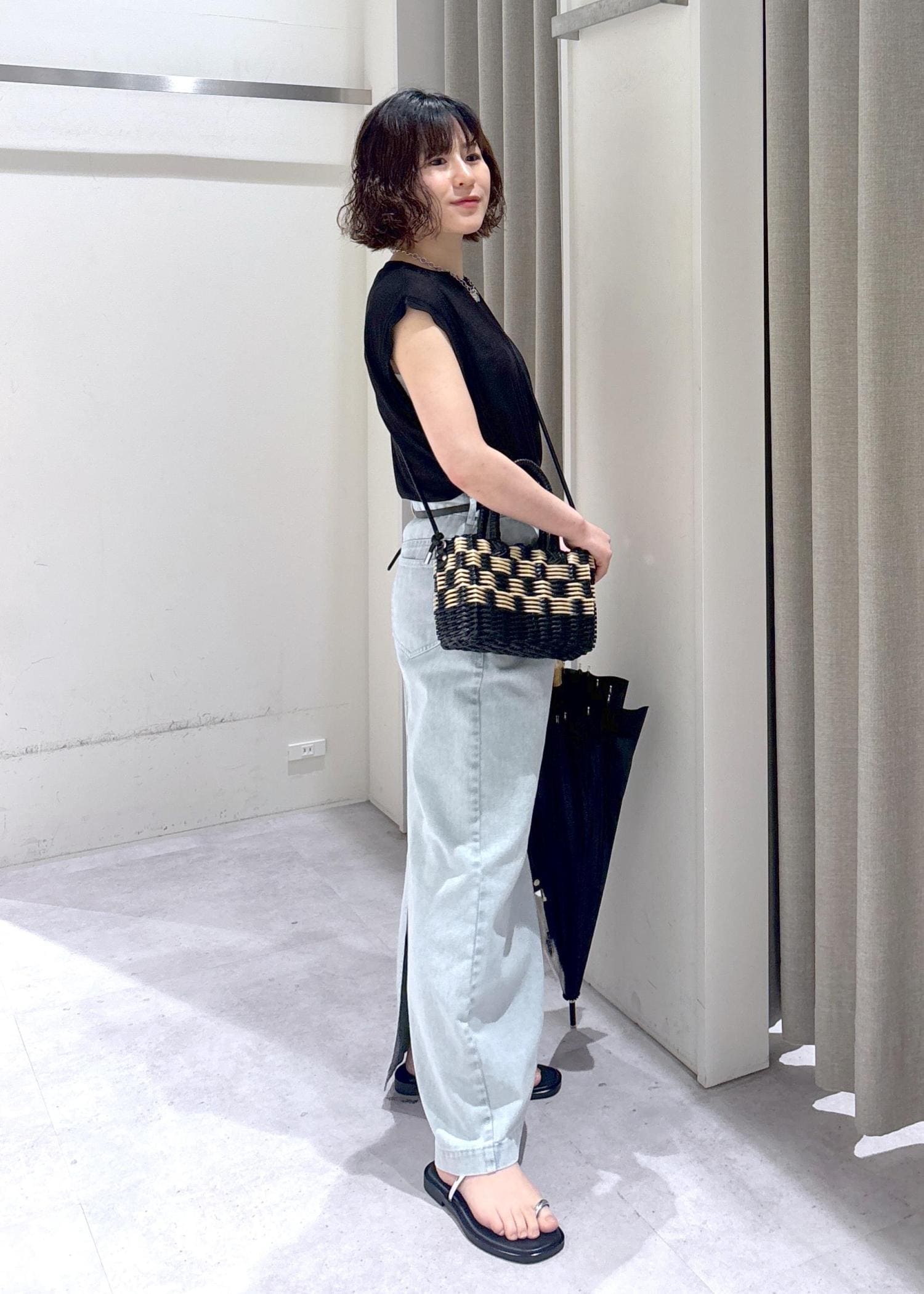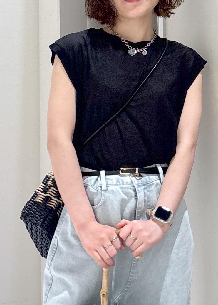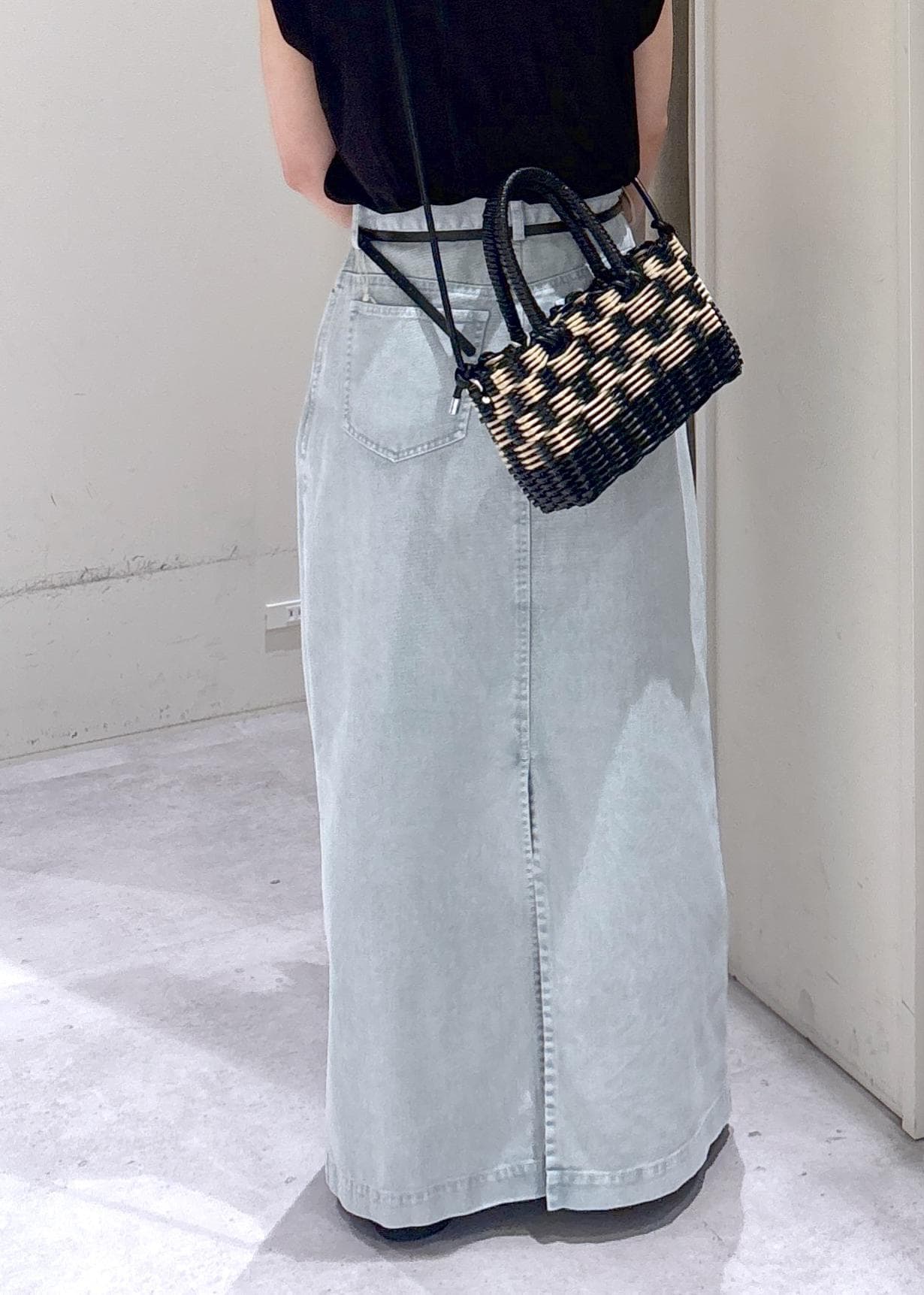 肌離れのいいシアーTと、爽やかなカラーのデニムスカートで視覚的にも涼しげに仕上げました◎