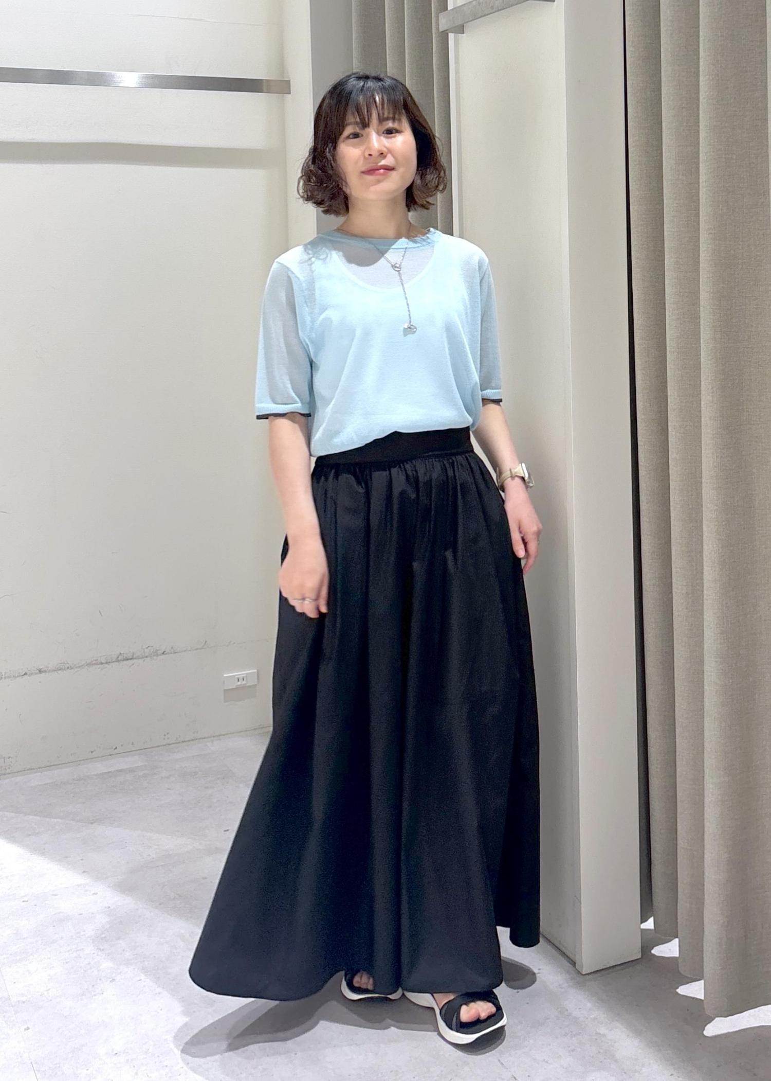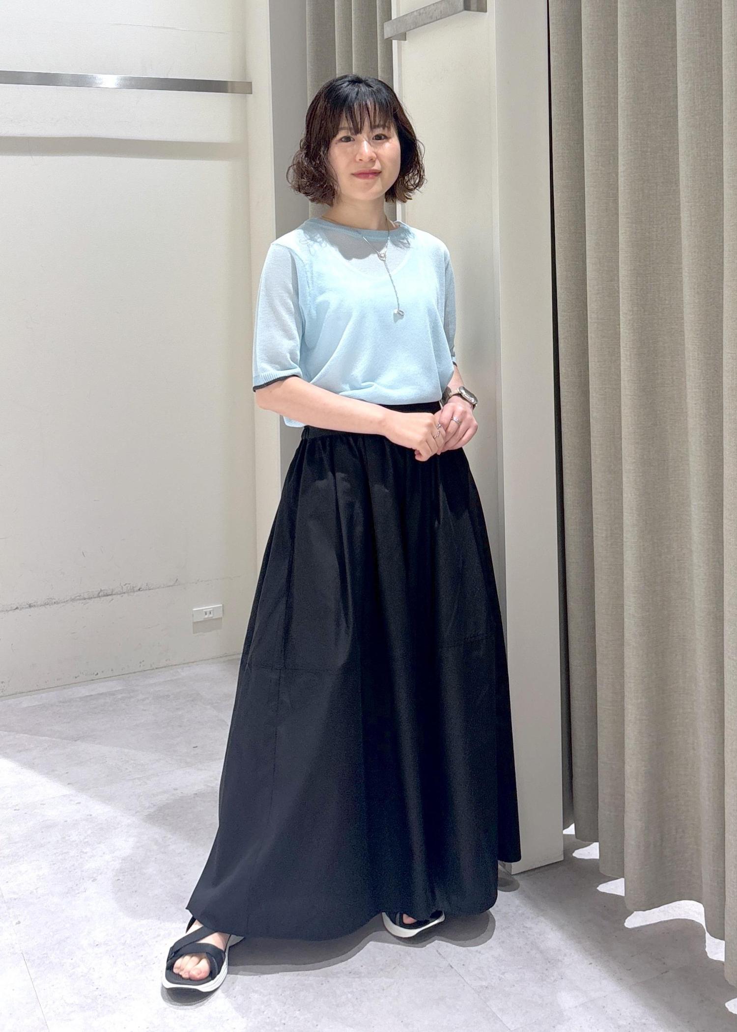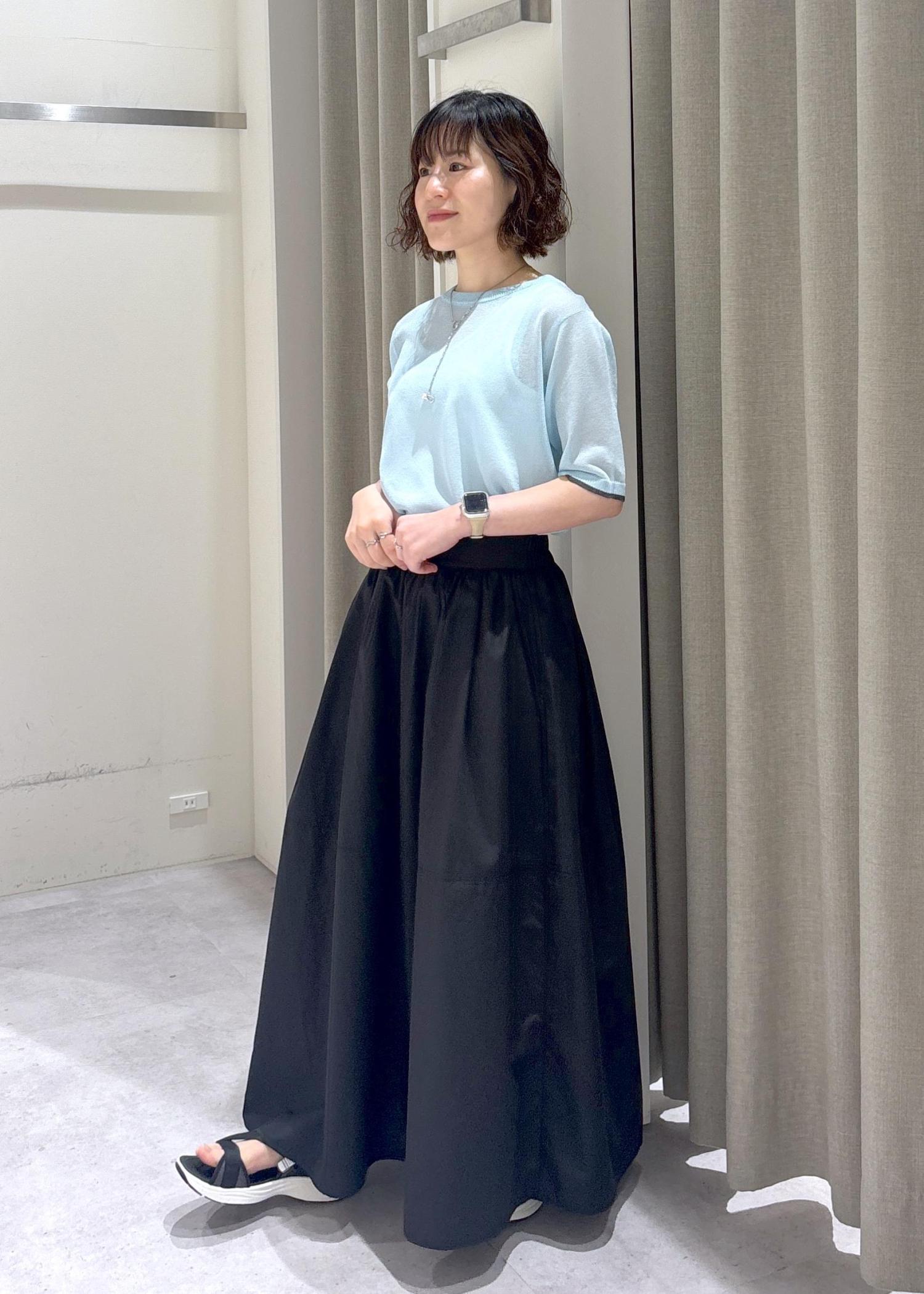 透け感とシャリ感のあるニット×ボリューム控えめな黒スカートで、小柄さんでもバランス良く着こなせるスタイリングに!