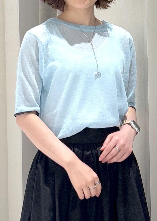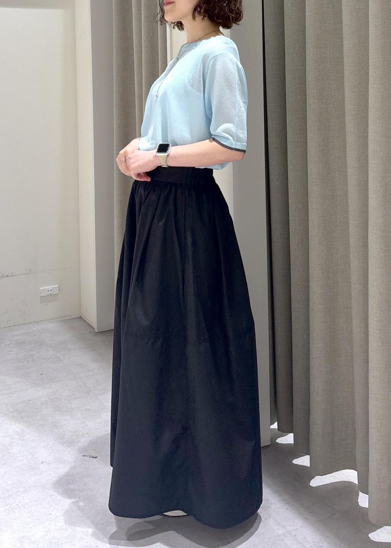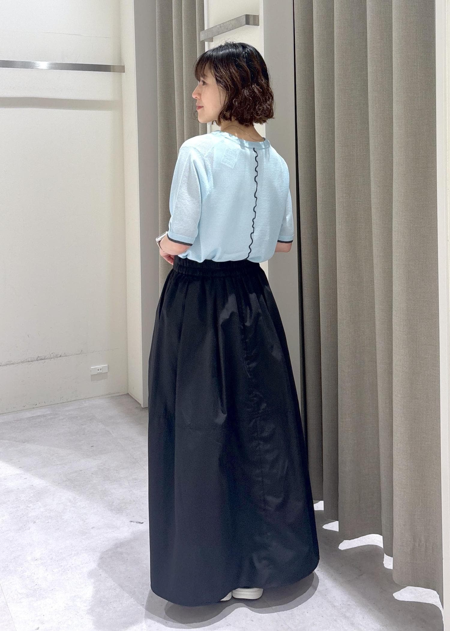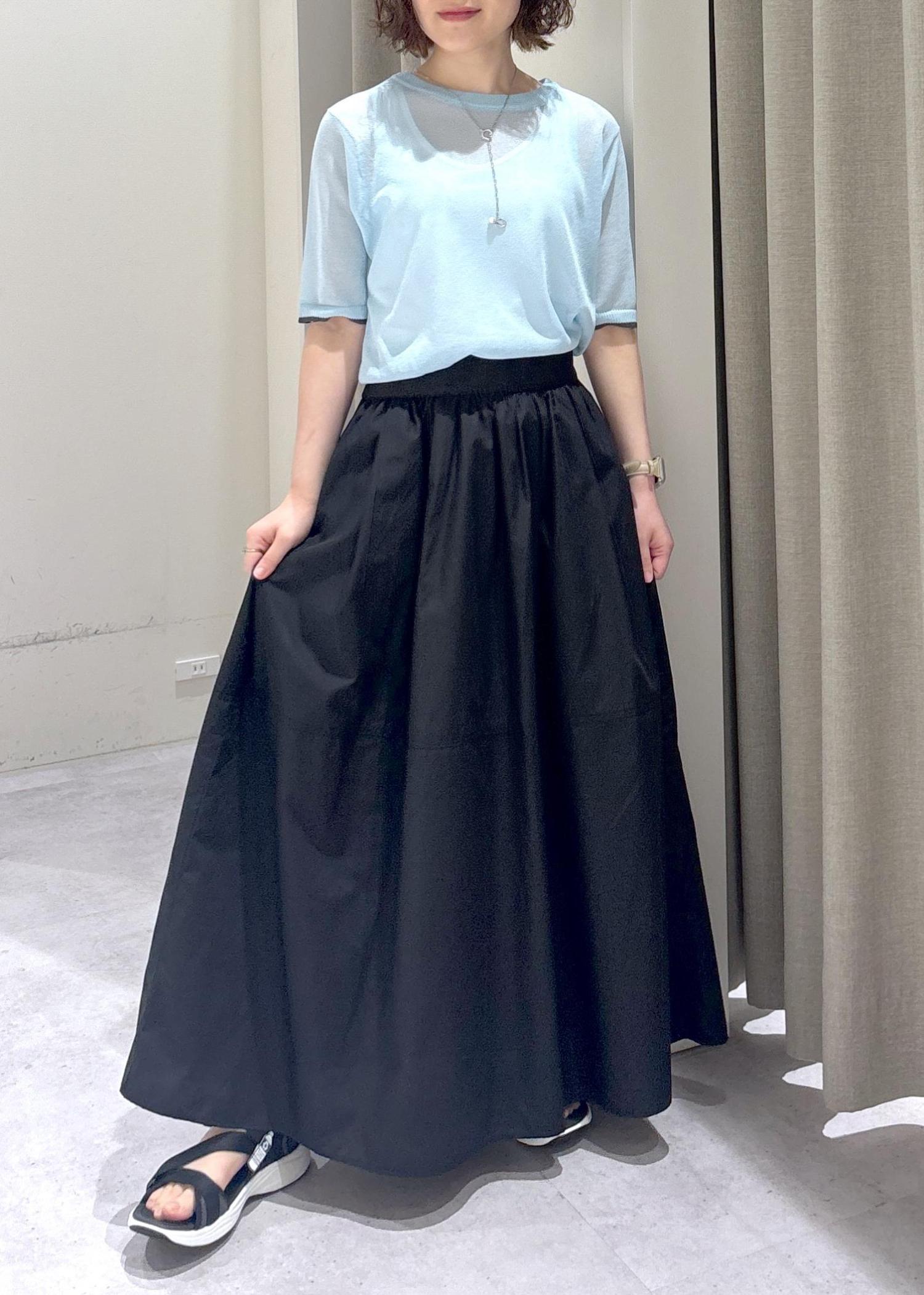 透け感とシャリ感のあるニット×ボリューム控えめな黒スカートで、小柄さんでもバランス良く着こなせるスタイリングに!