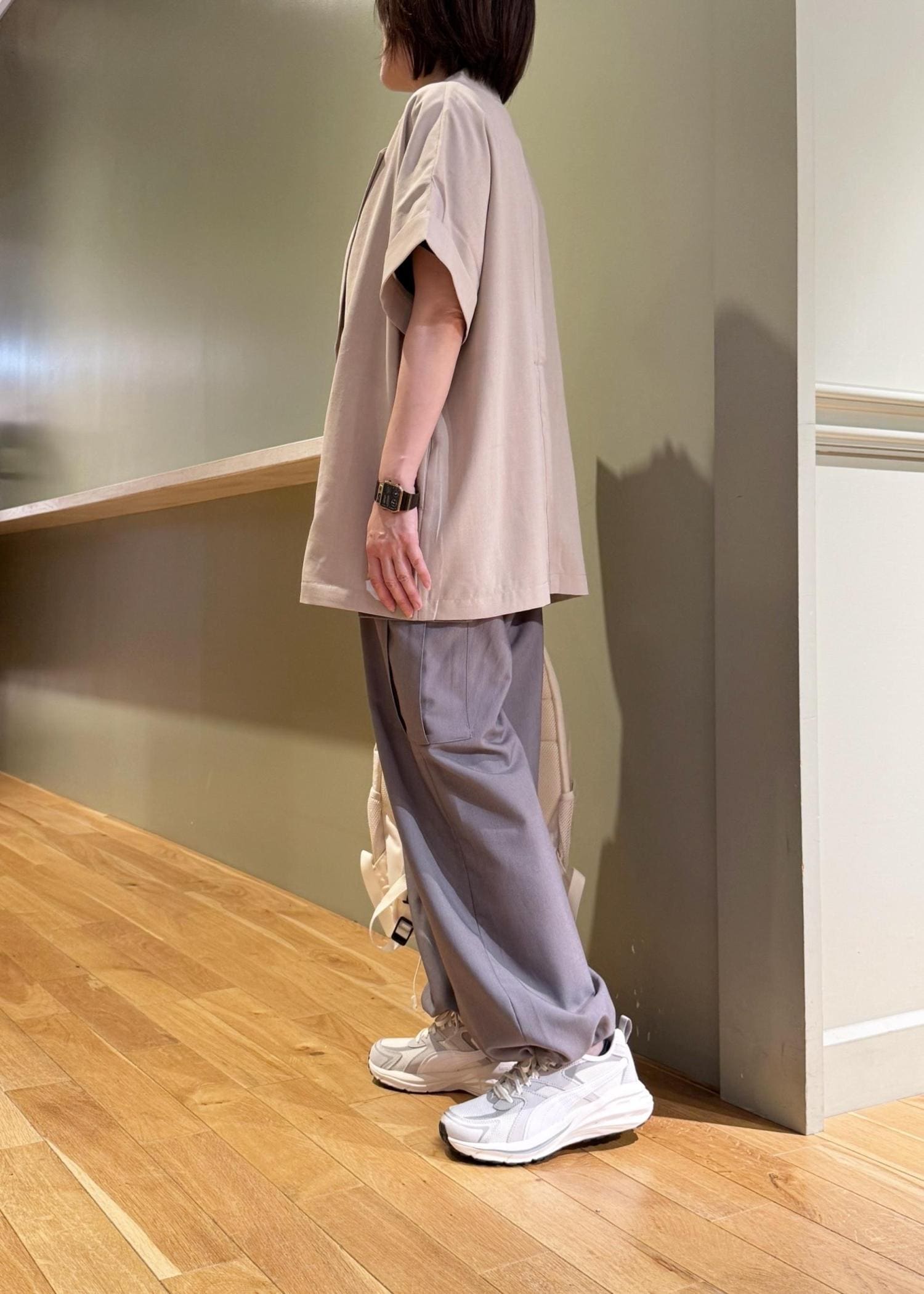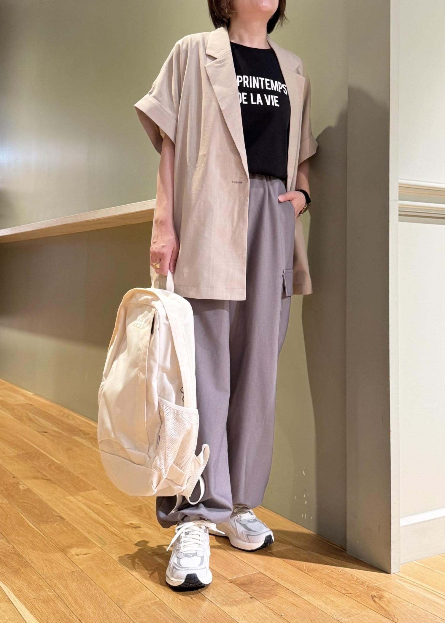 ドルマンスリーブのゆったりした半袖ジャケットにカーゴパンツを合わせたメンズライクなコーデです。
