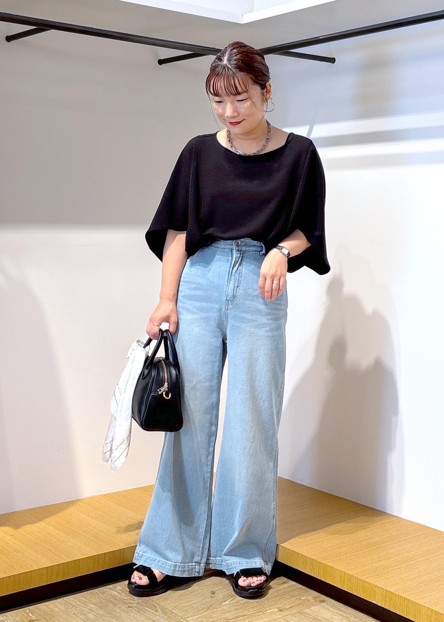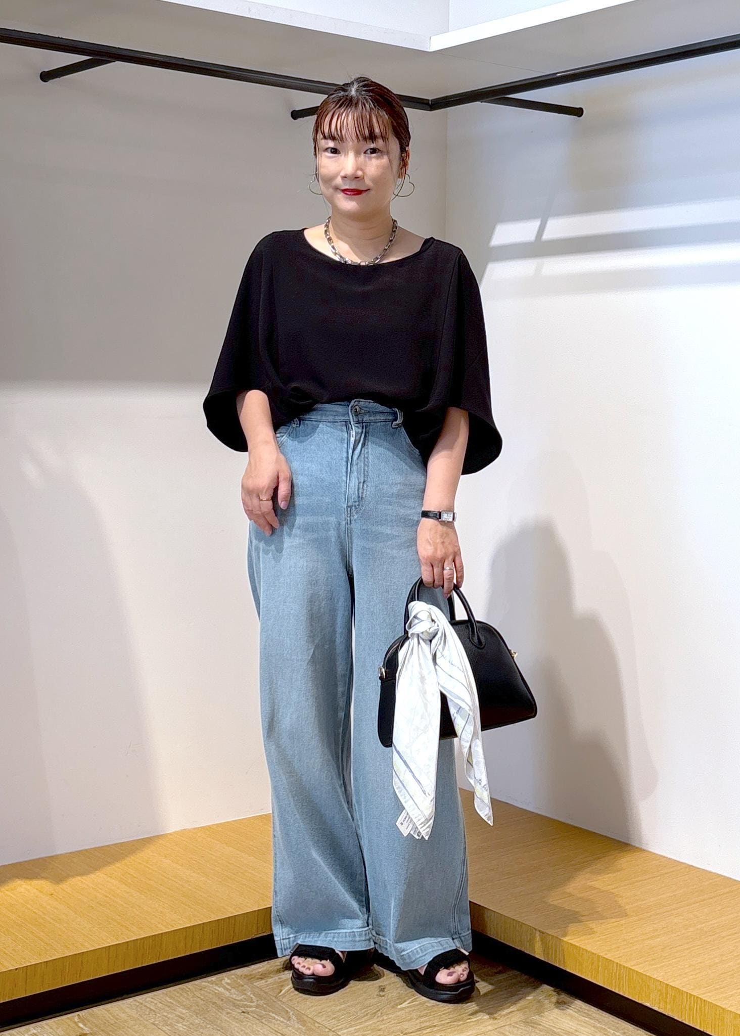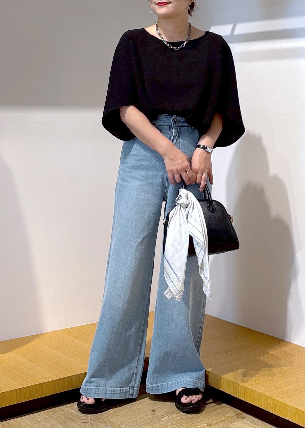 デニムは薄いブルーにして黒のトップスが重たくならないよう夏らしくしてみました。