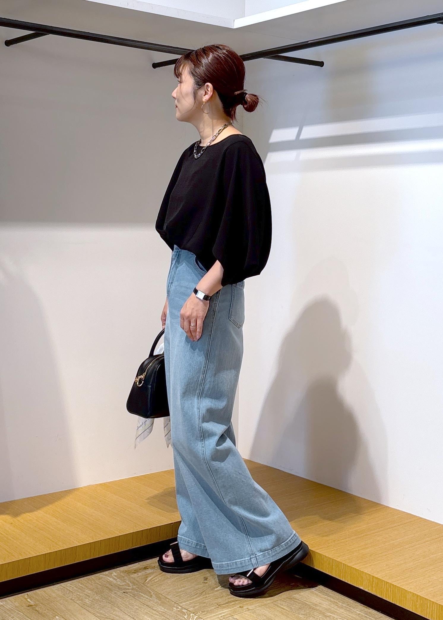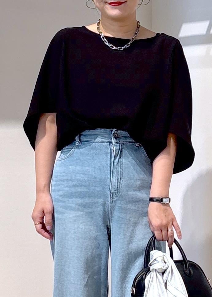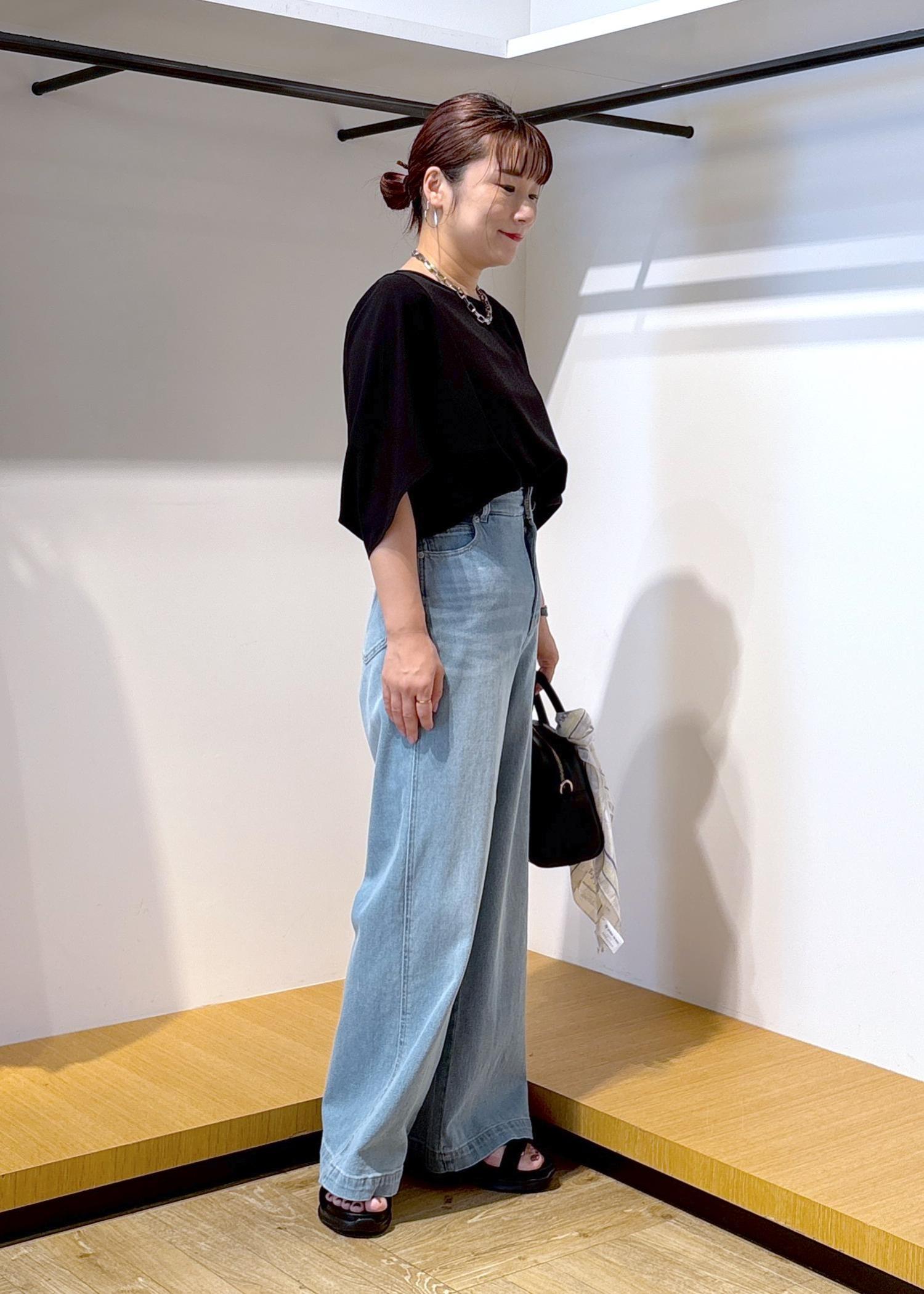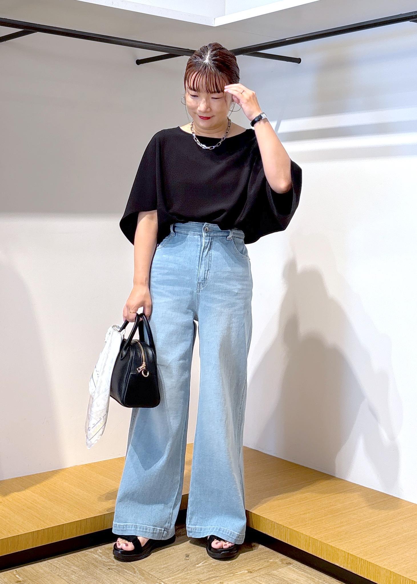 デニムは薄いブルーにして黒のトップスが重たくならないよう夏らしくしてみました。