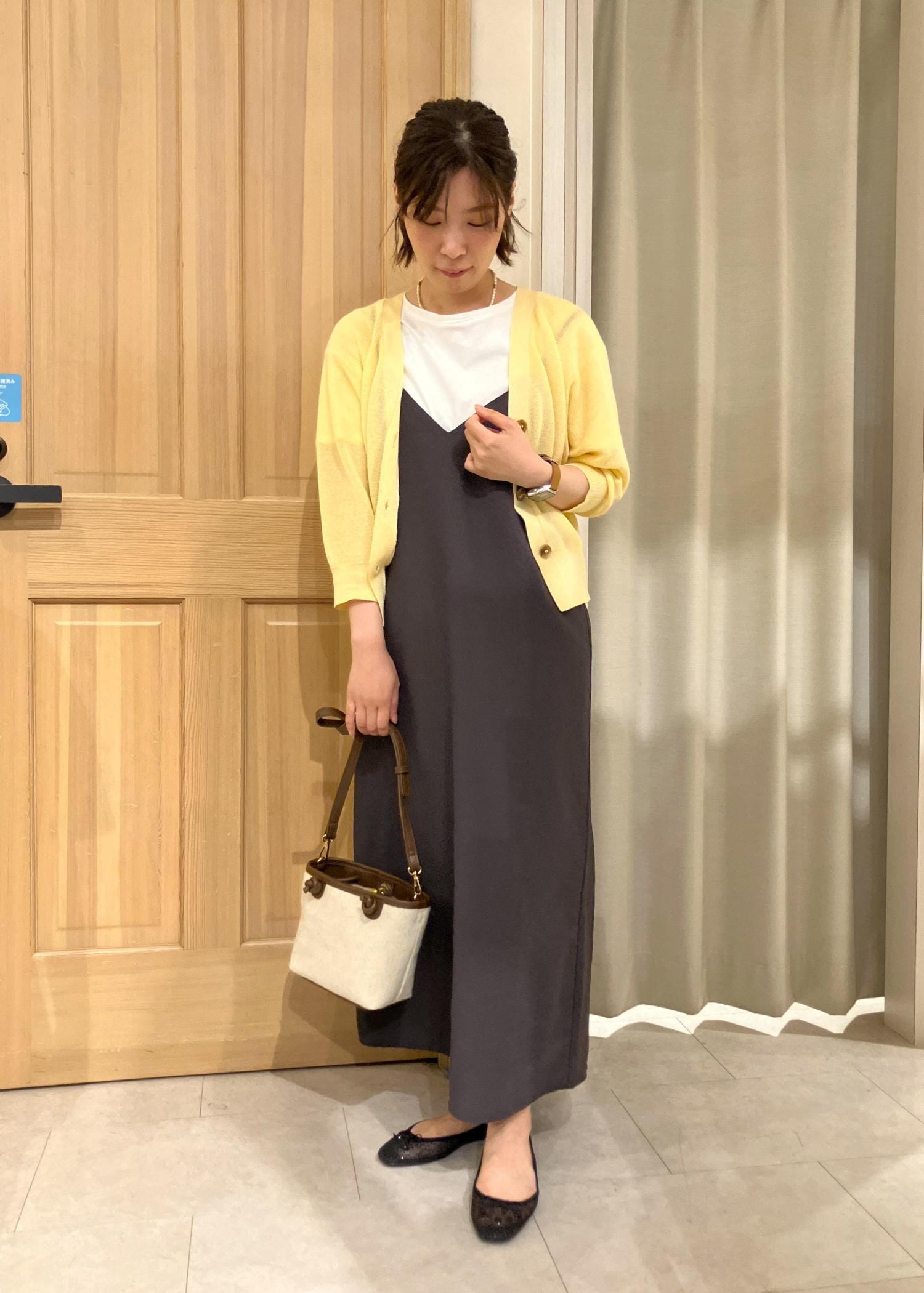 イエローのカーディガンをアクセントにしたモノトーンベースのキャミワンピコーデ。