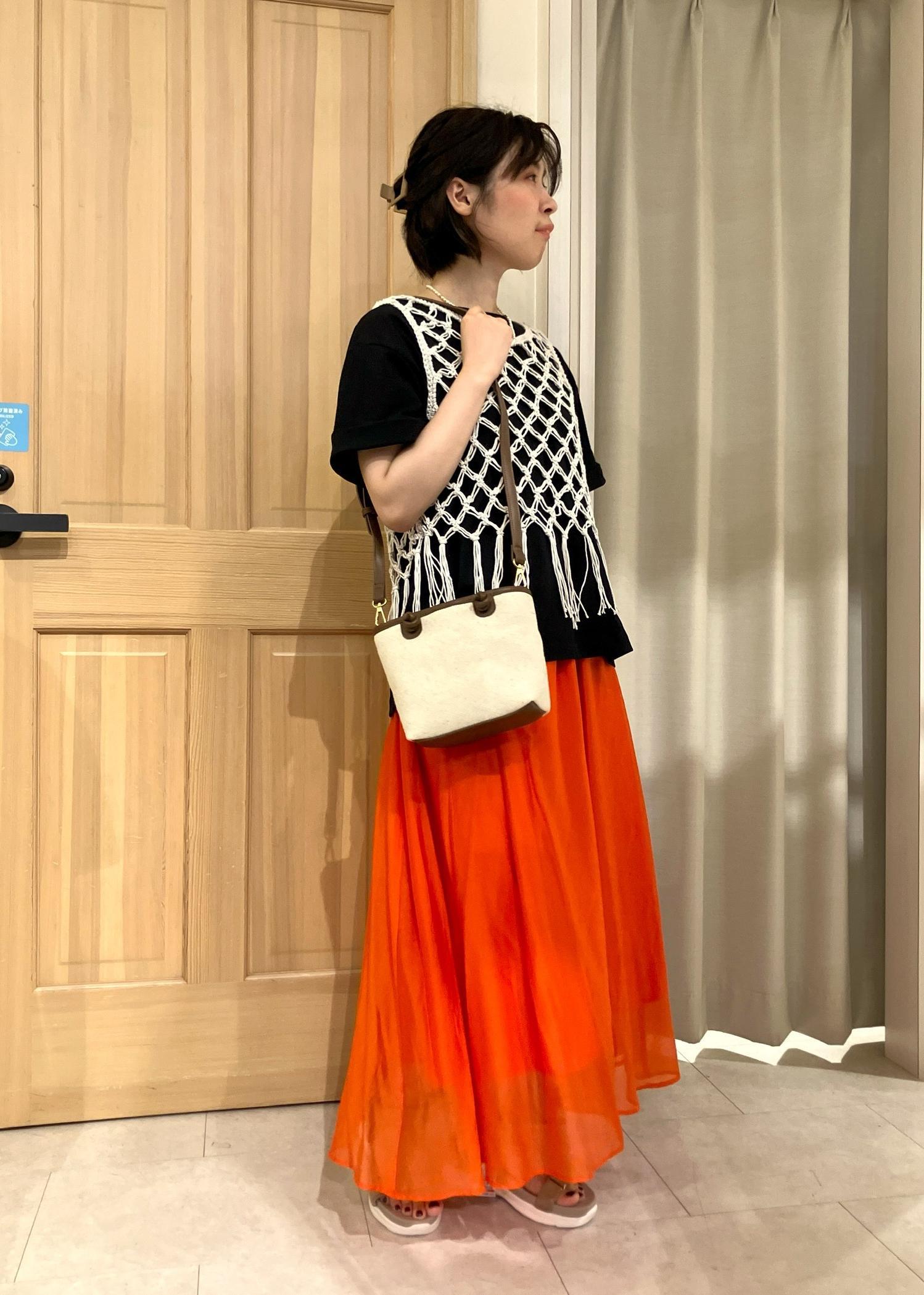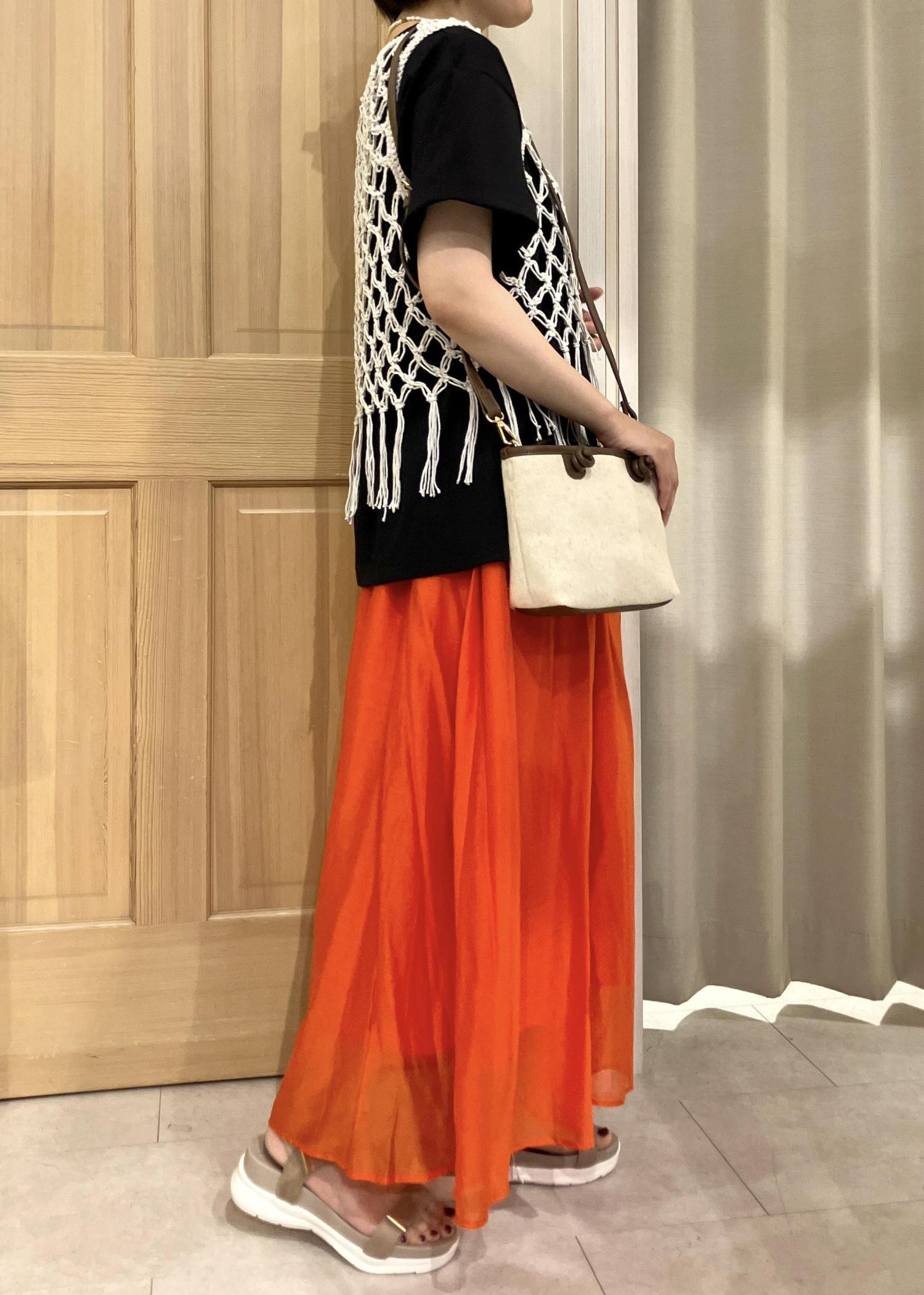 鮮やかなオレンジのスカートを主役にしたカジュアルコーデ。