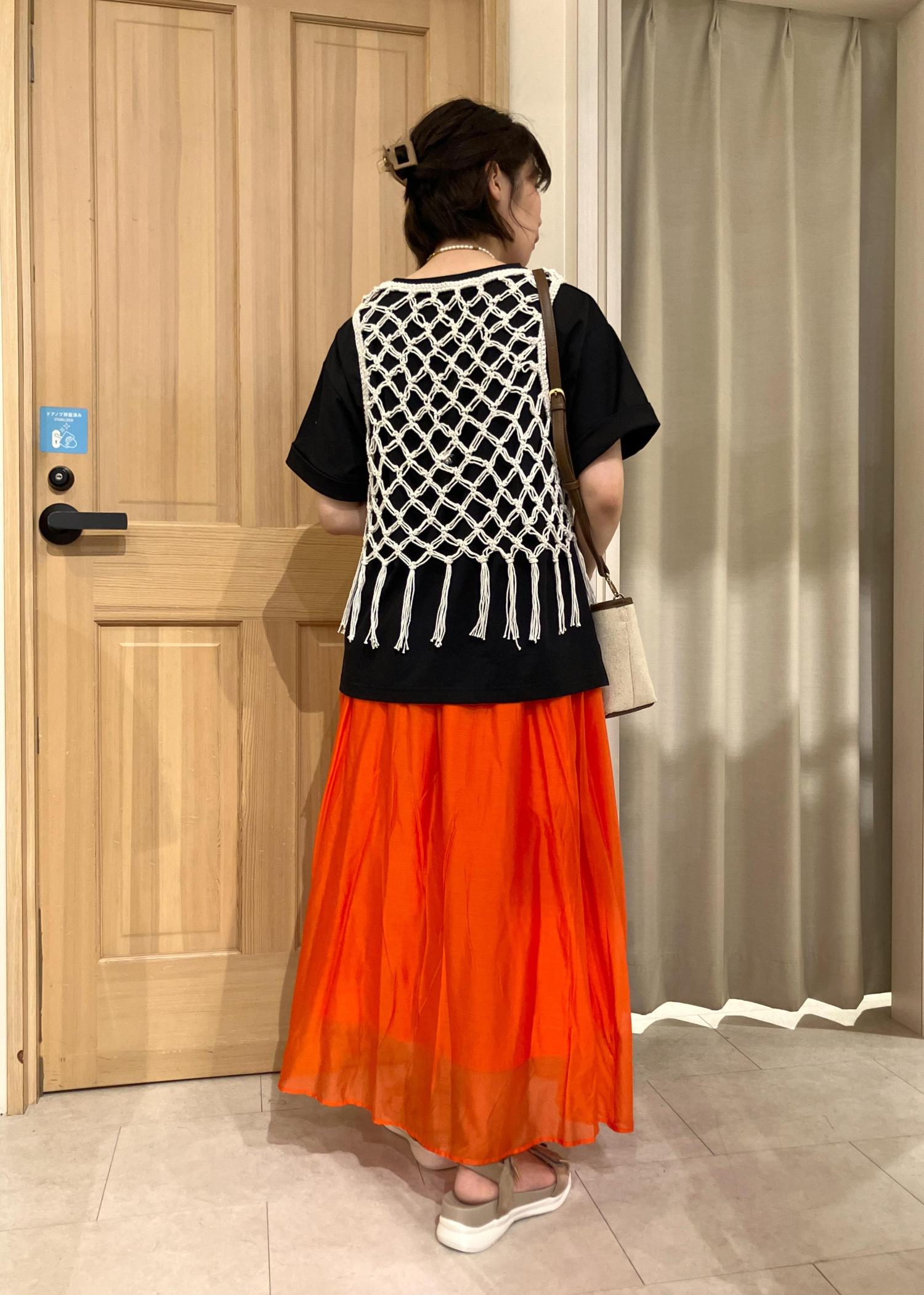 トップスも黒のTシャツにマクラメ風のビスチェを重ね、スカートに負けないメリハリのあるスタイルにまとめました。