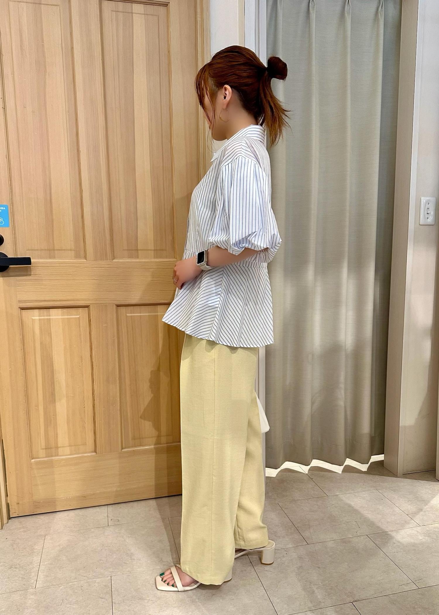 ストライプシャツに大人気の美easyシリーズのワイドパンツを合わせました。