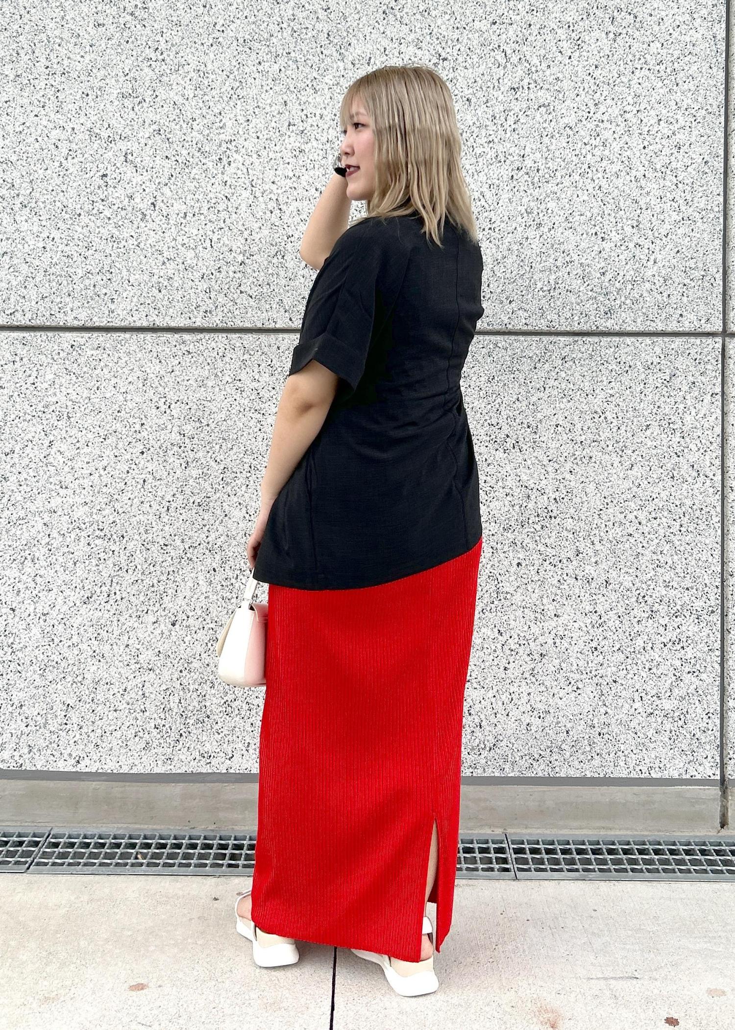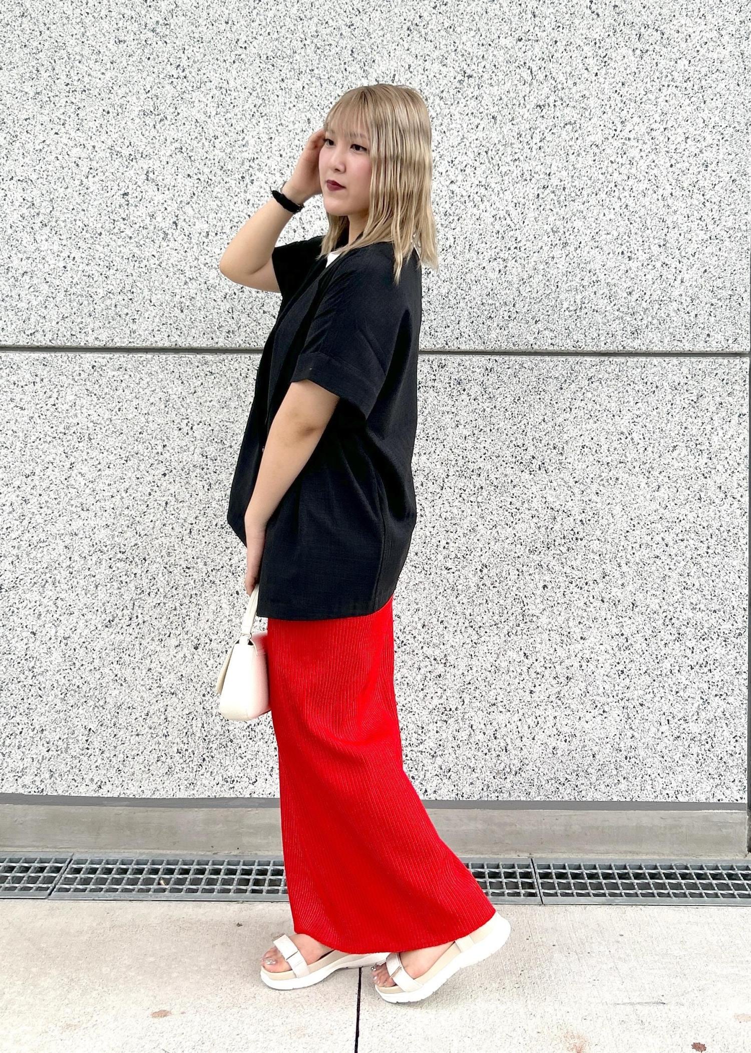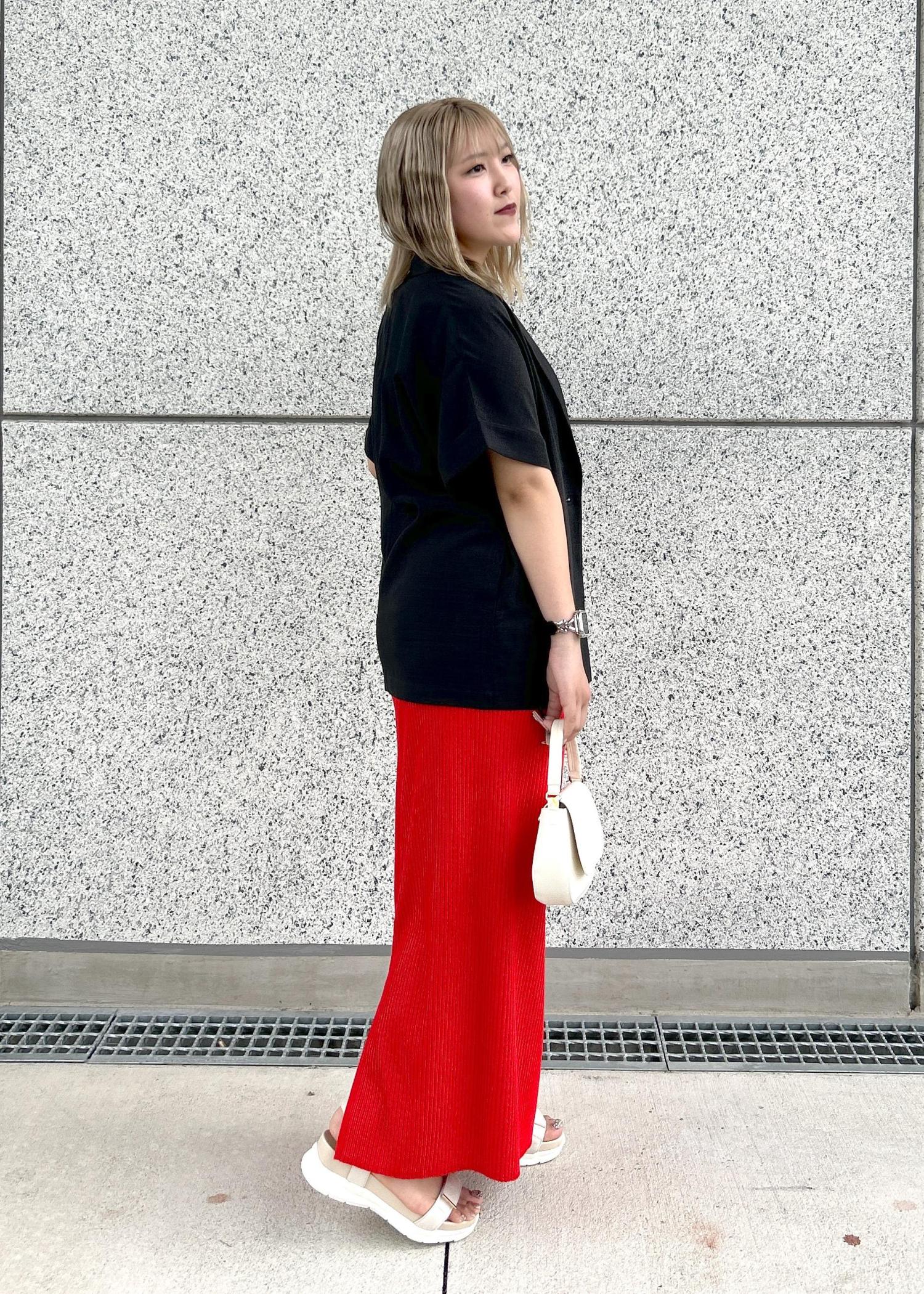 リネンライク素材のハーフスリーブジャケットとスカートコーデです。