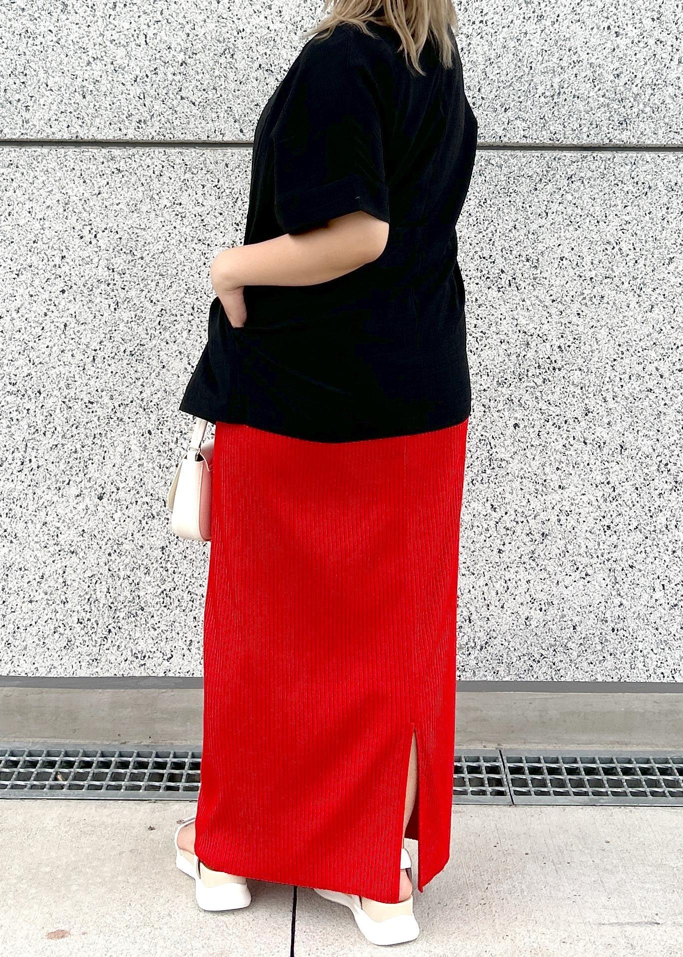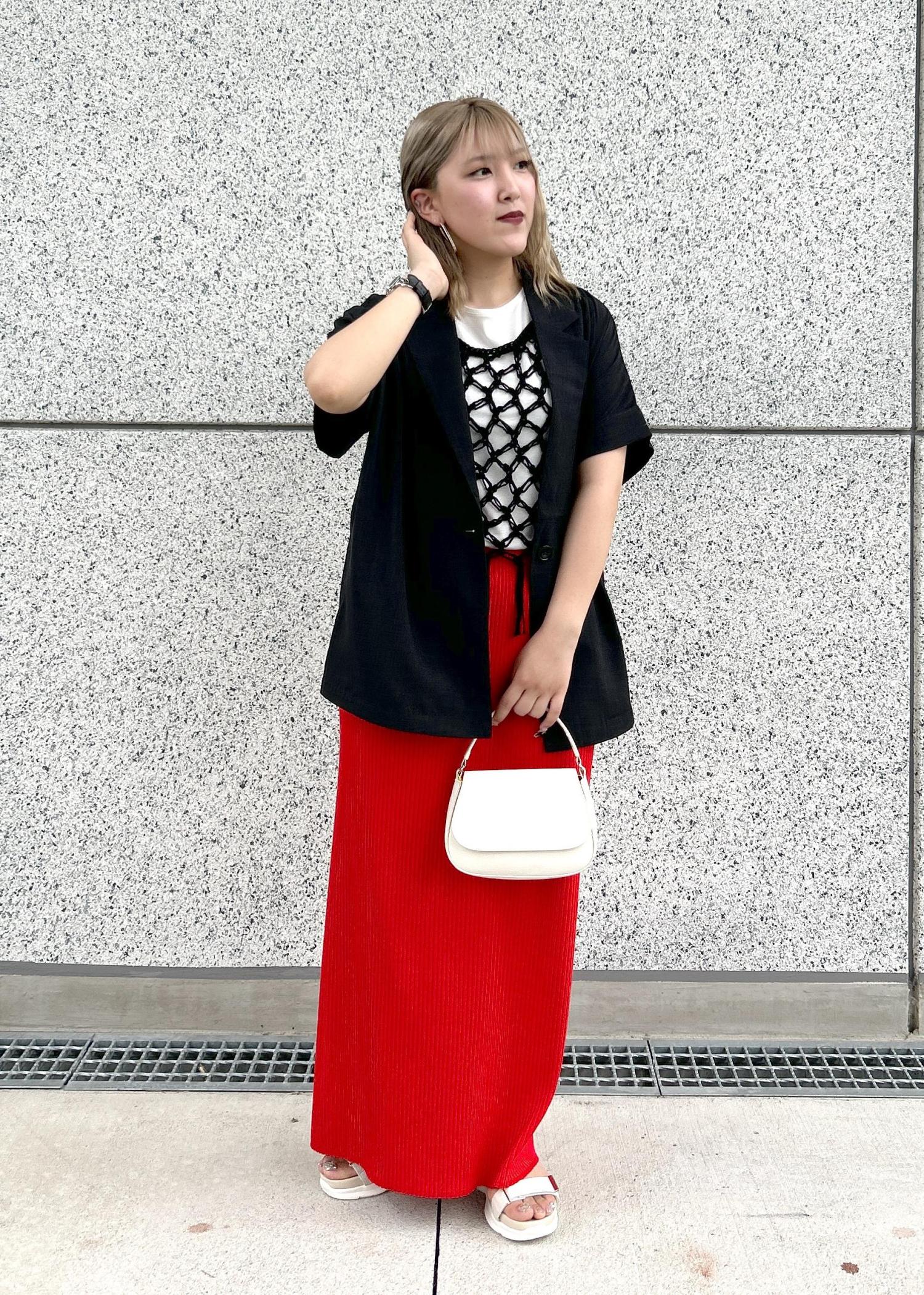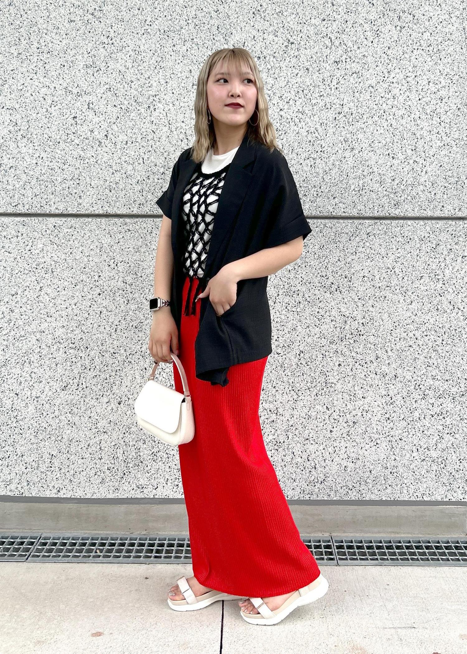 リネンライク素材のハーフスリーブジャケットとスカートコーデです。