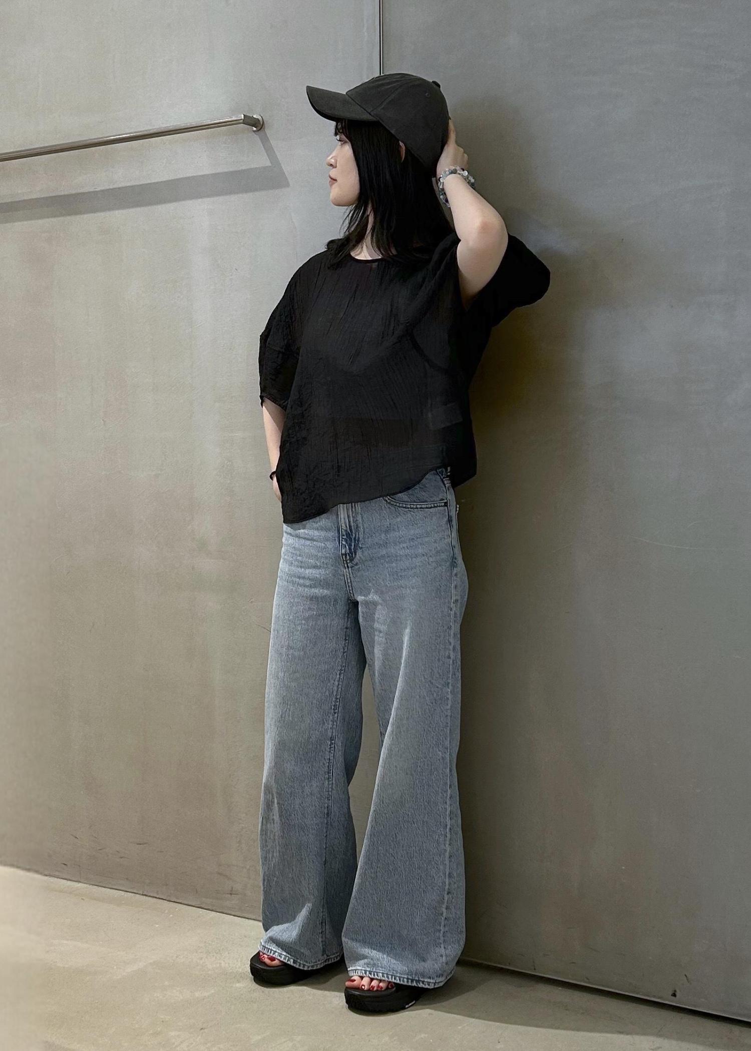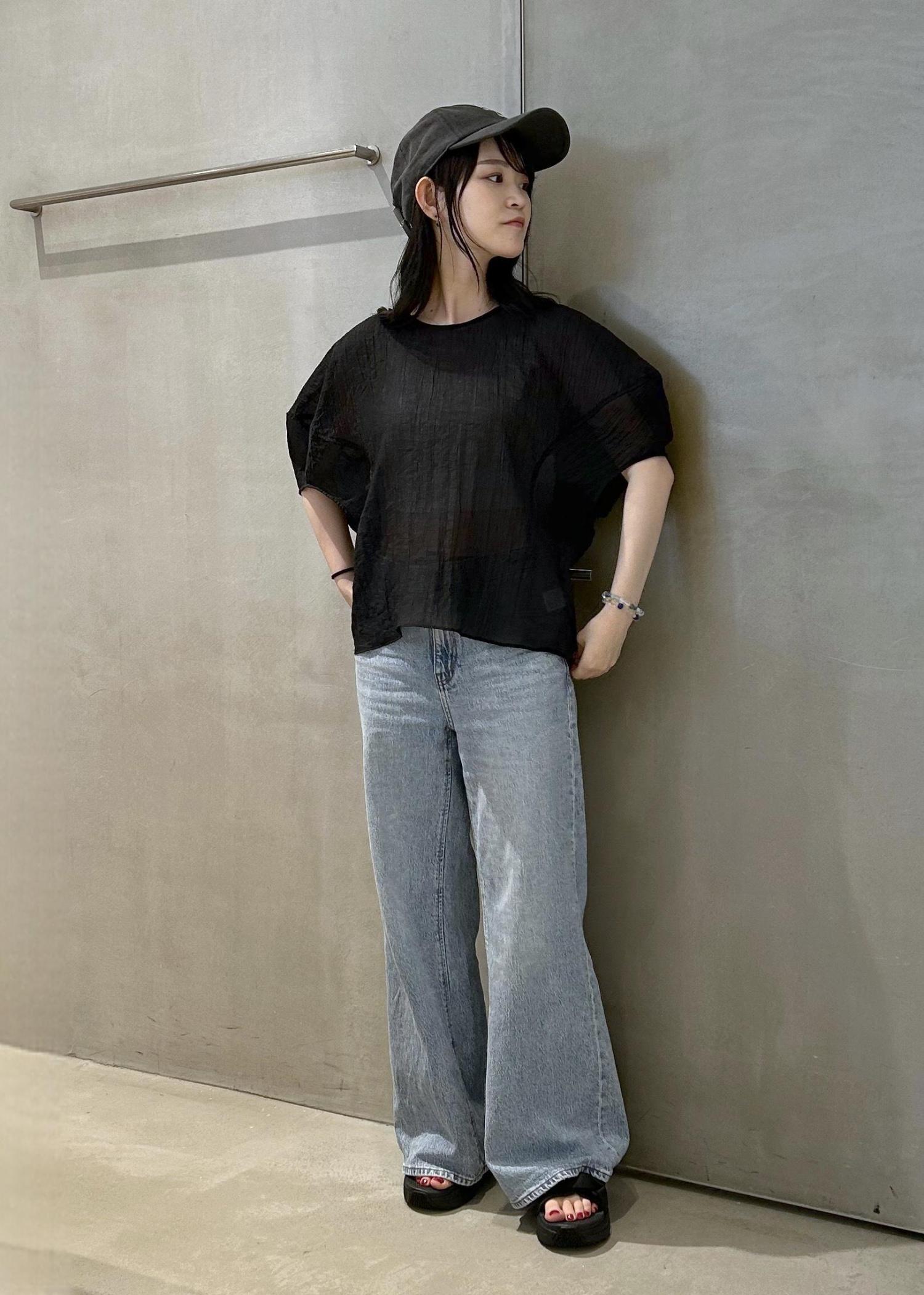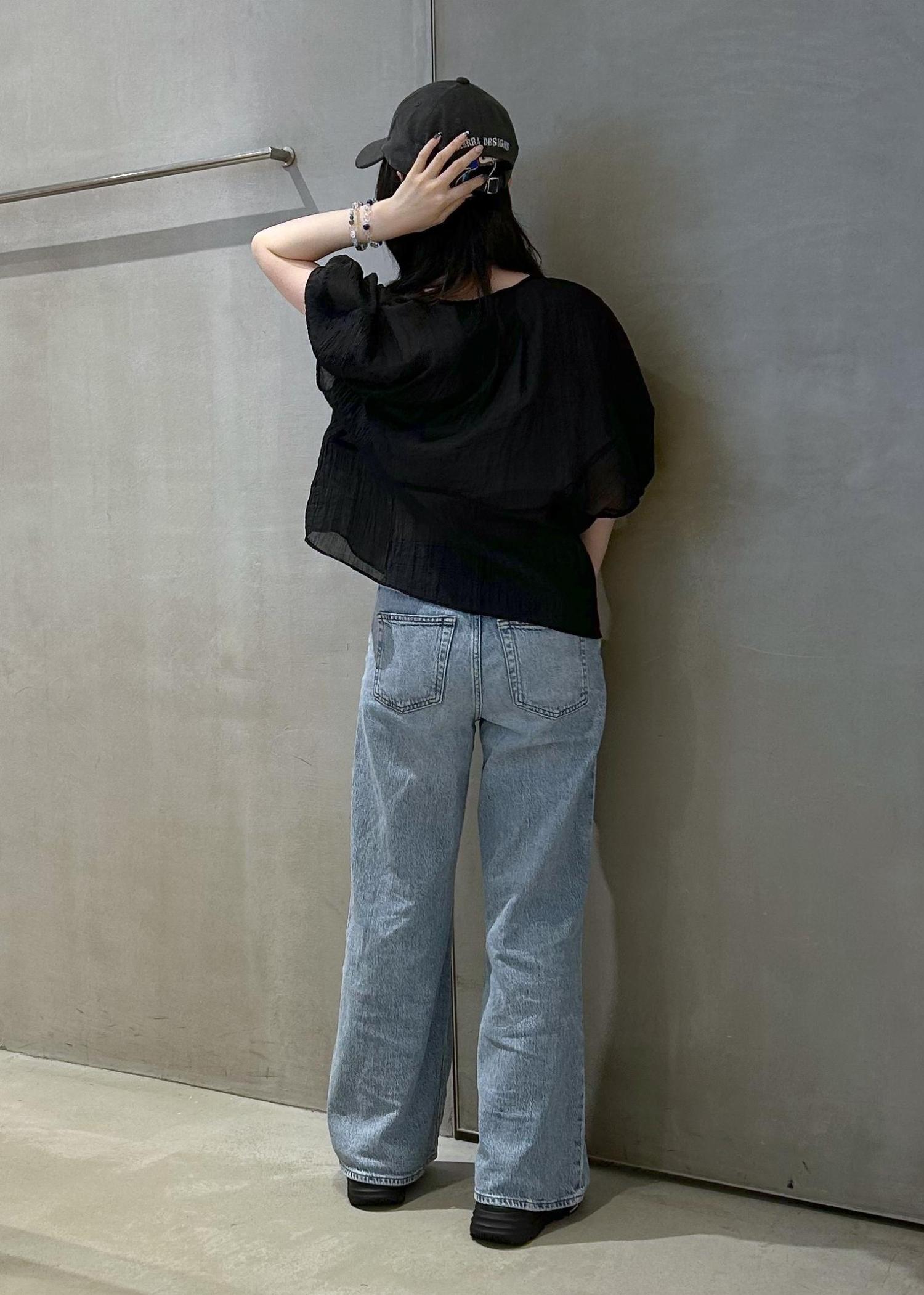 シアー感のあるブラウスにデニムを合わせてカジュアルに