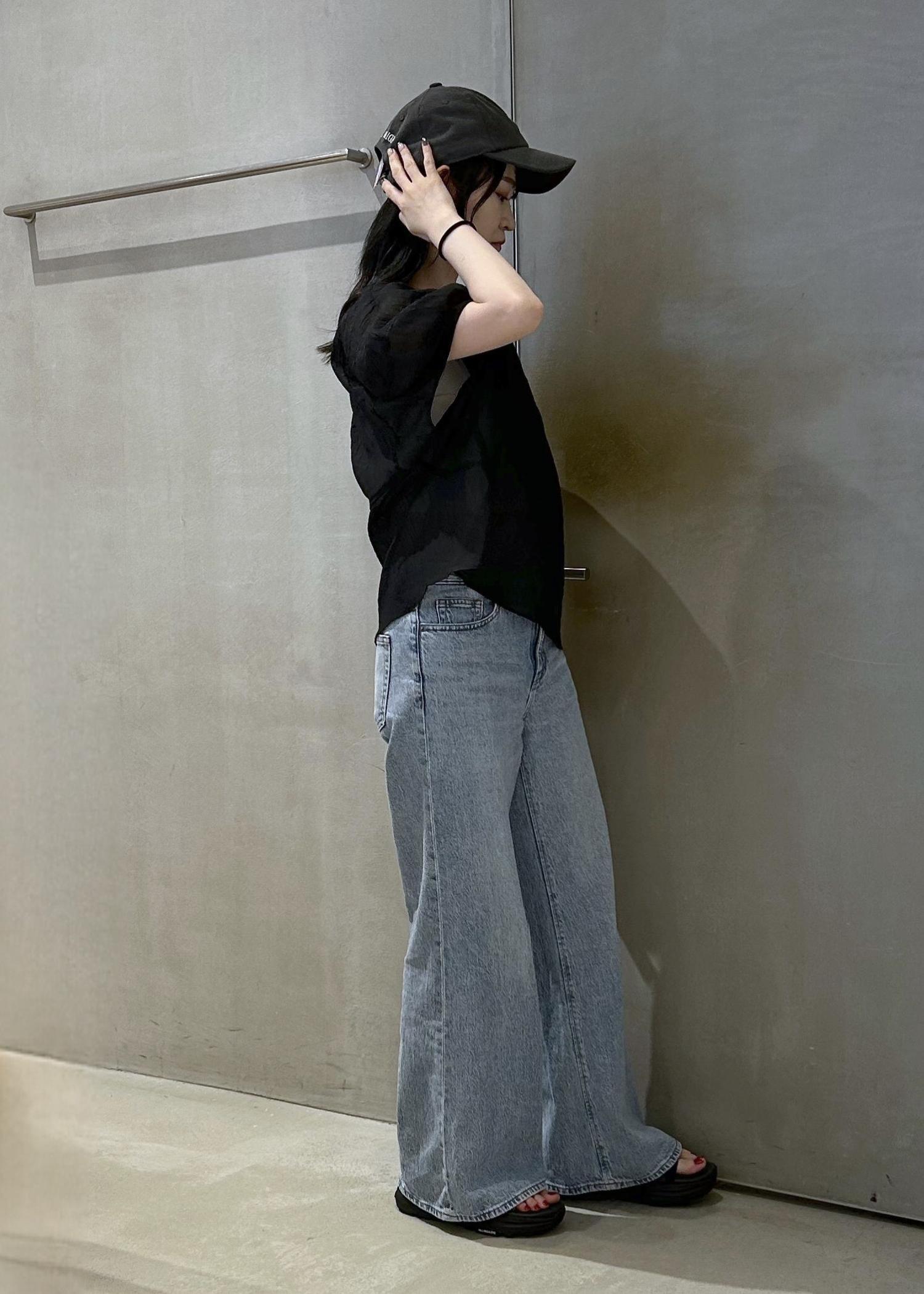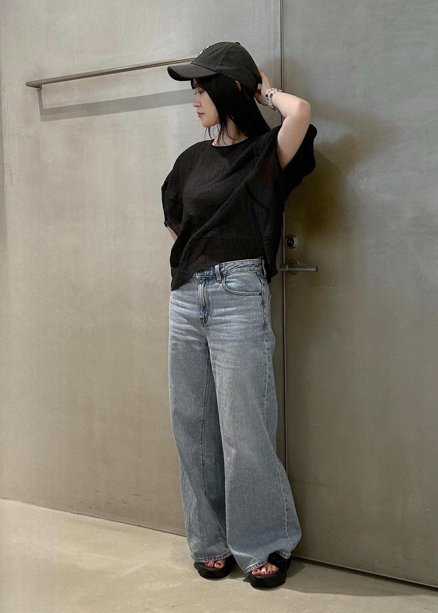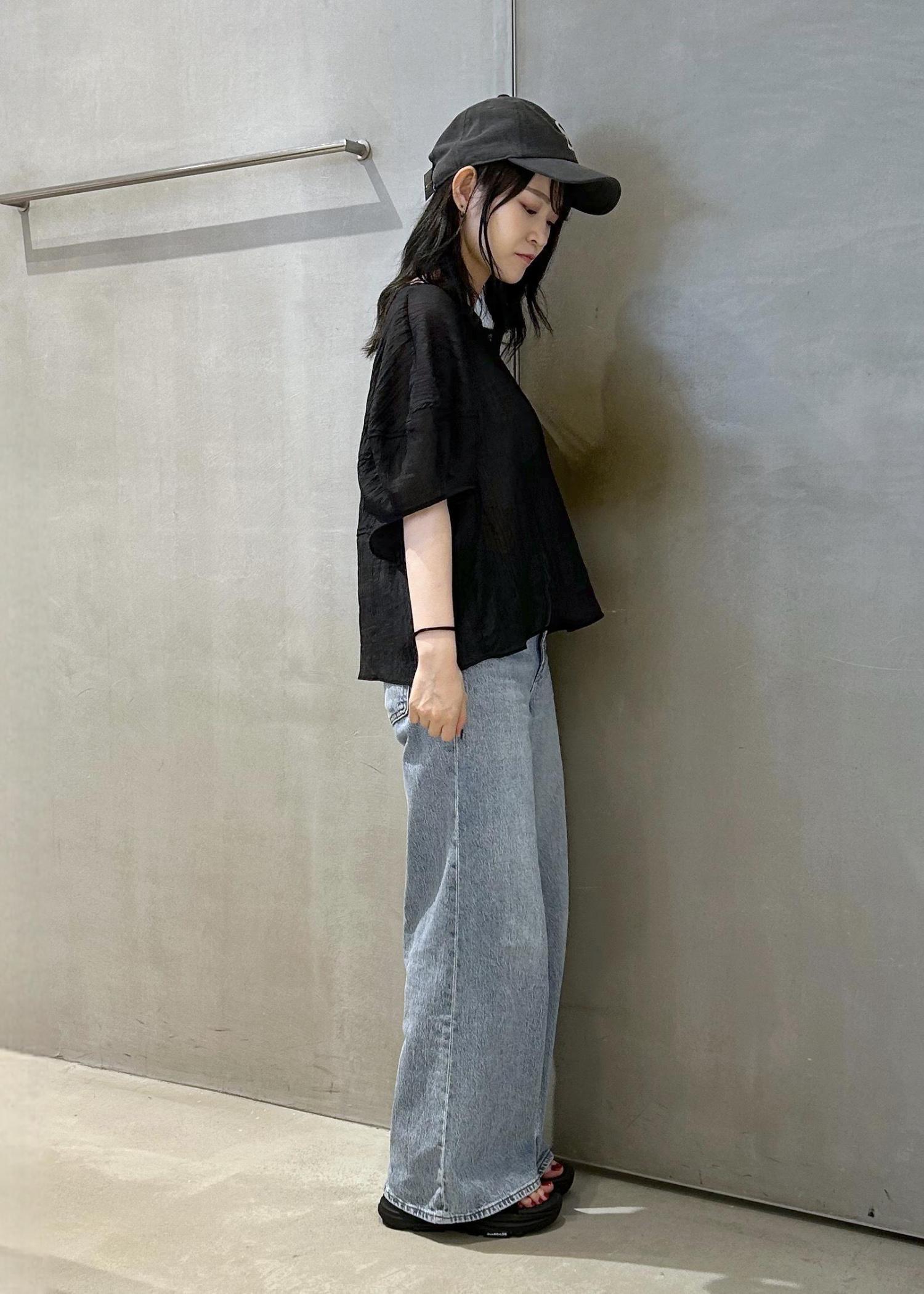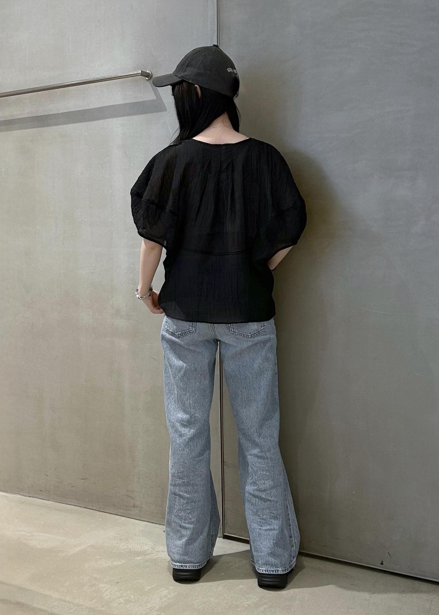 シアー感のあるブラウスにデニムを合わせてカジュアルに