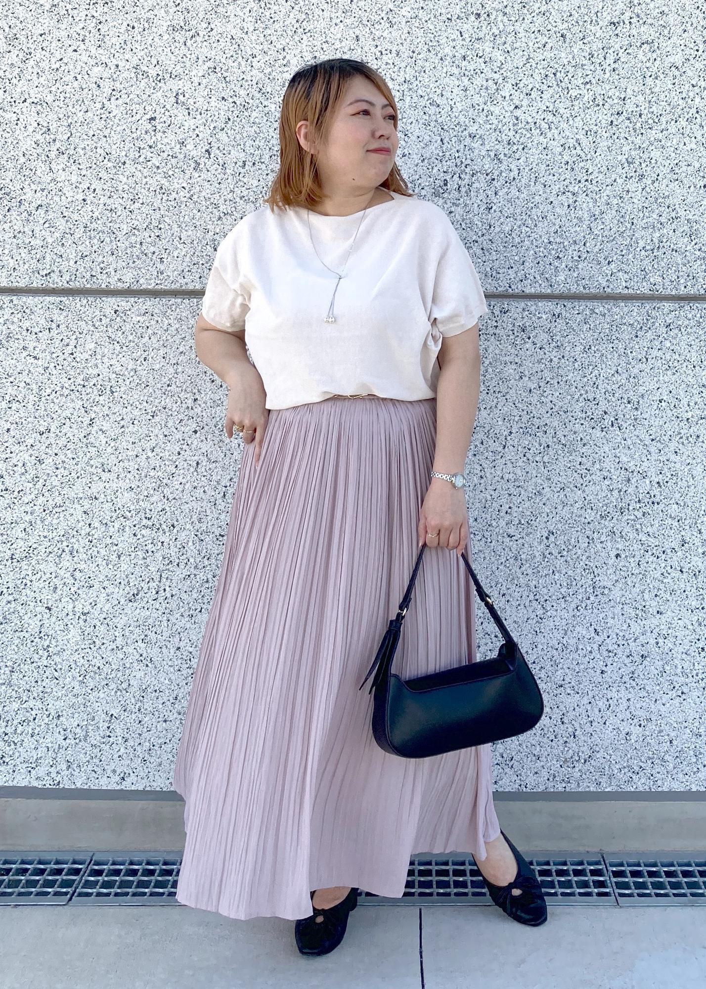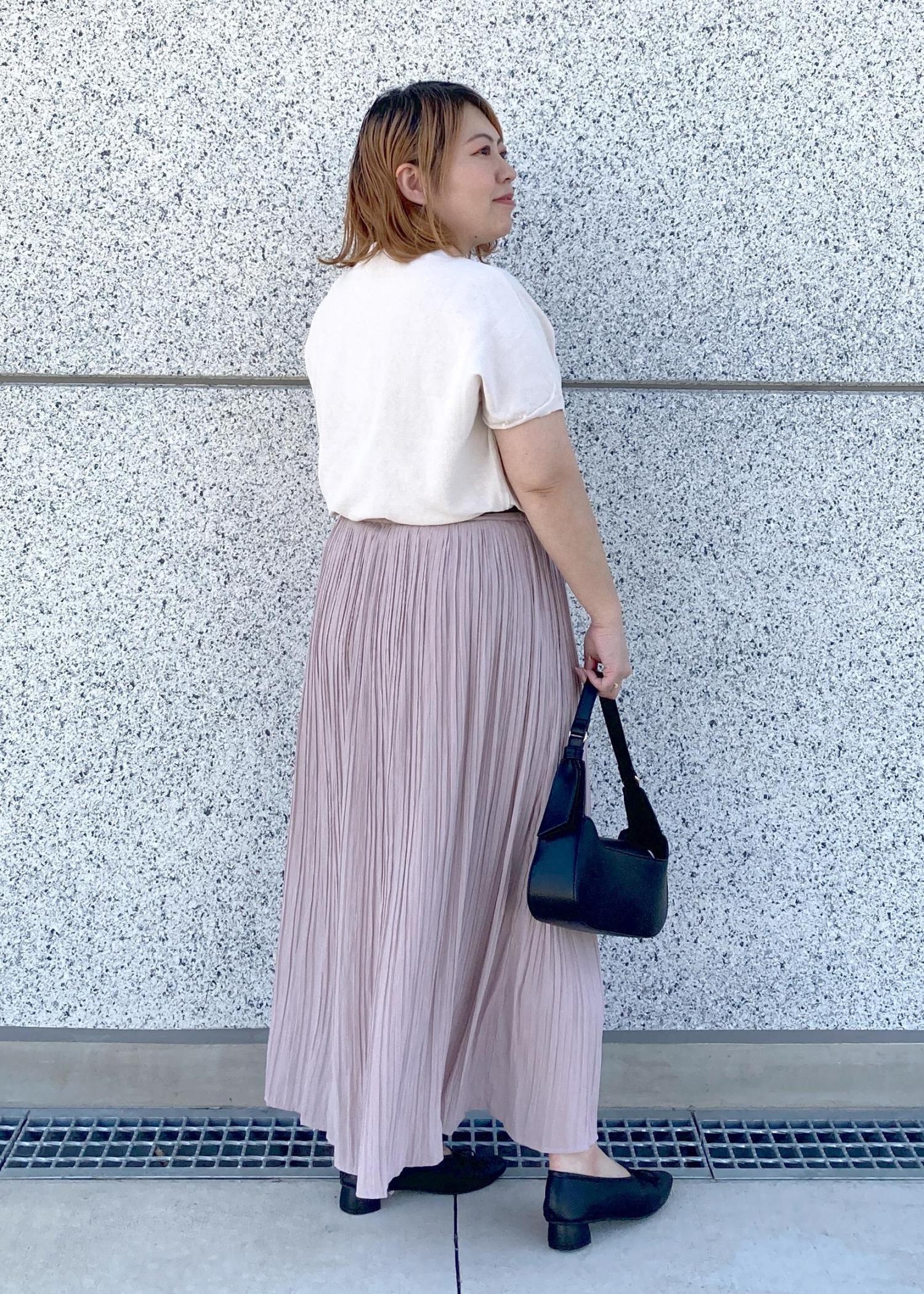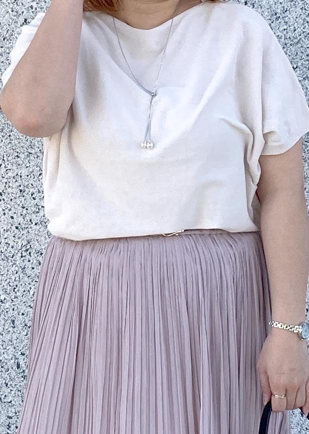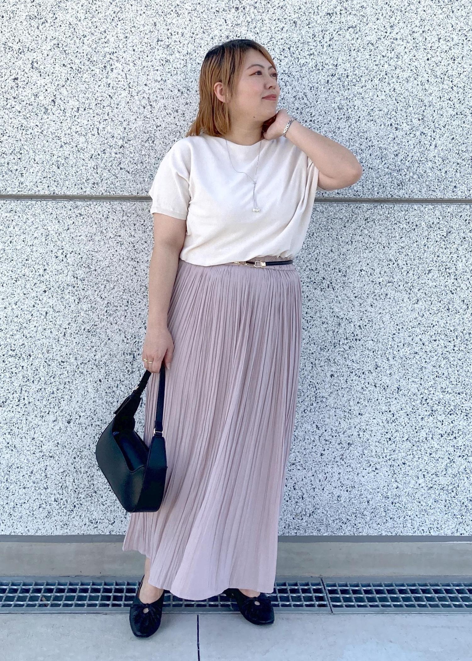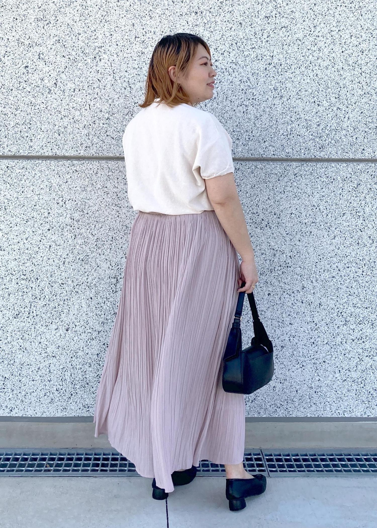 アイボリーのニットとふんわり揺れるプリーツスカートで柔らかい印象になります。