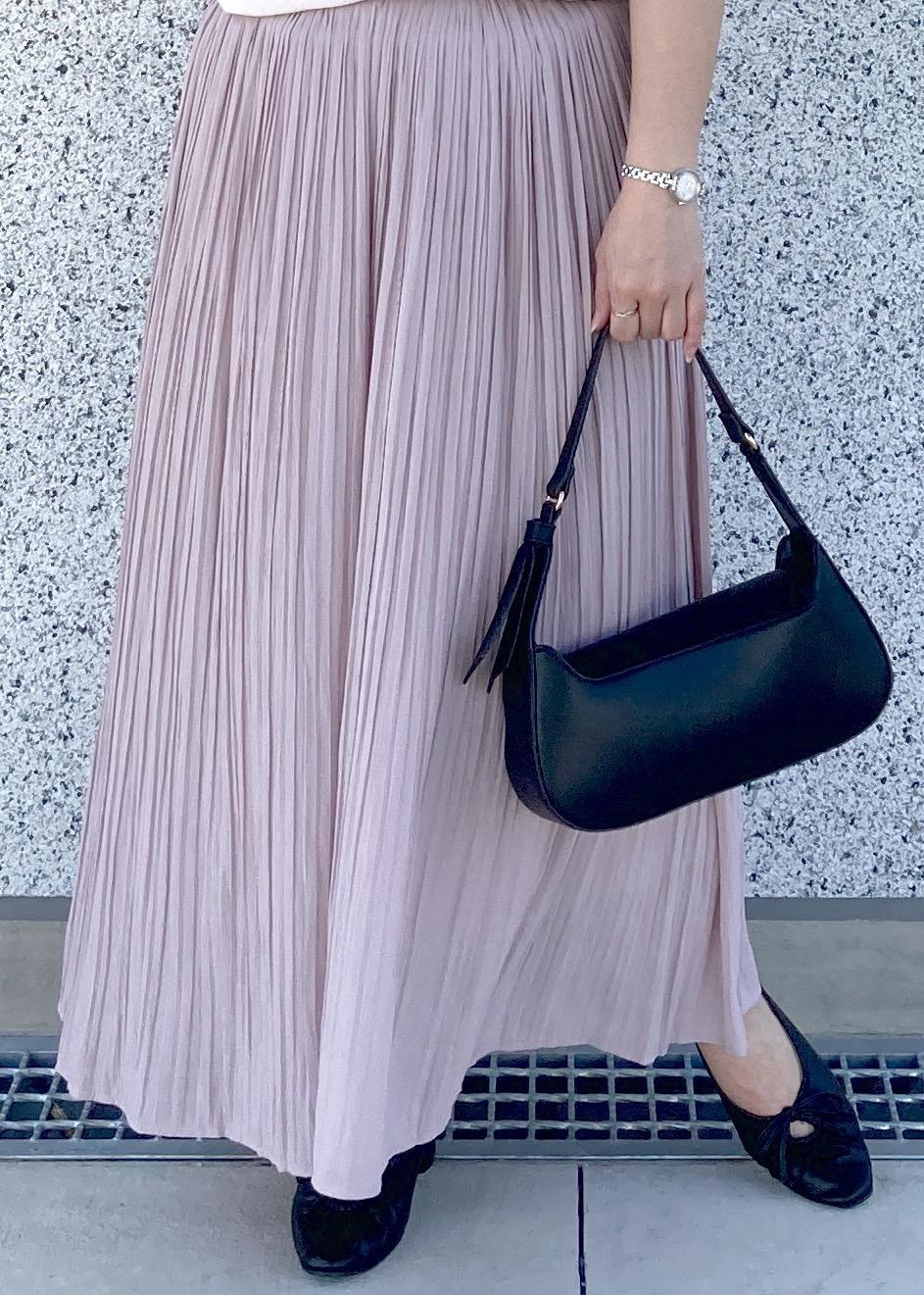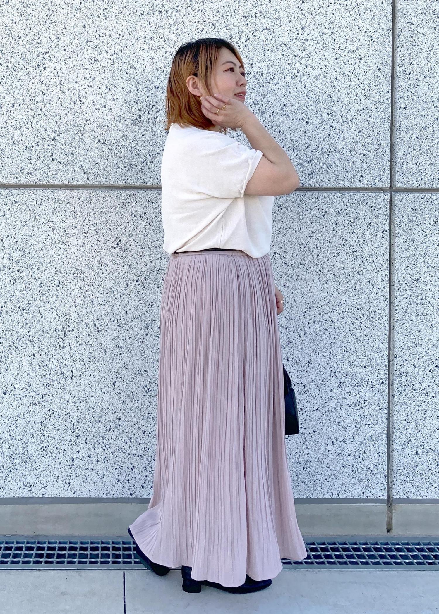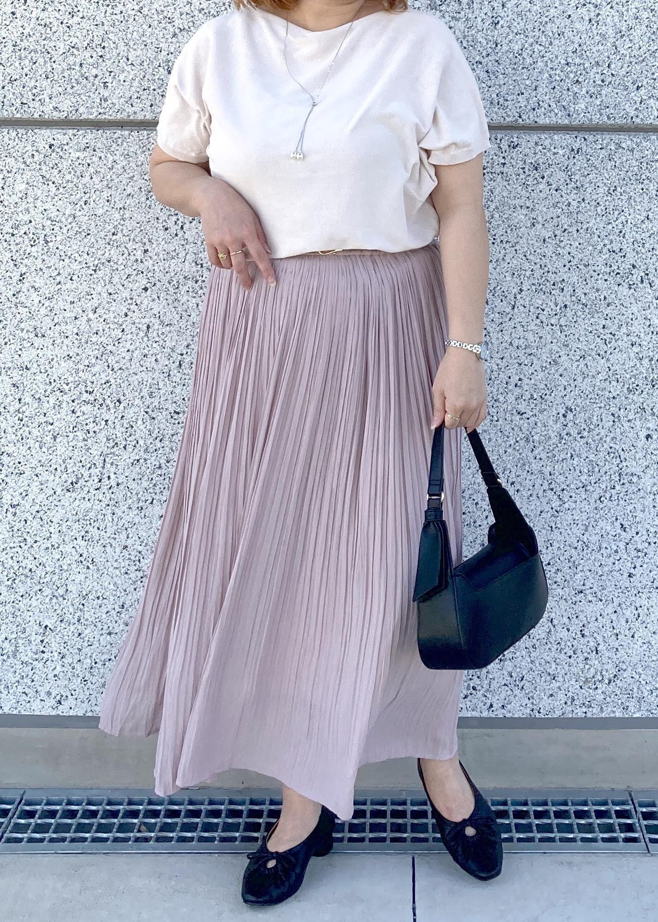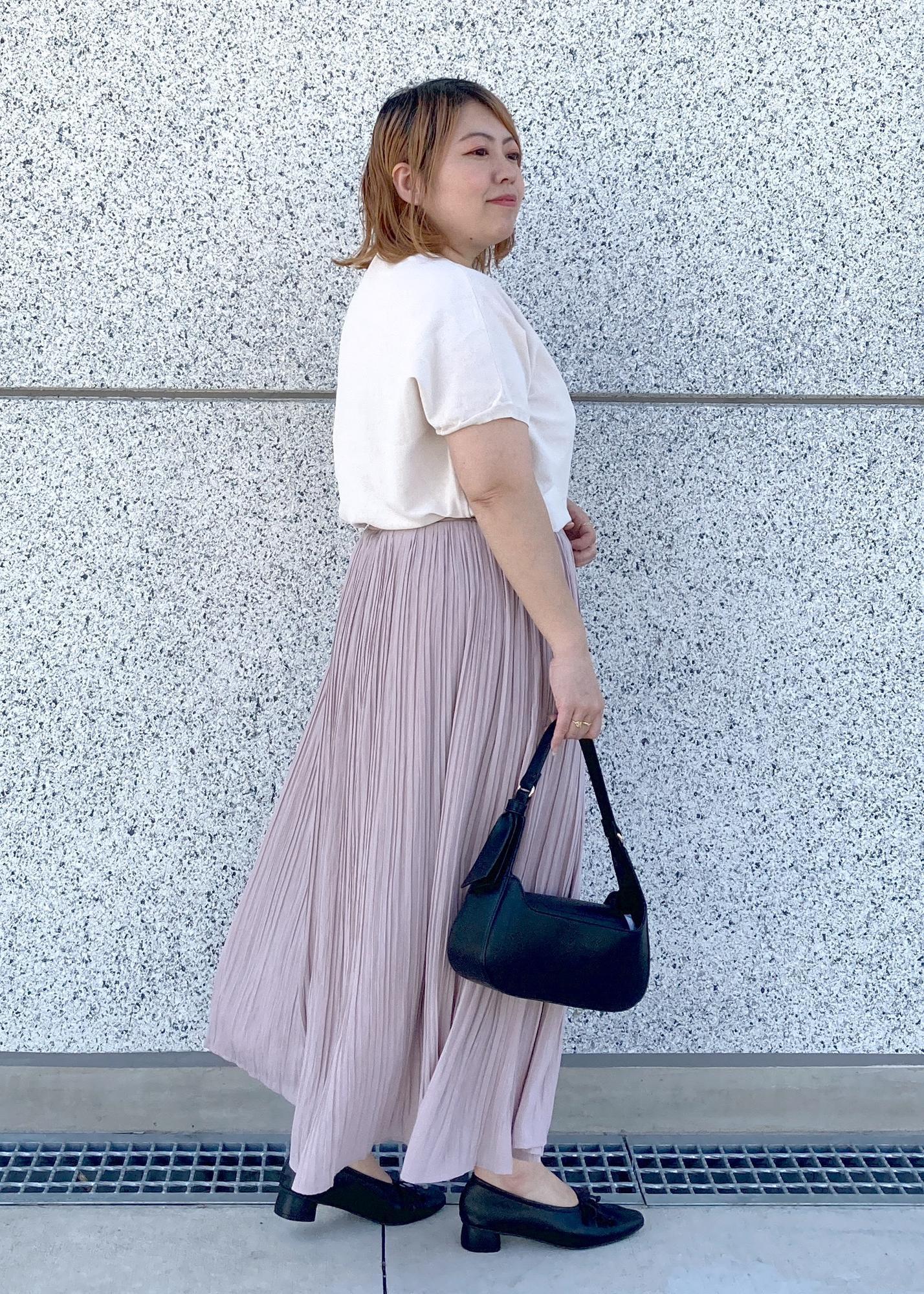 アイボリーのニットとふんわり揺れるプリーツスカートで柔らかい印象になります。