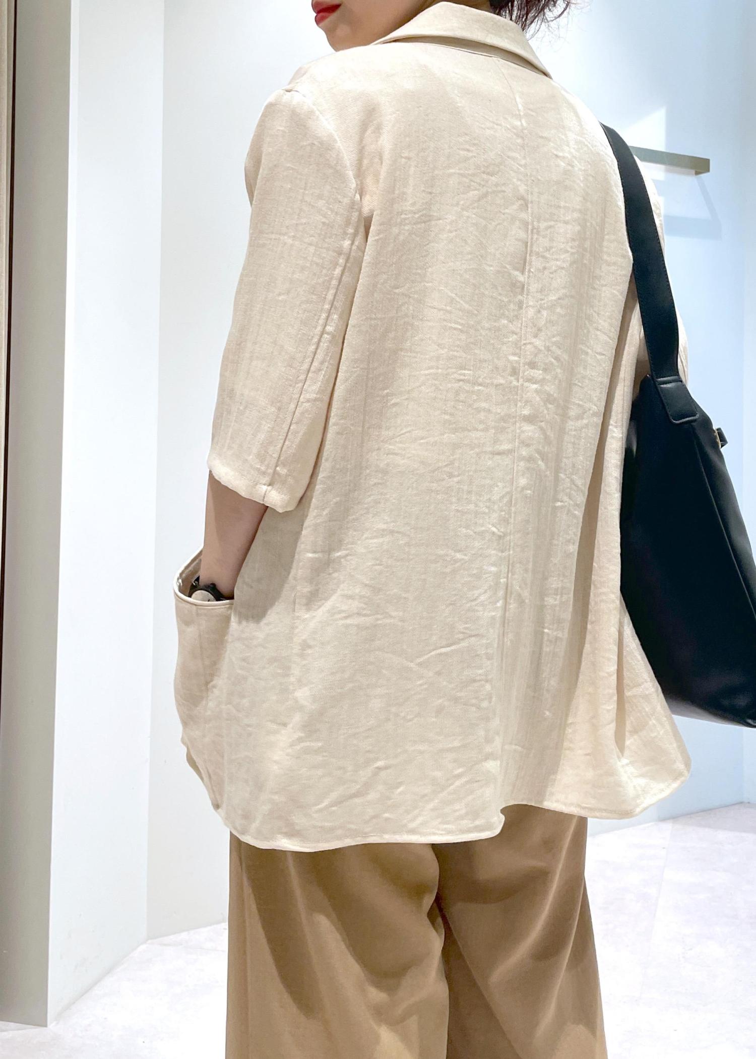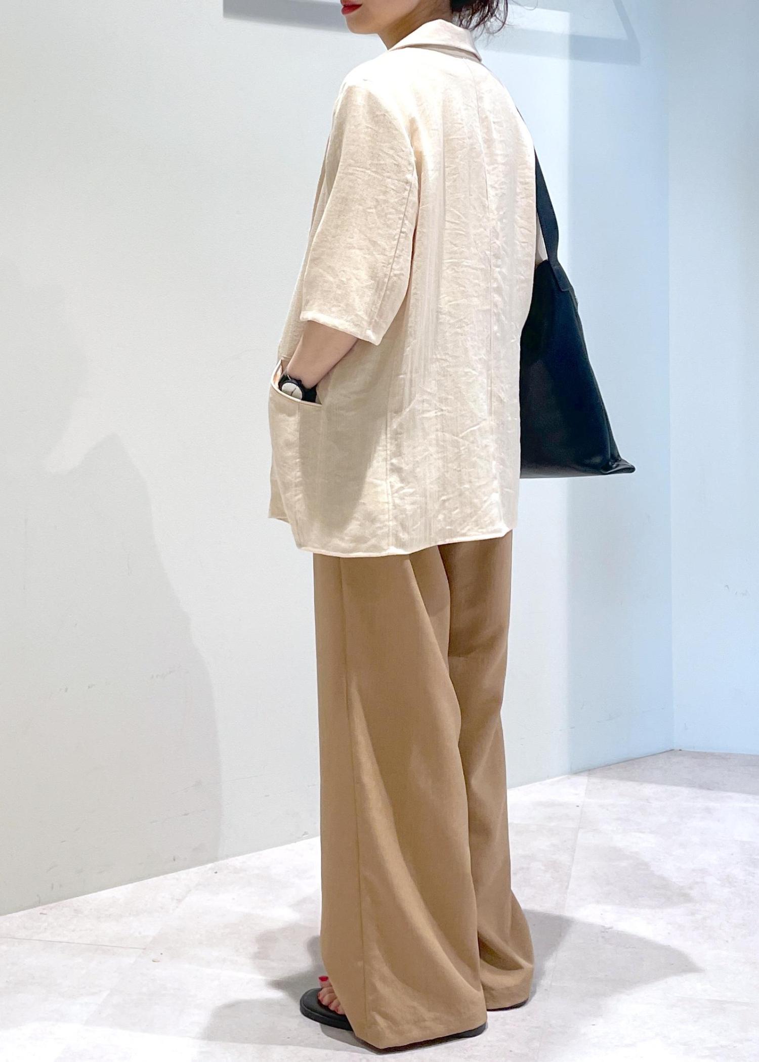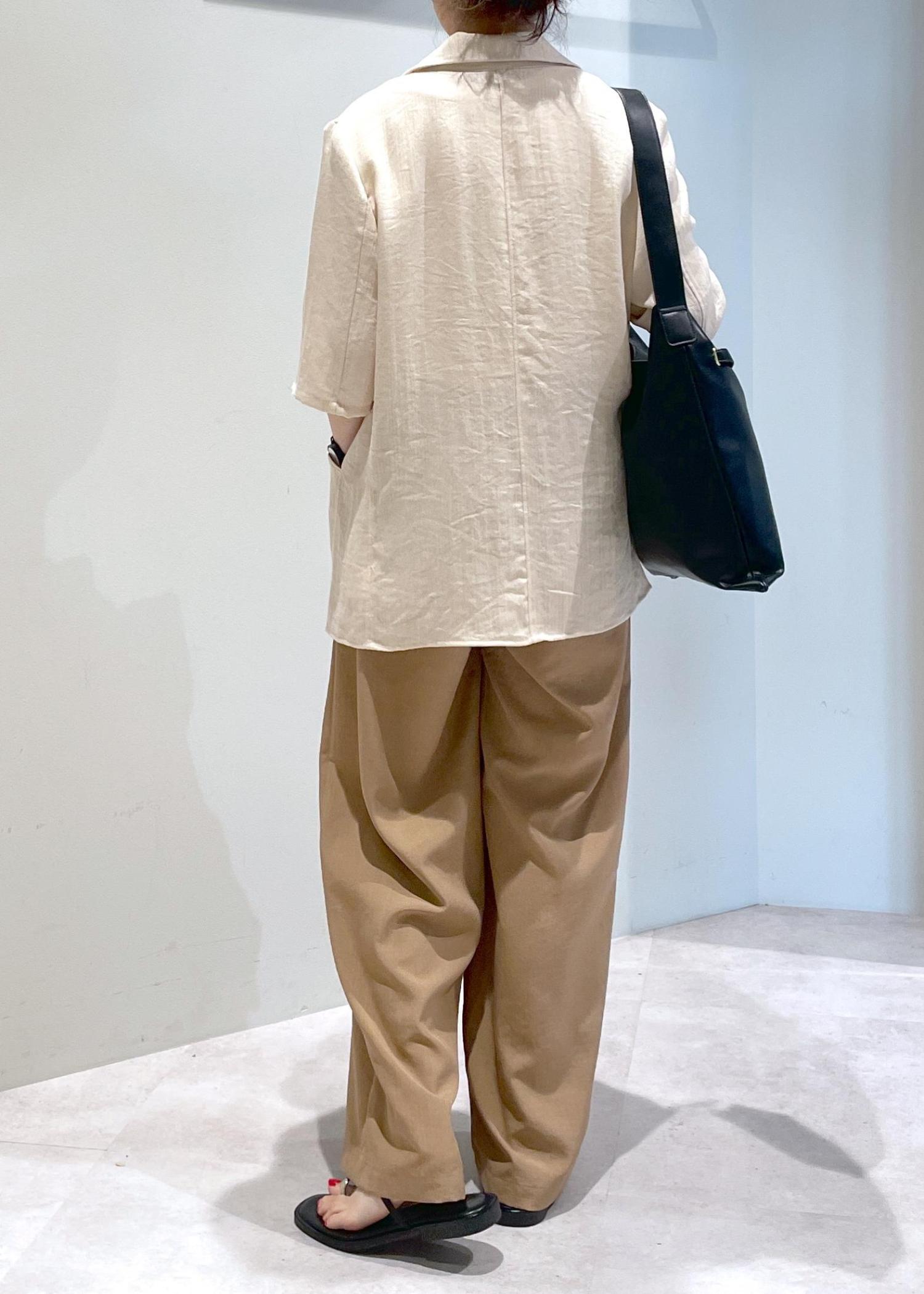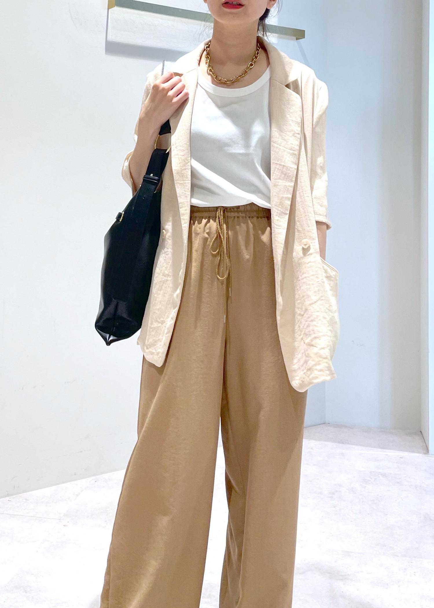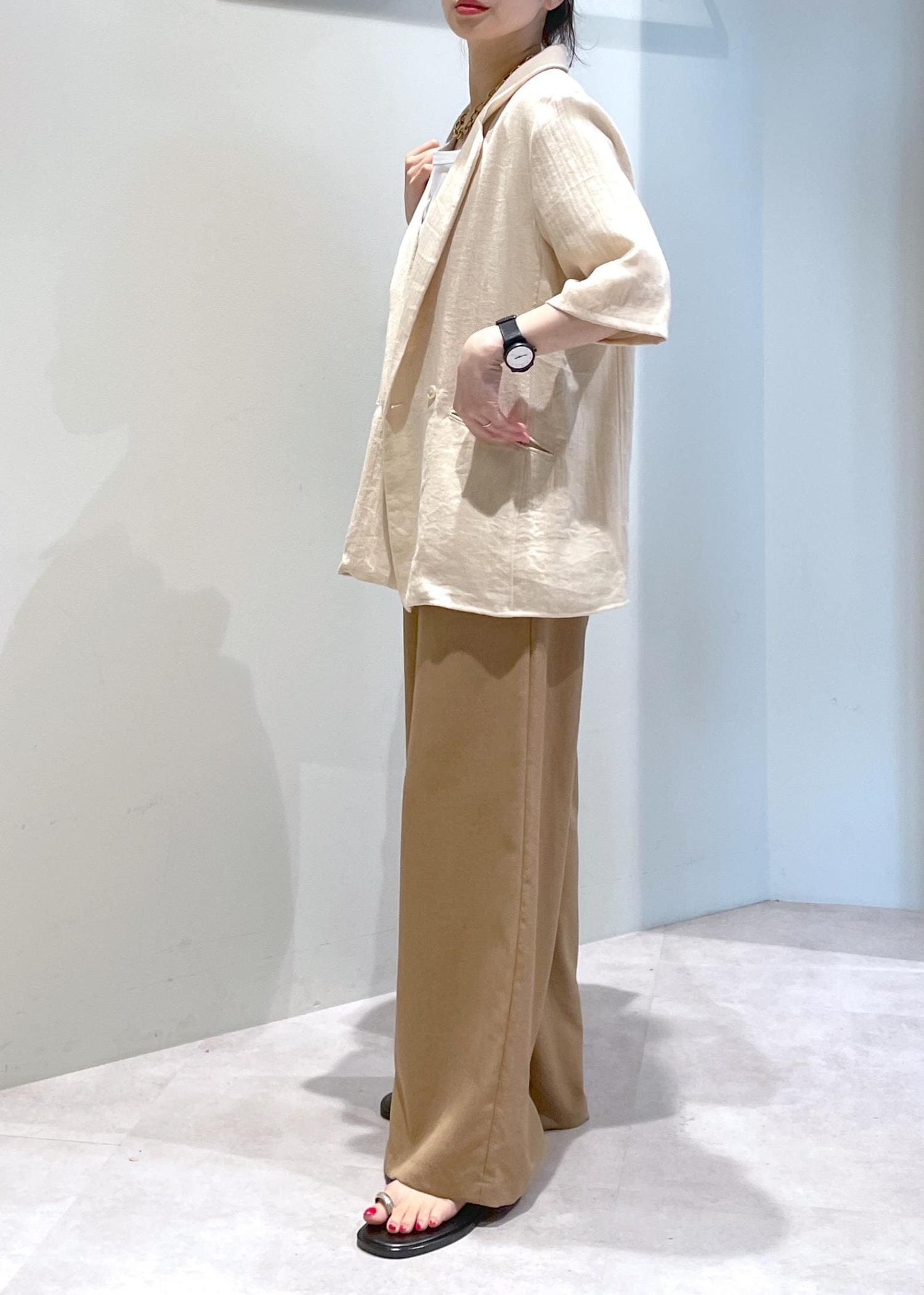 私もリアルバイした楽ちん麻調ジャケットと店頭でも大人気のワイドパンツのワントーンコーデです。