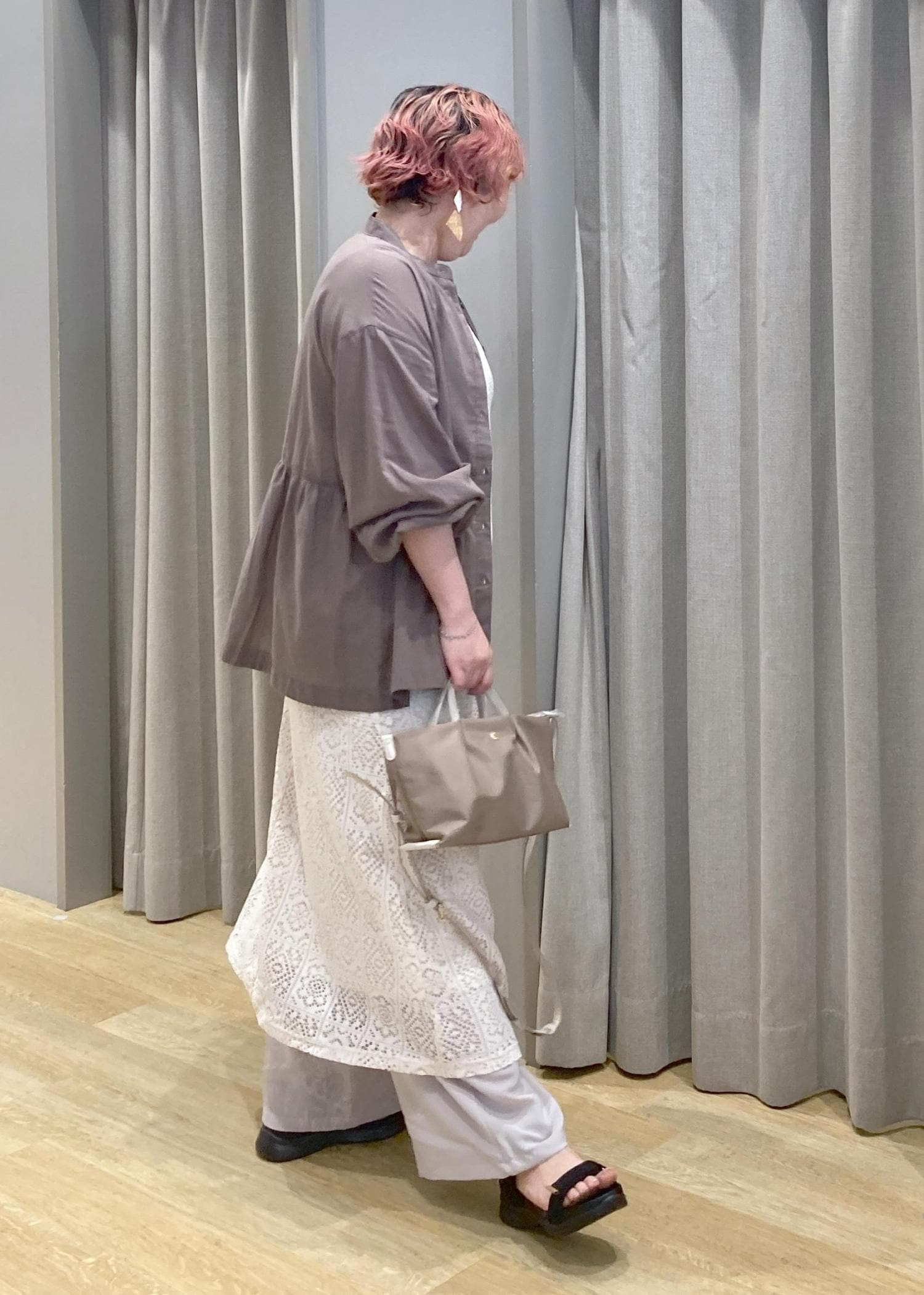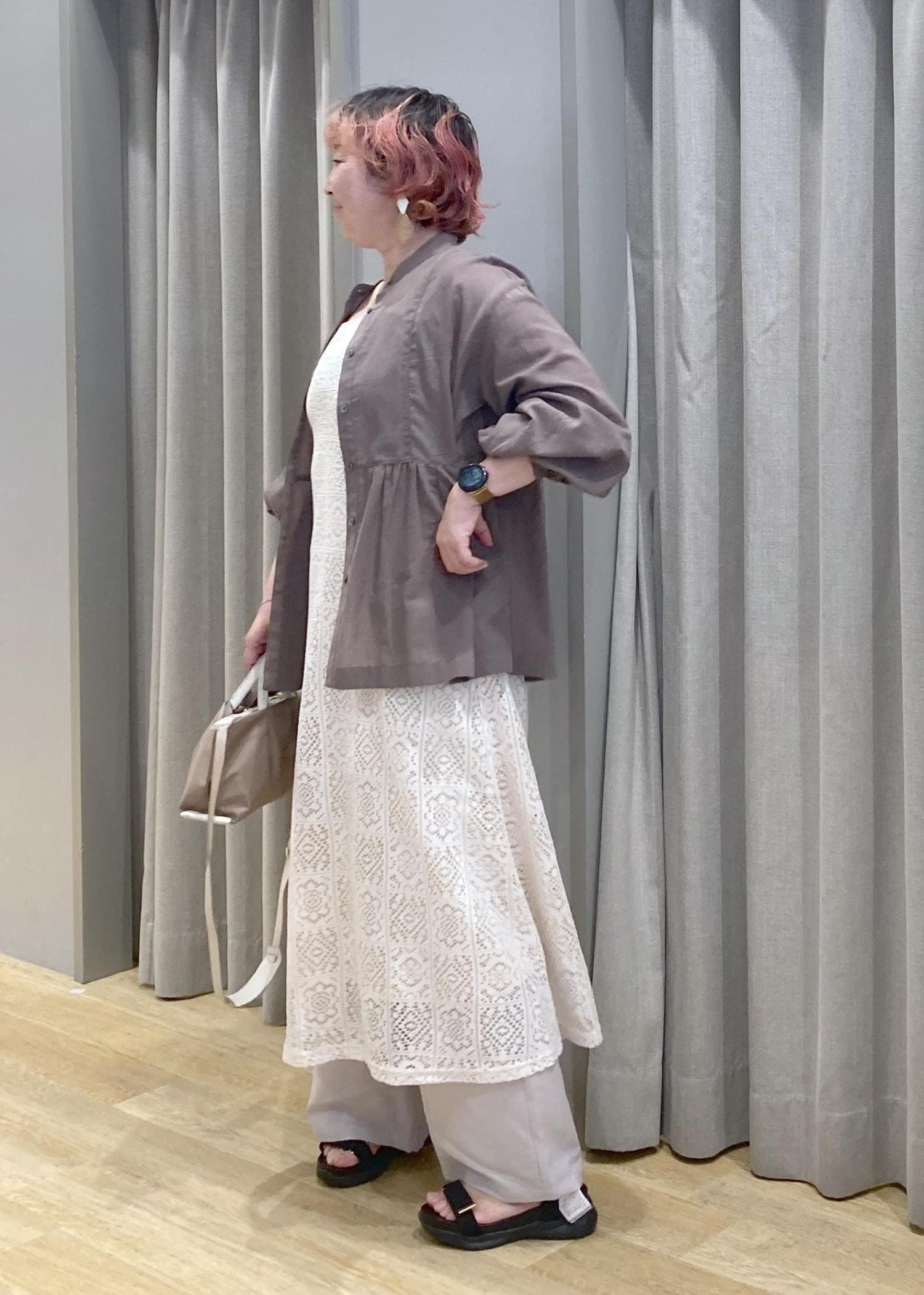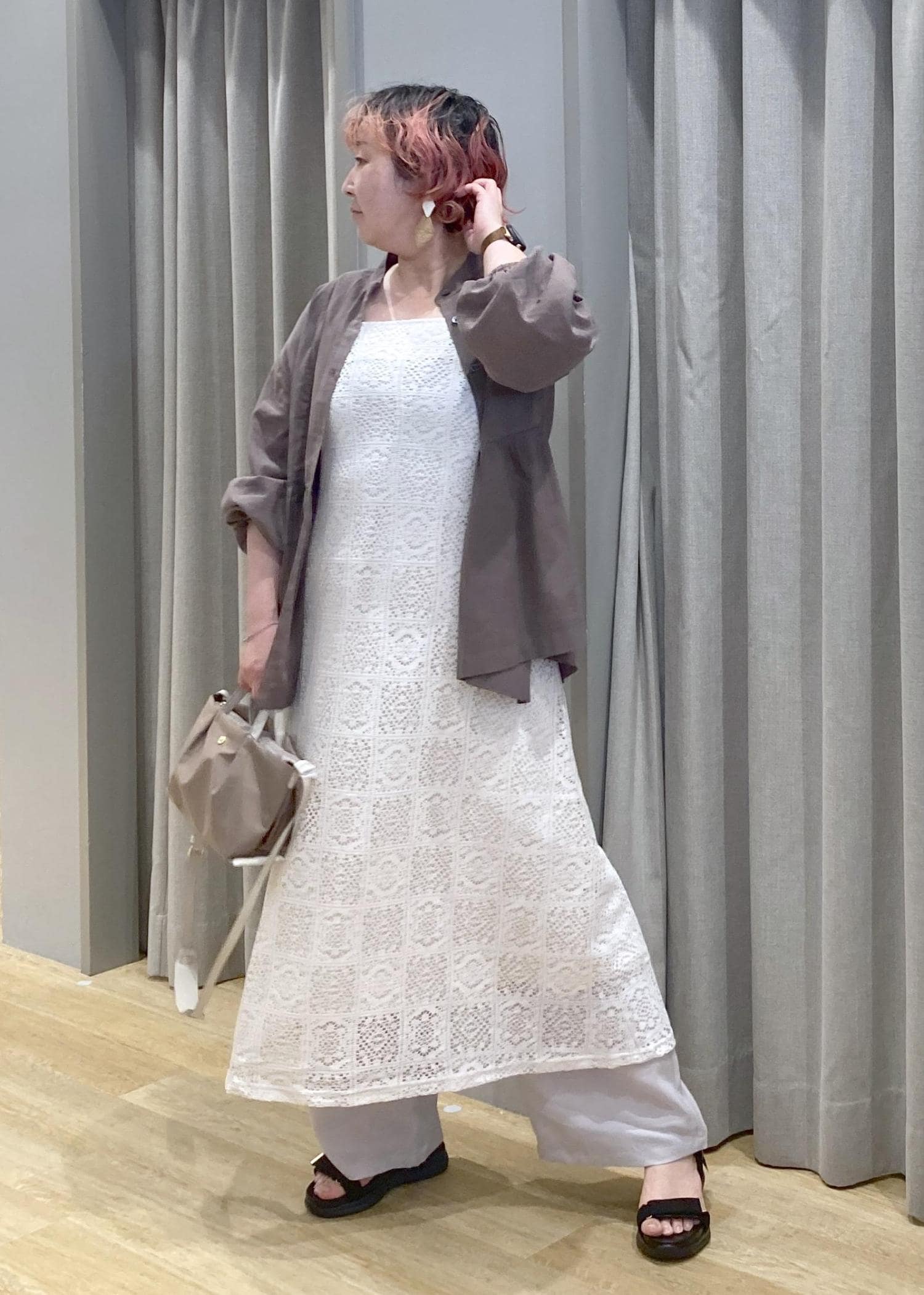 ふんわりAラインのレースワンピに、ワイドパンツをレイヤードしたリラックス感たっぷりのスタイルです。さりげなく気になる腰まわりや脚もカバーしつつ、涼しげな印象になります。