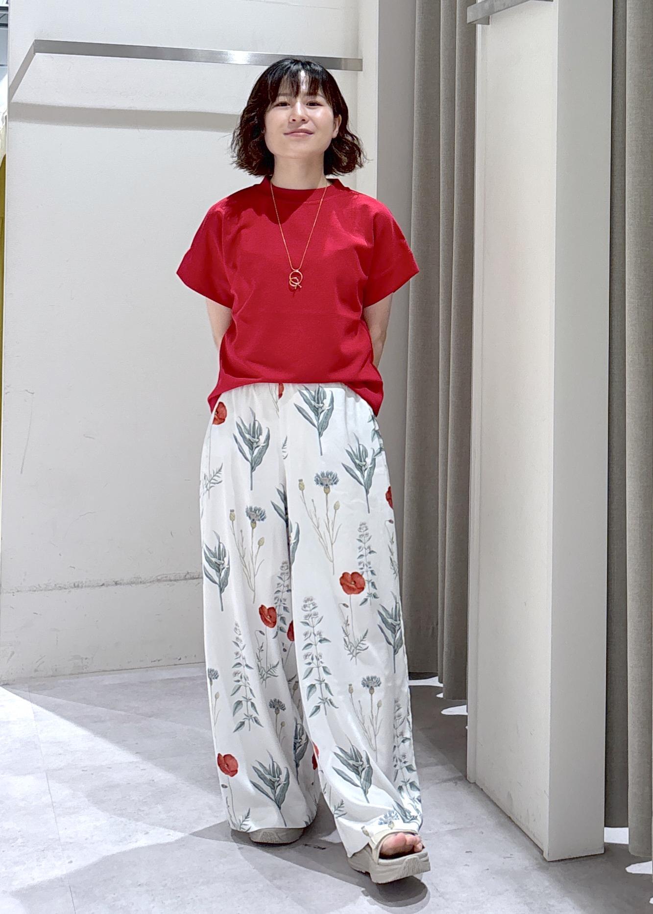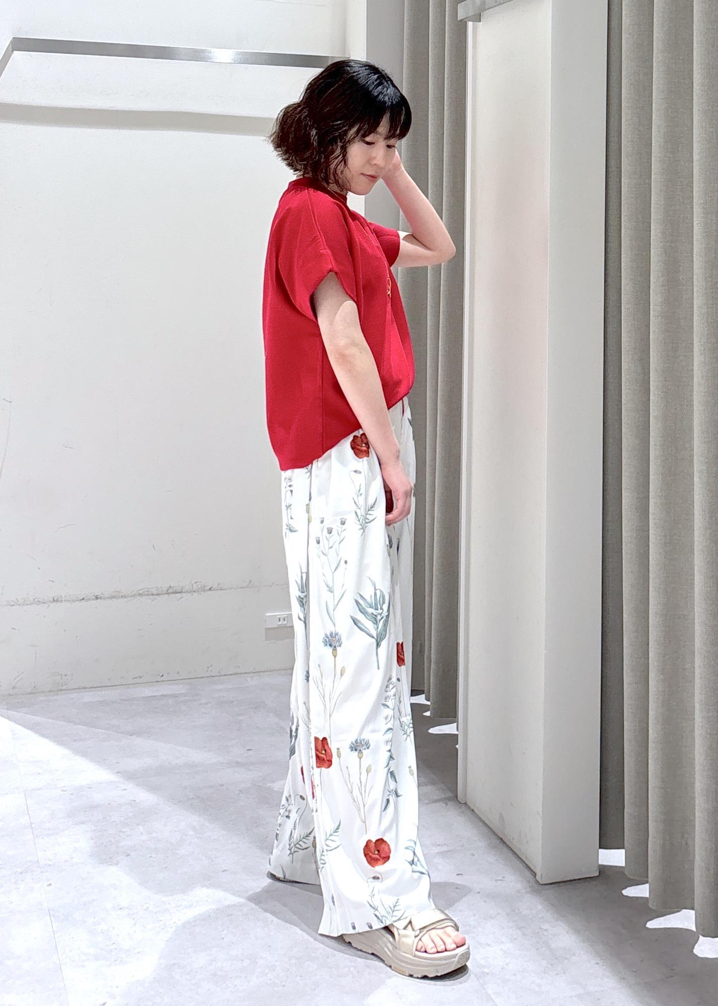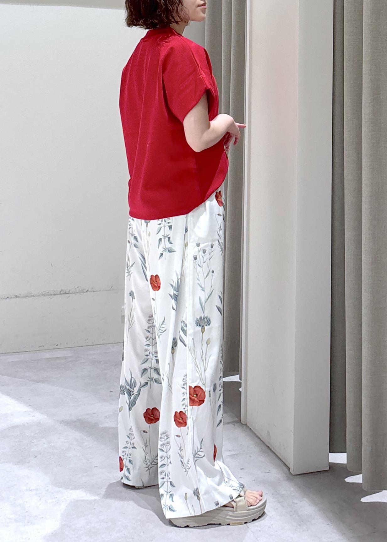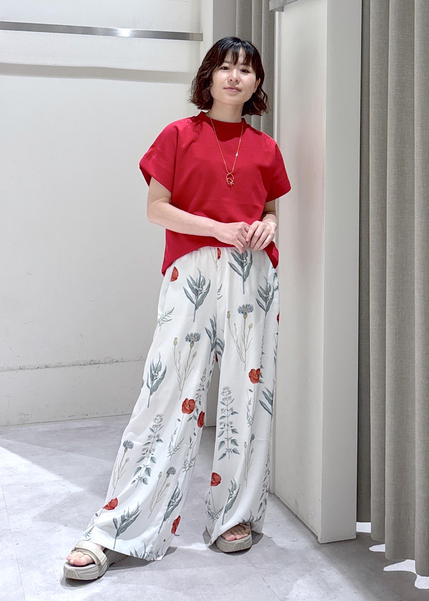 パッと目を引く赤×ボタニカル柄のコントラストで、夏らしい着映えを実現!