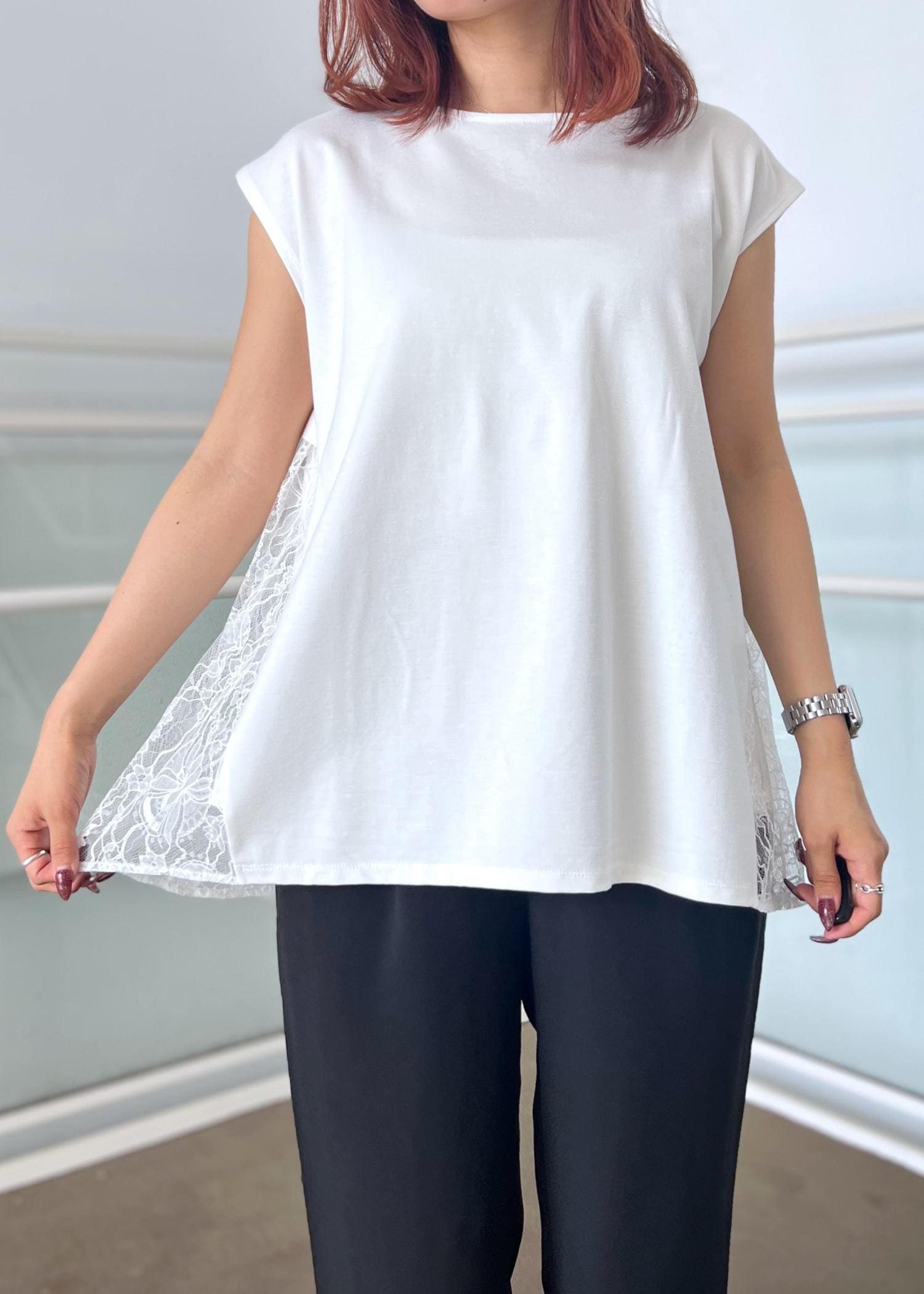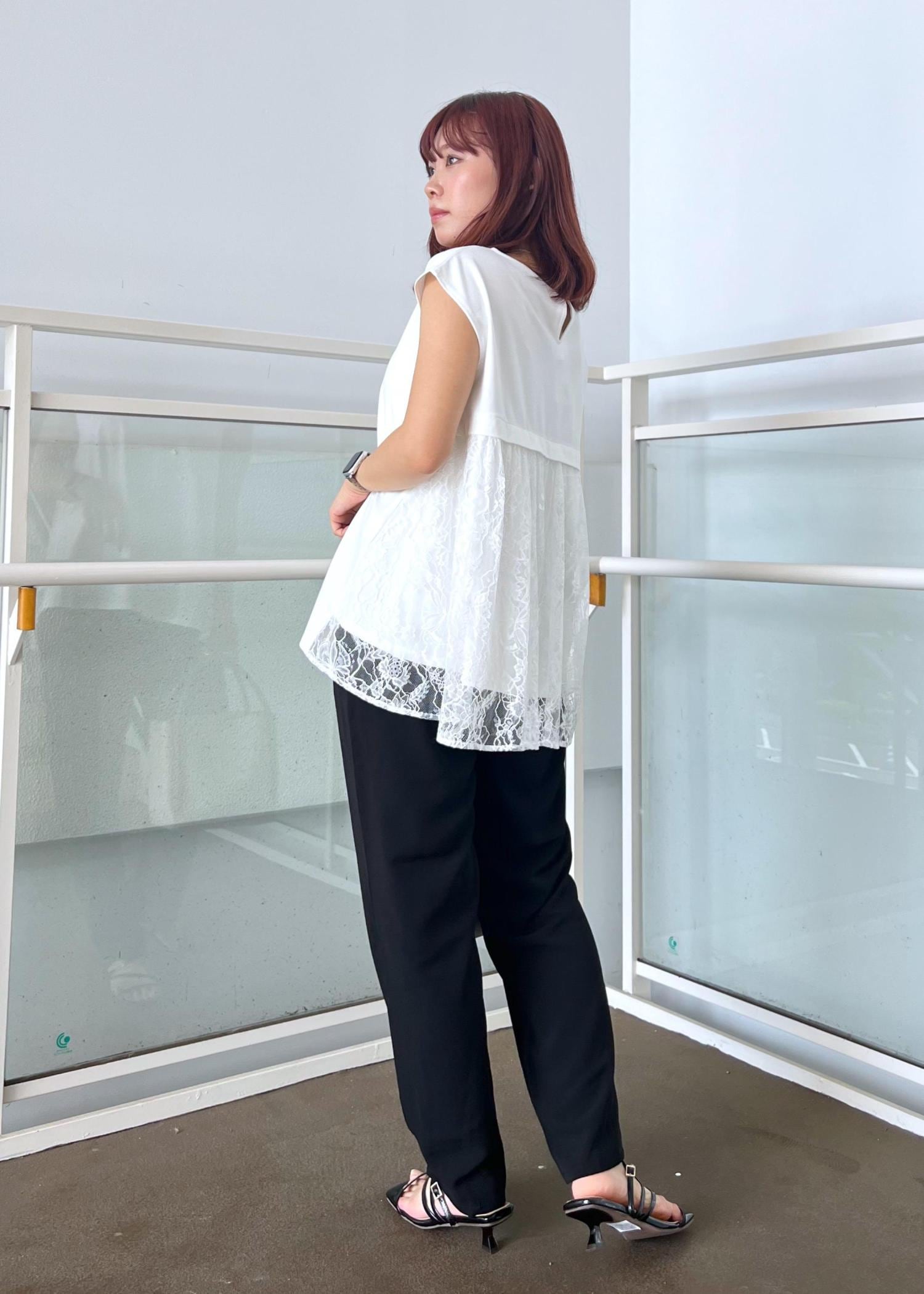 トップスは柔らかく華奢なレースデザインがあり、大人可愛いを取り入れやすい1枚となっております。後ろは長さがあり、お尻が隠れるというメリットもおススメポイントです!