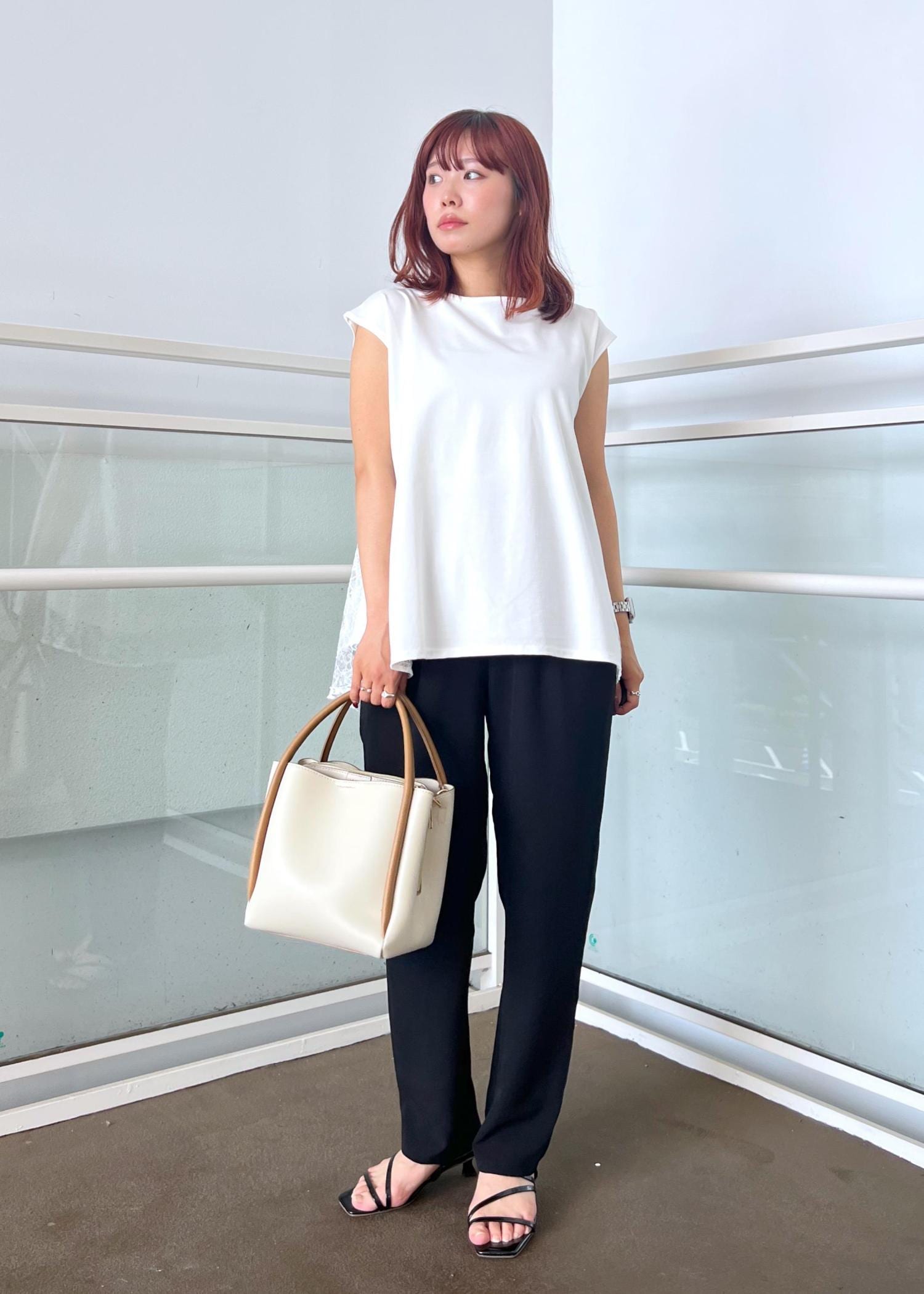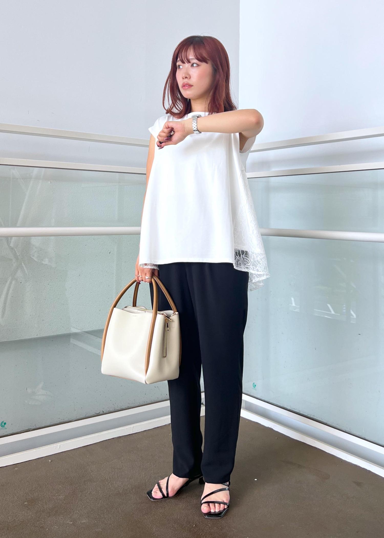 トップス、ボトムス共にオンオフ兼用に使えるアイテムで大人可愛いスタイルを組みました。