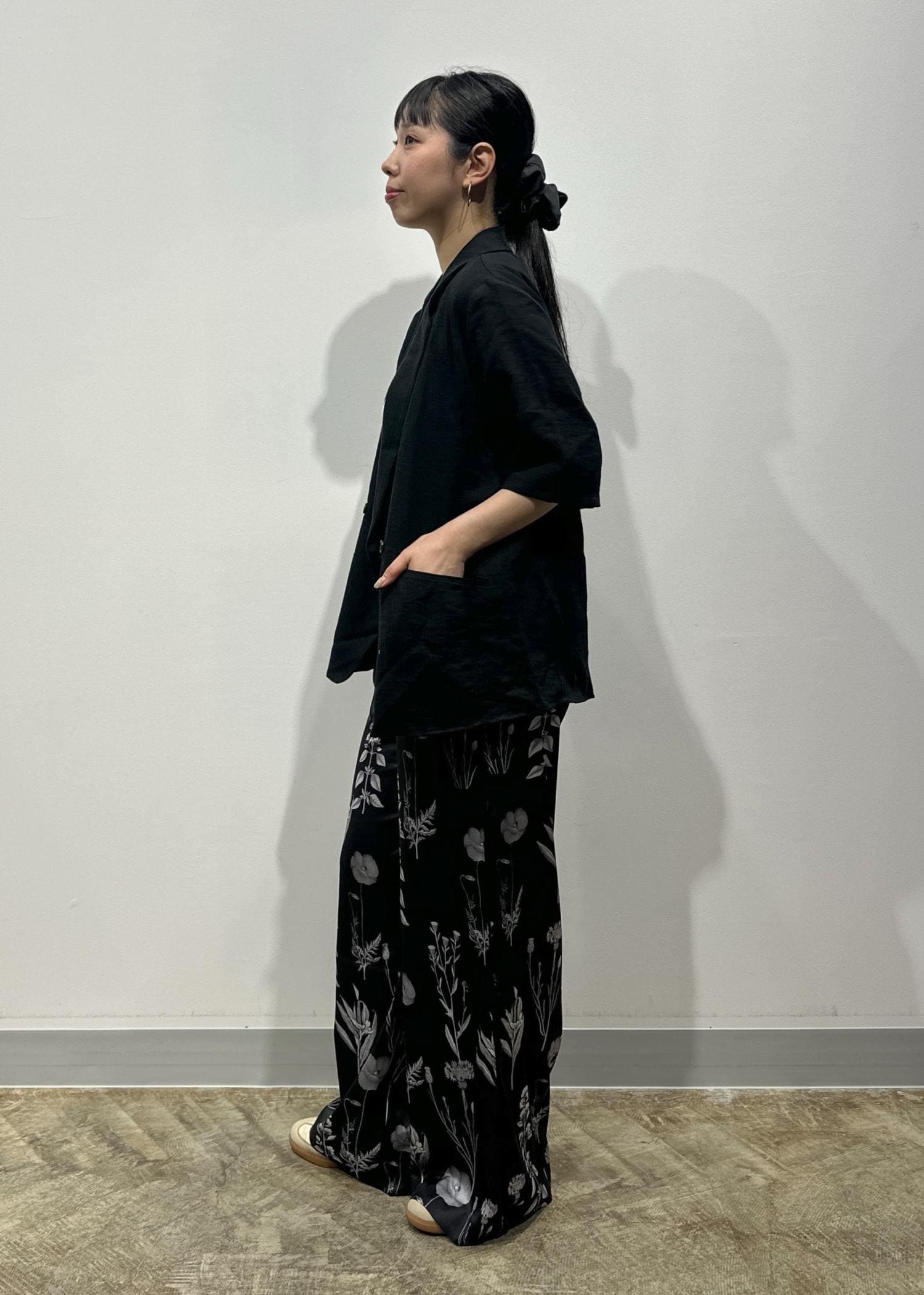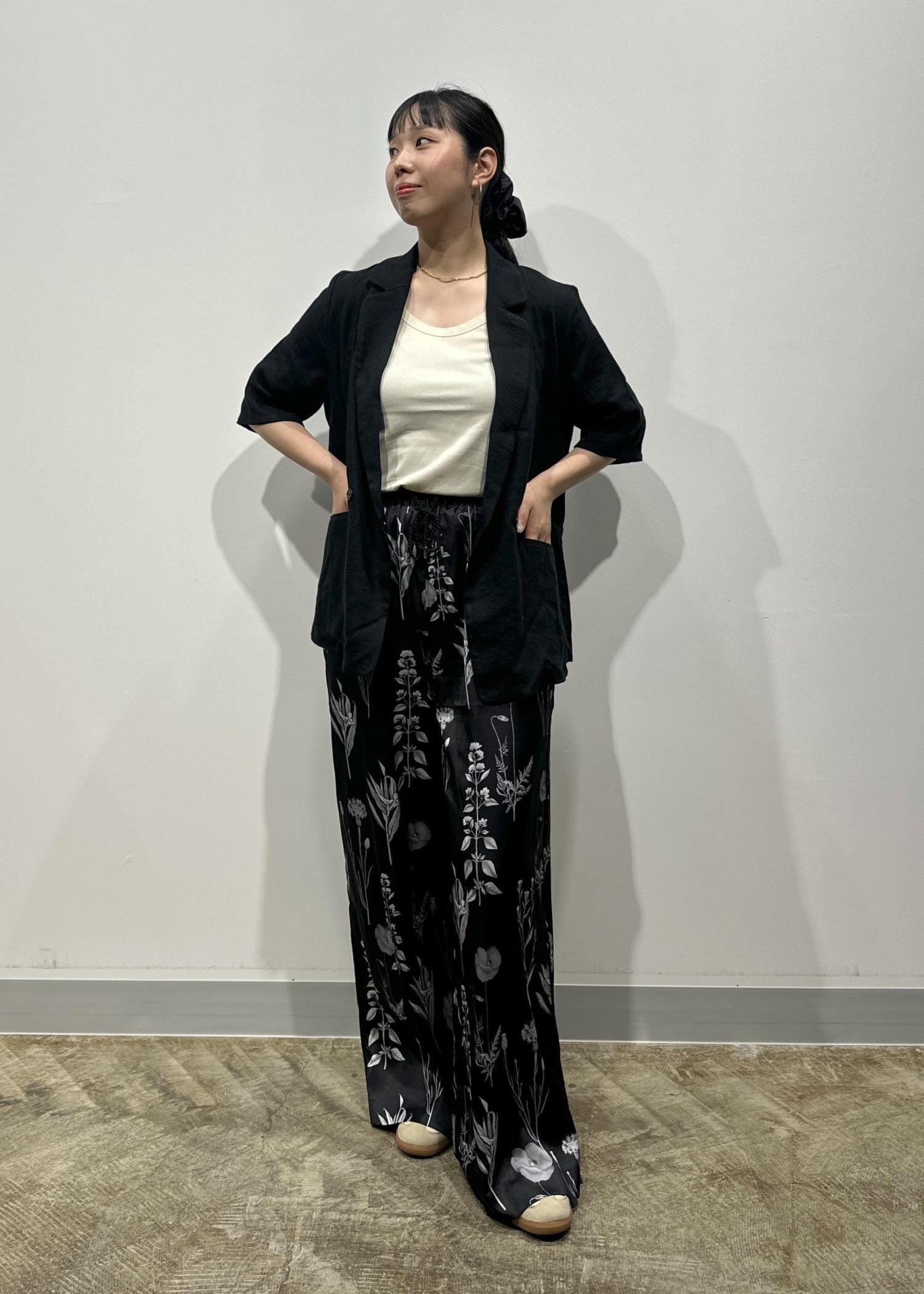 是非ジャケットとフラワーパンツの