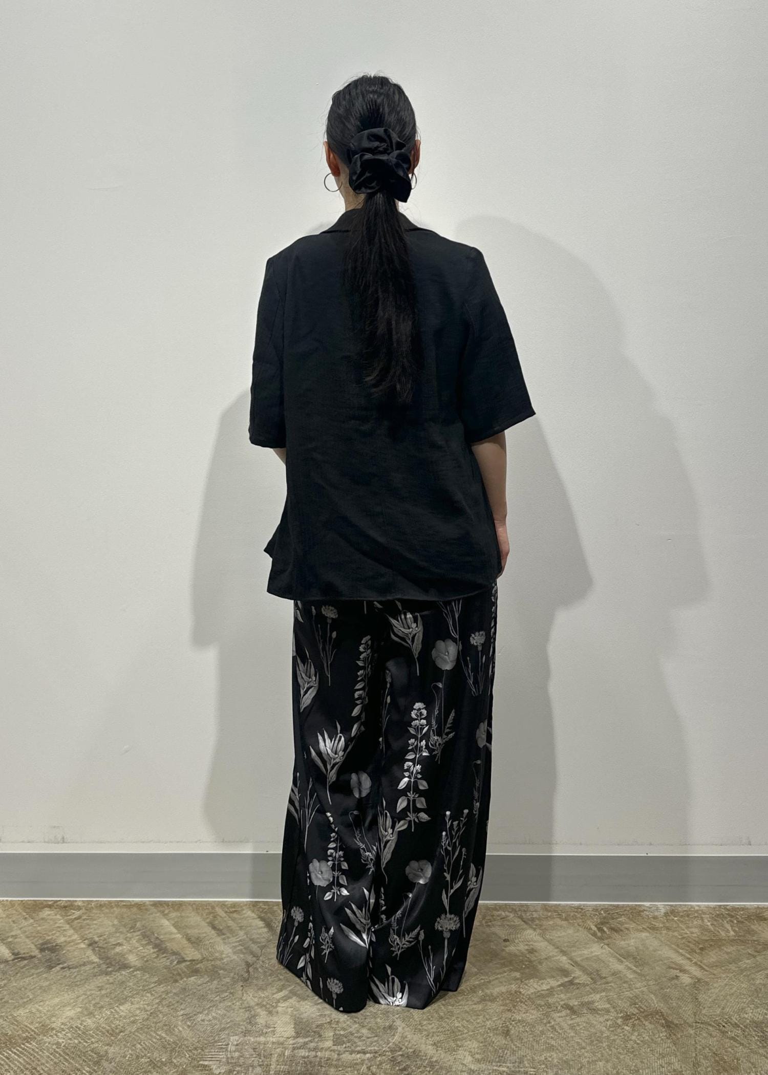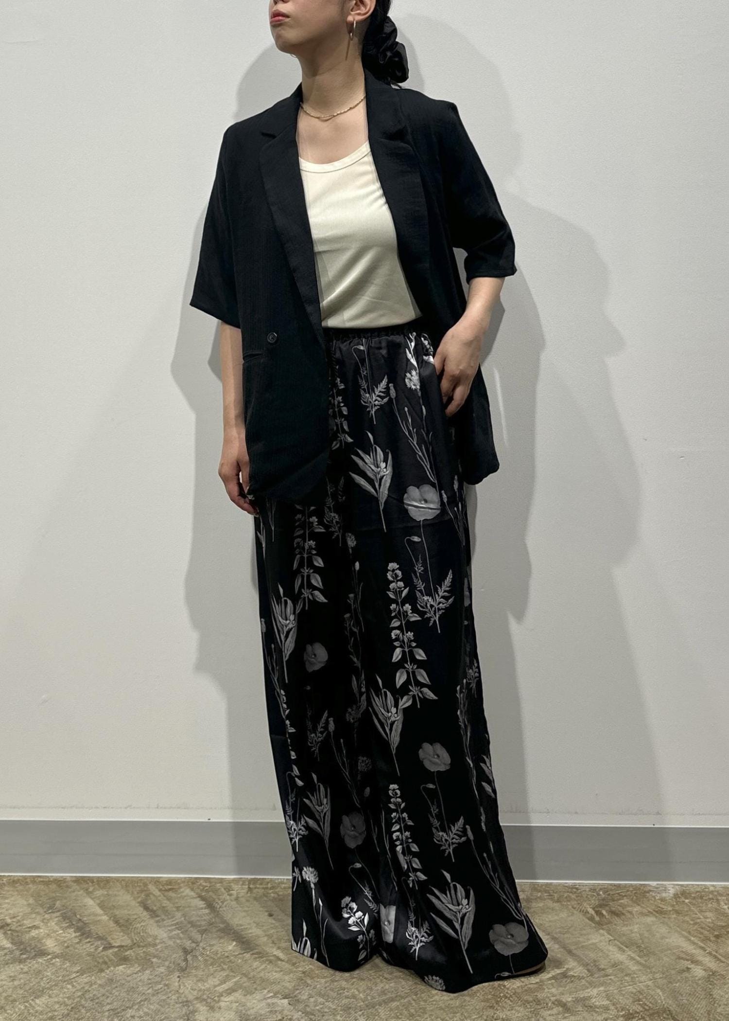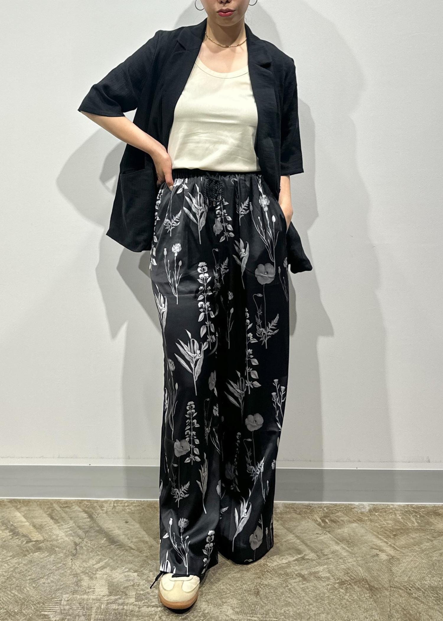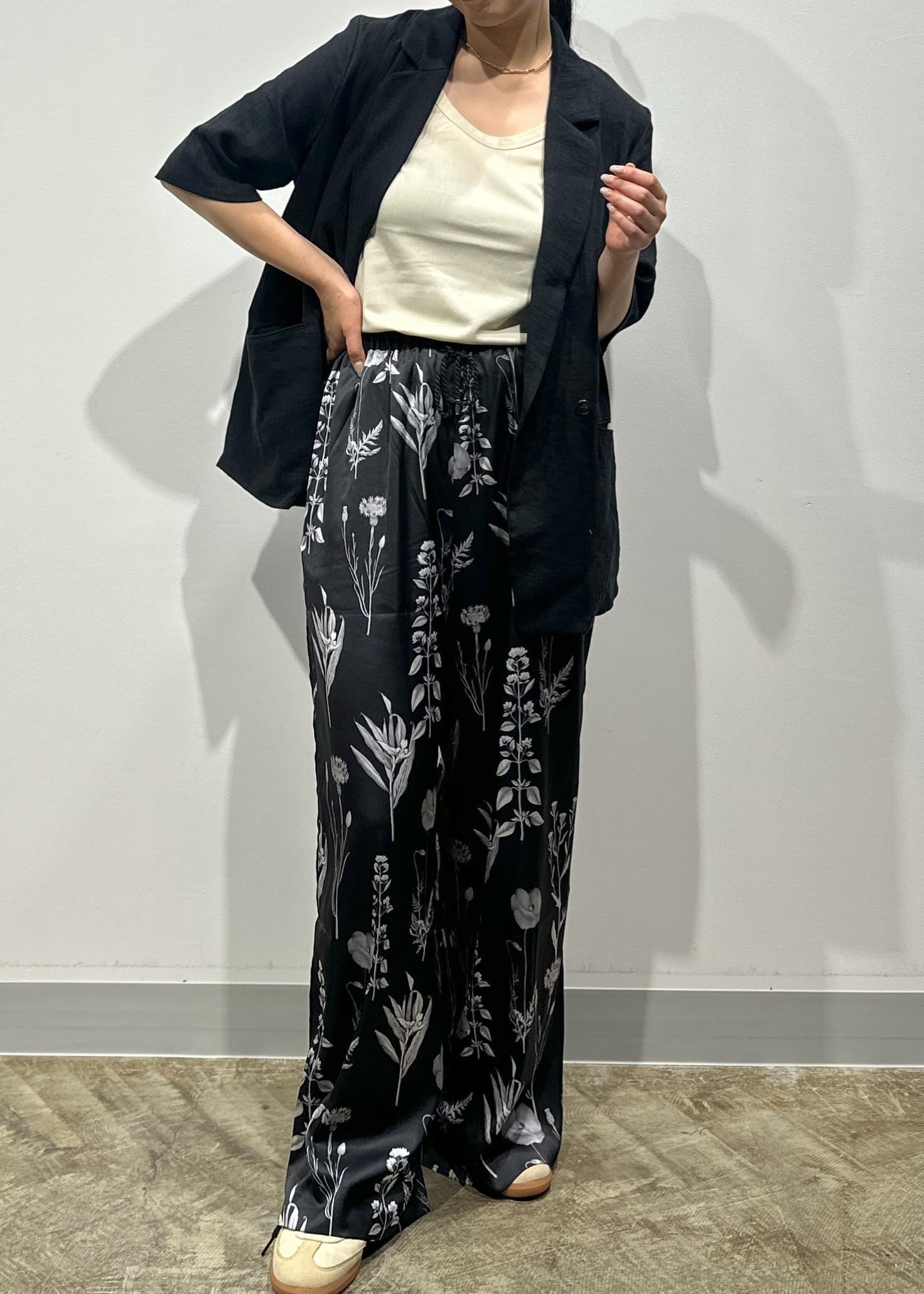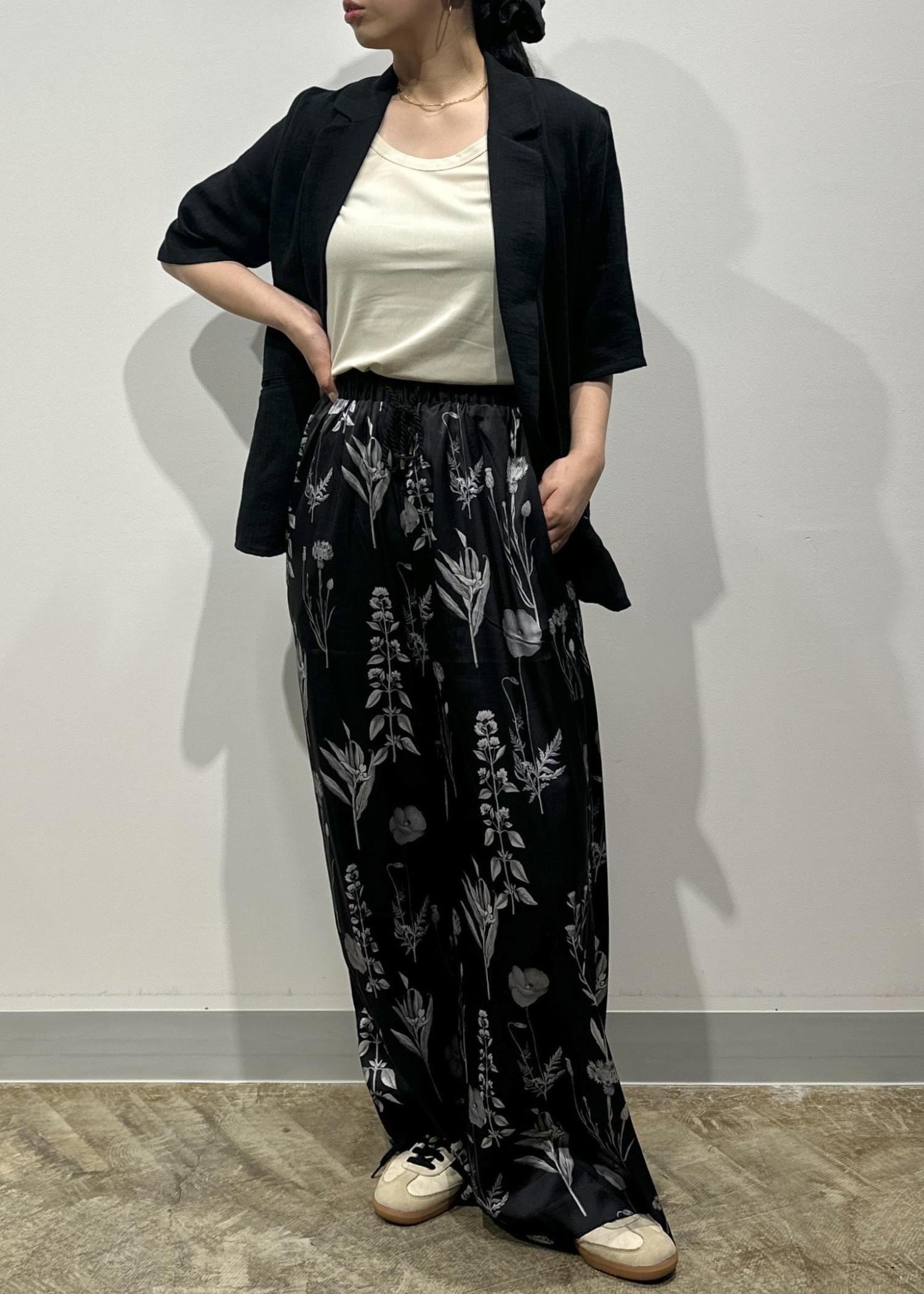 夏の着こなしに映えるボトムのフラワーパンツは