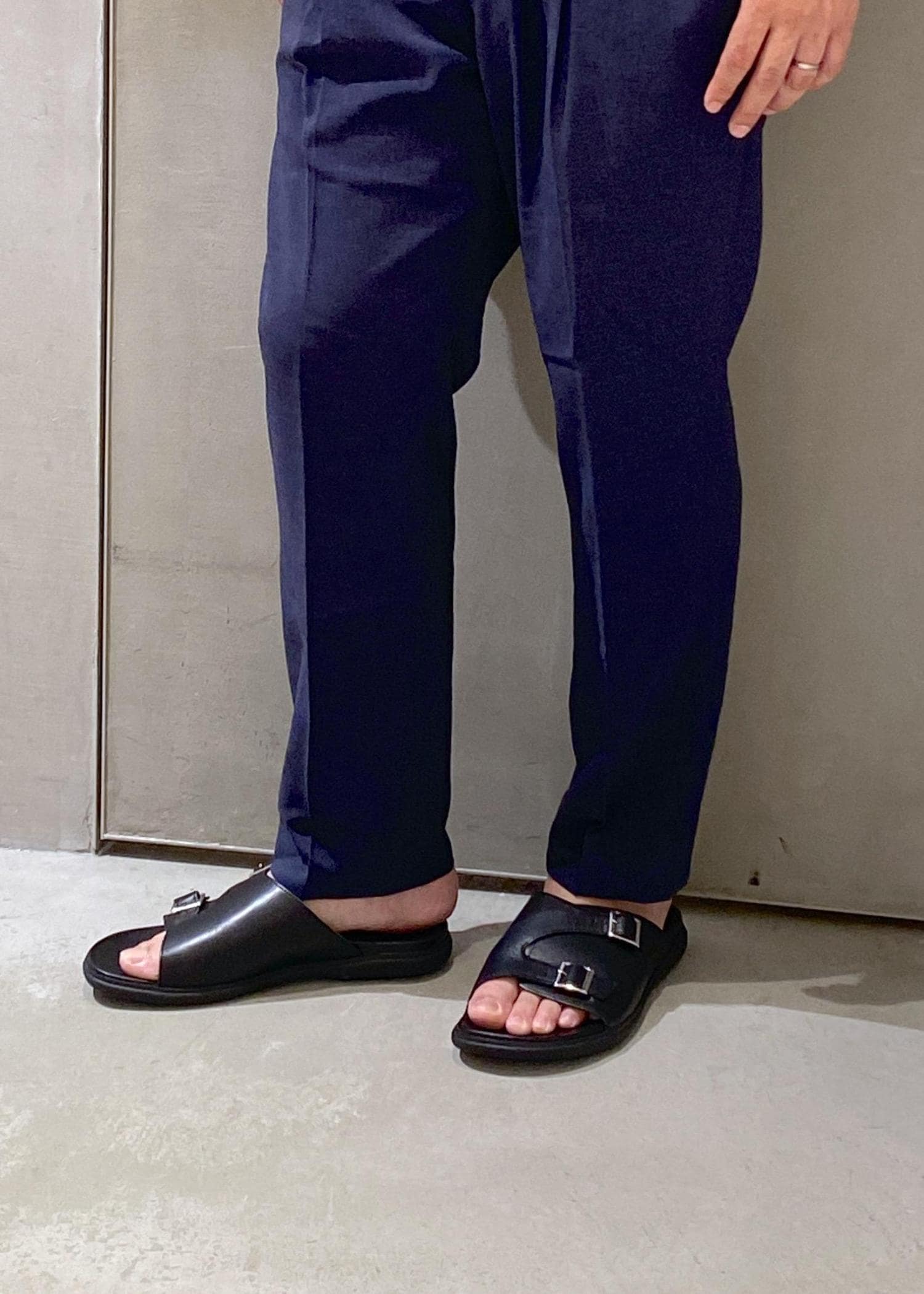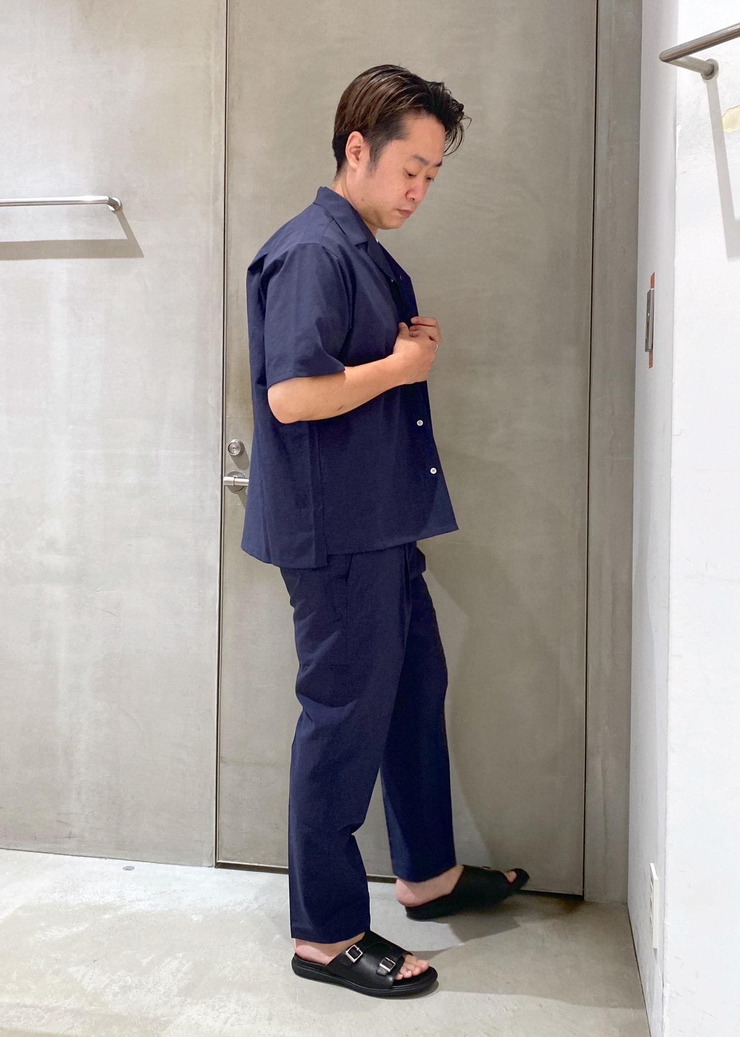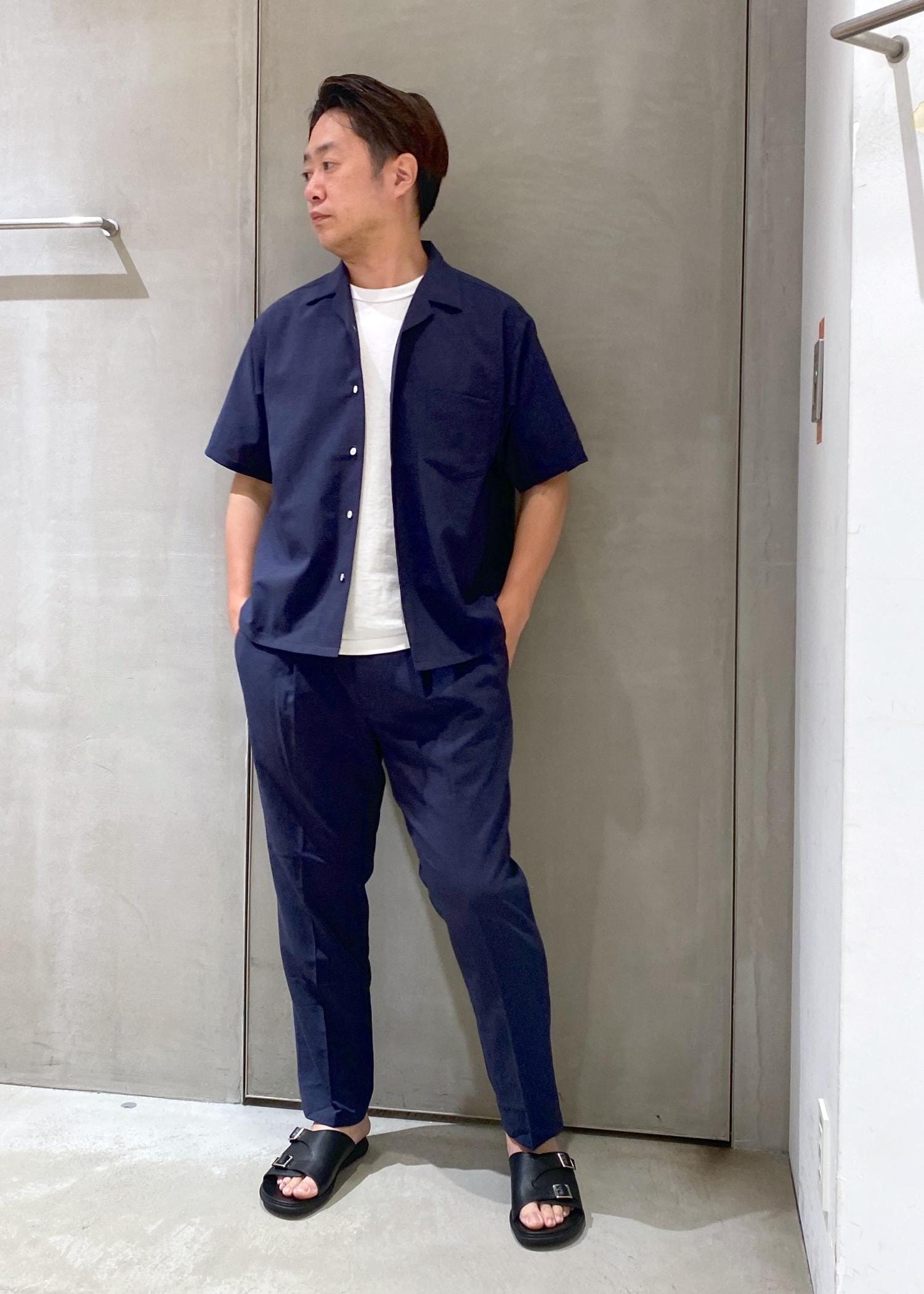 ・夏は涼しく、綺麗めスタイリングがお好きな方、必見です‼️ネイビーのセットアップに、白Tシャツとサンダルで涼しくコーデしてみました。