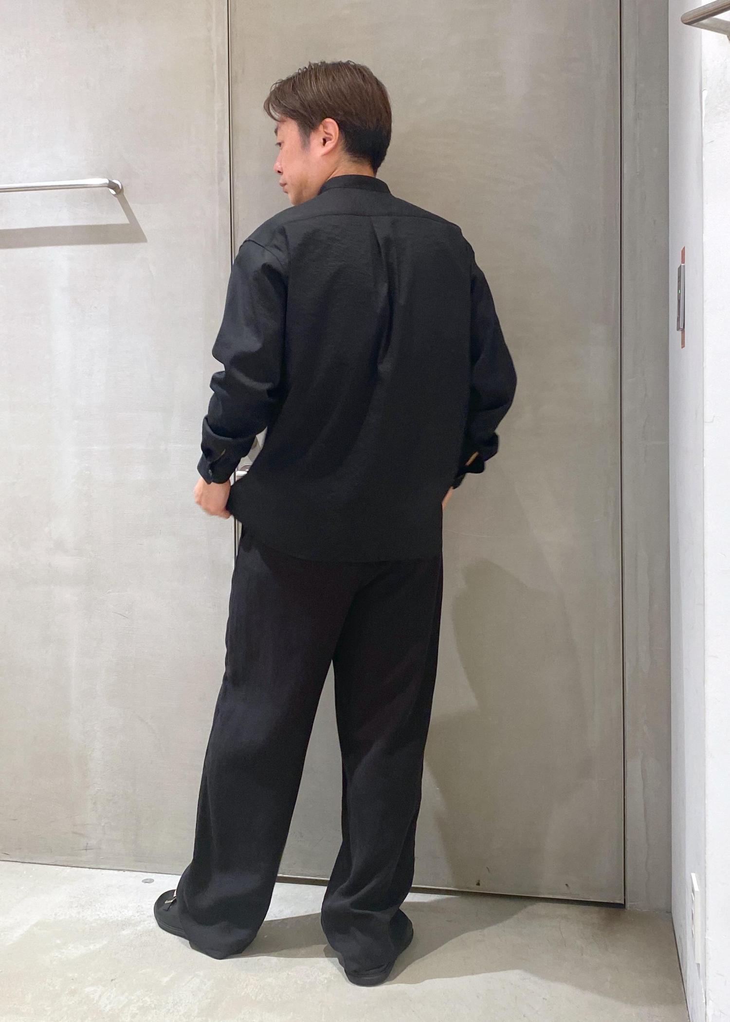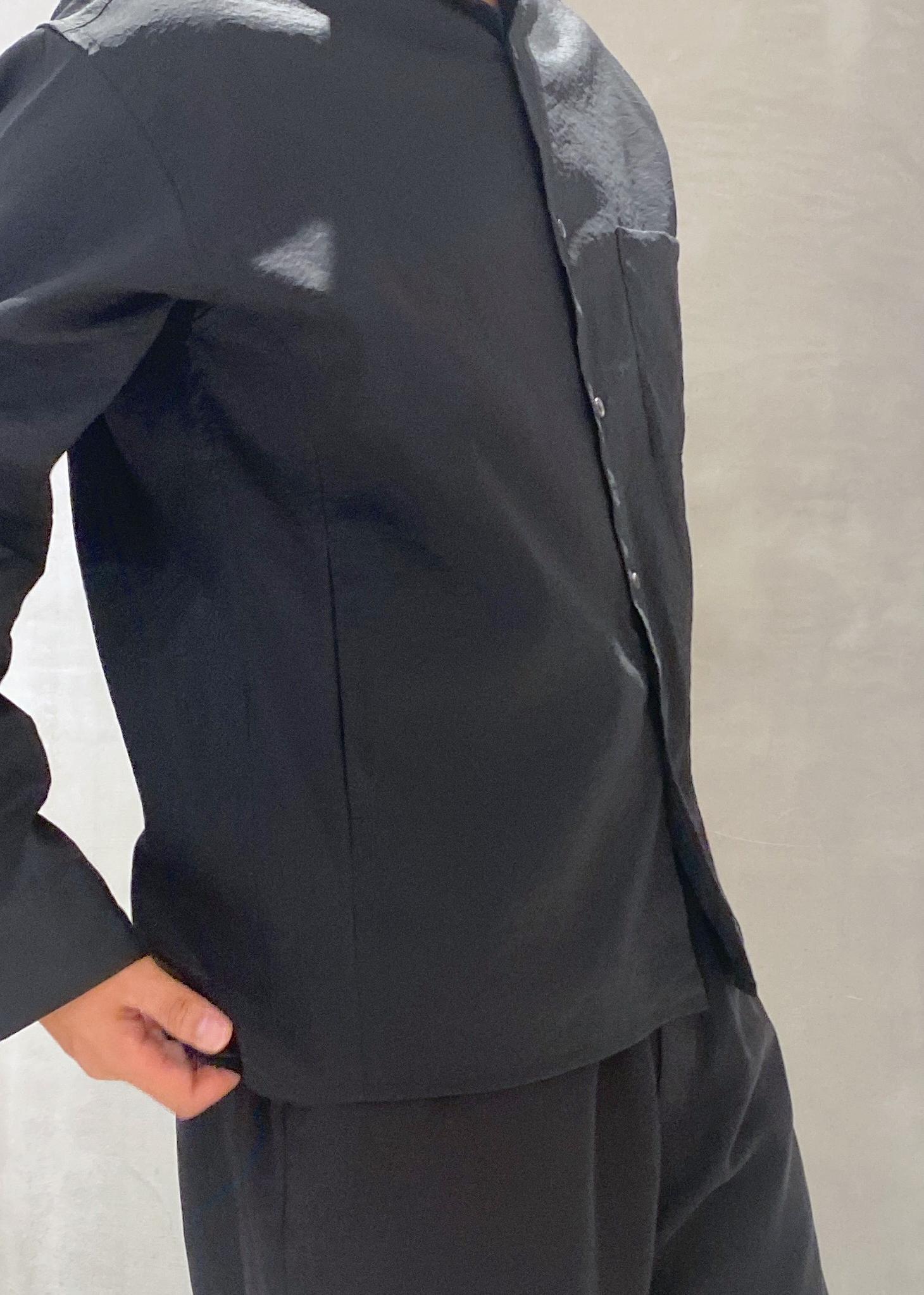 ・ハリと微光沢感があり、カジュアルながらも上品なバンドカラーシャツ。