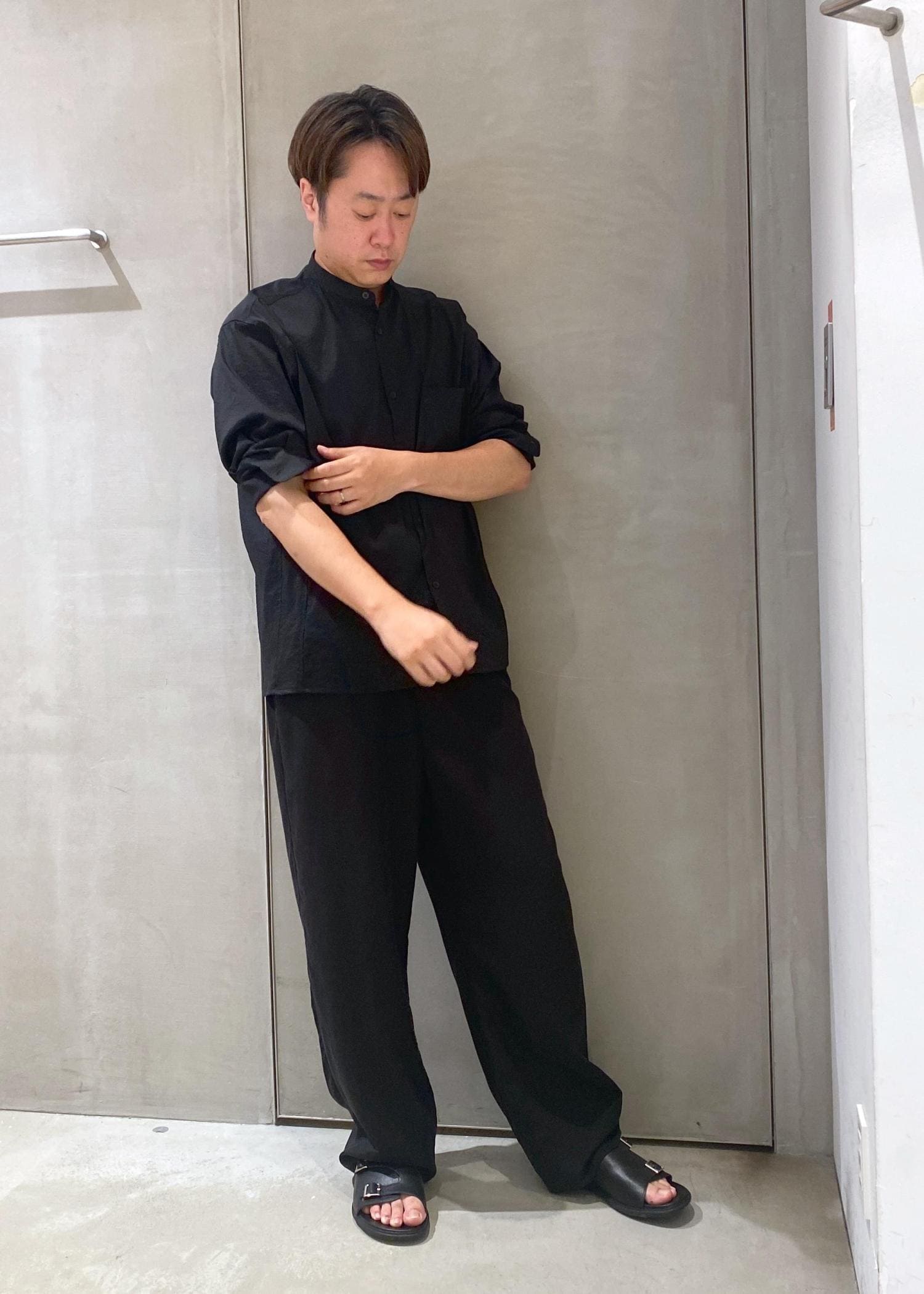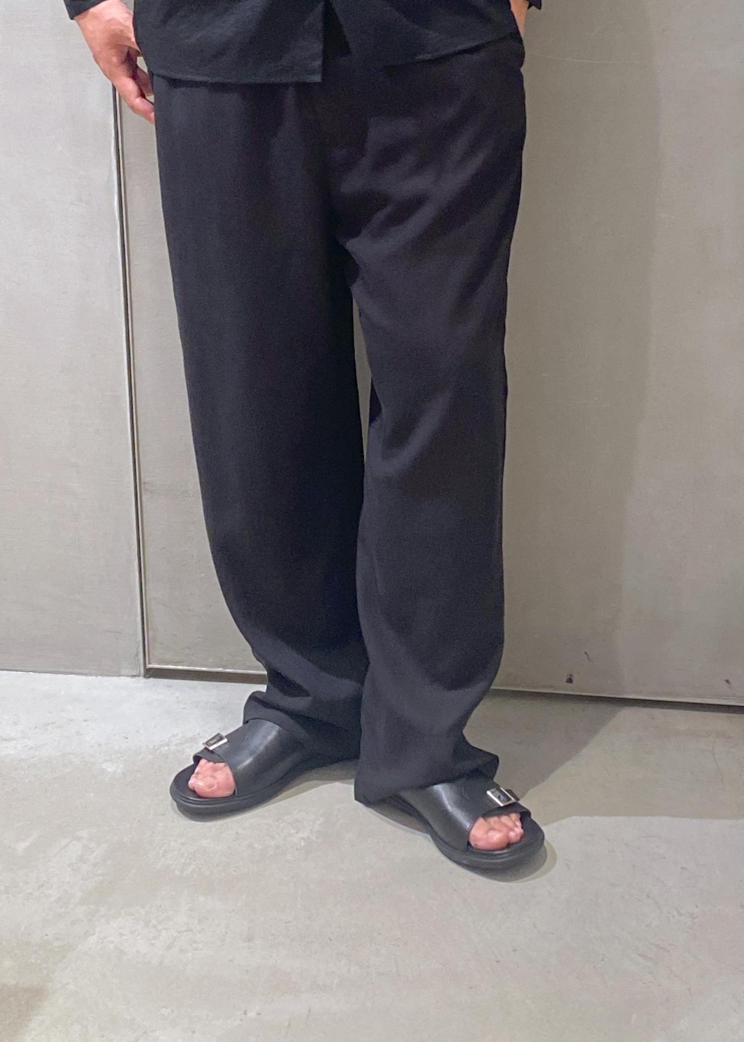 コーデは、通気性がありながらも、だらしなく見えないシルエットのワイドパンツと、レザーサンダルを、オールブラックで。