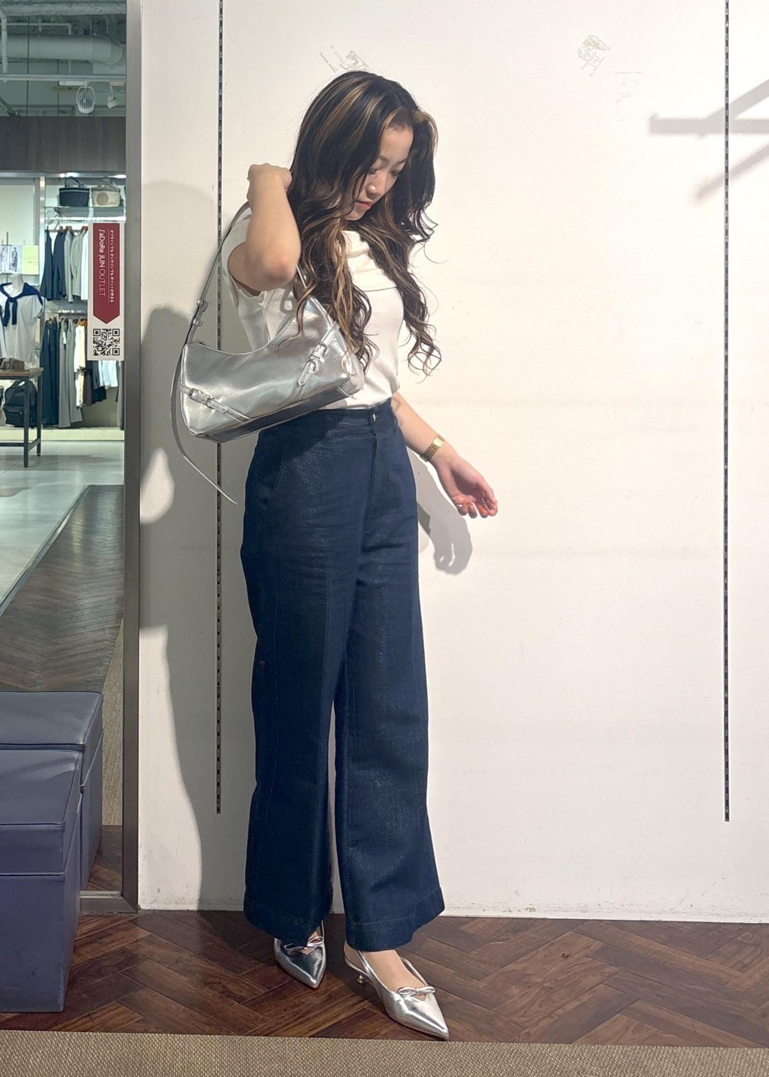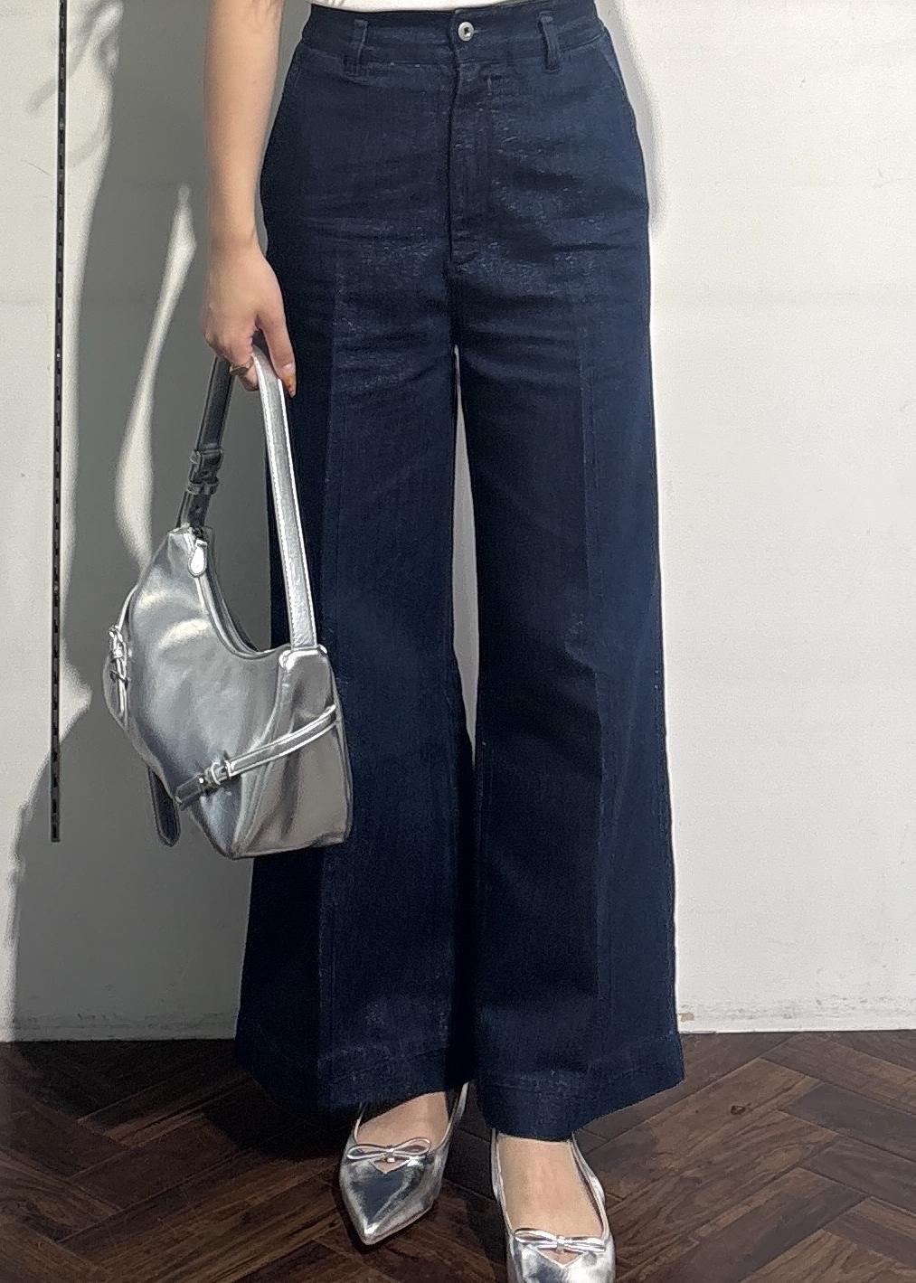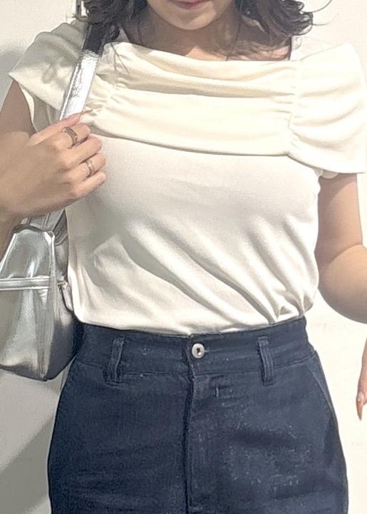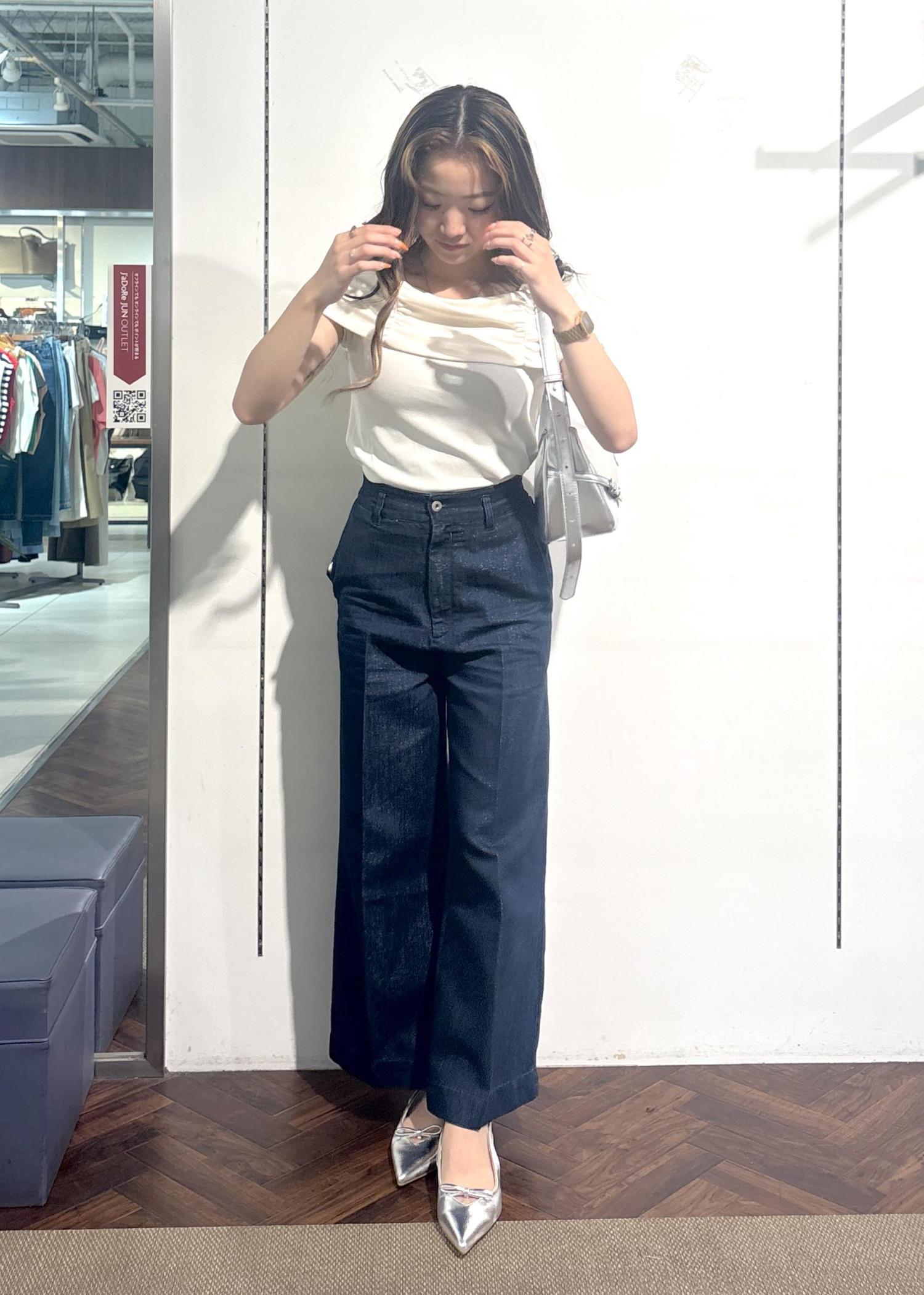 コンパクトで華奢見えこれ一枚で女性らしいスタイリングが完成するトップスにキラっと光る素材が特徴のワイドシルエットデニムを合わせて周りの人からたくさん褒められる事間違いなしのコーデです!
